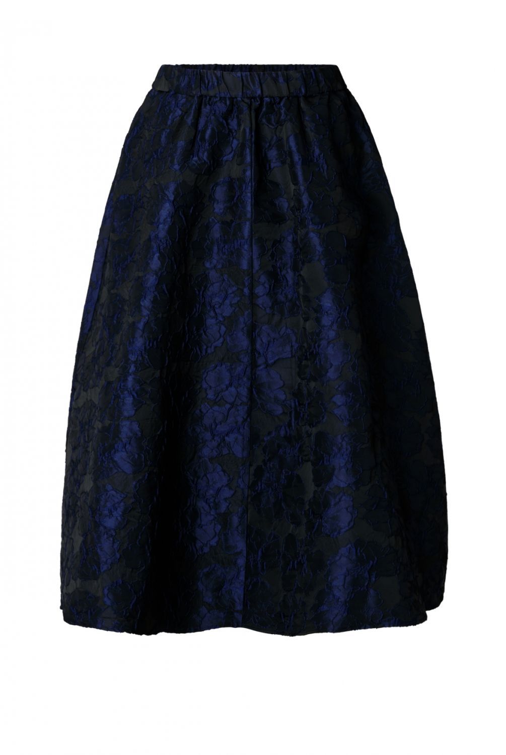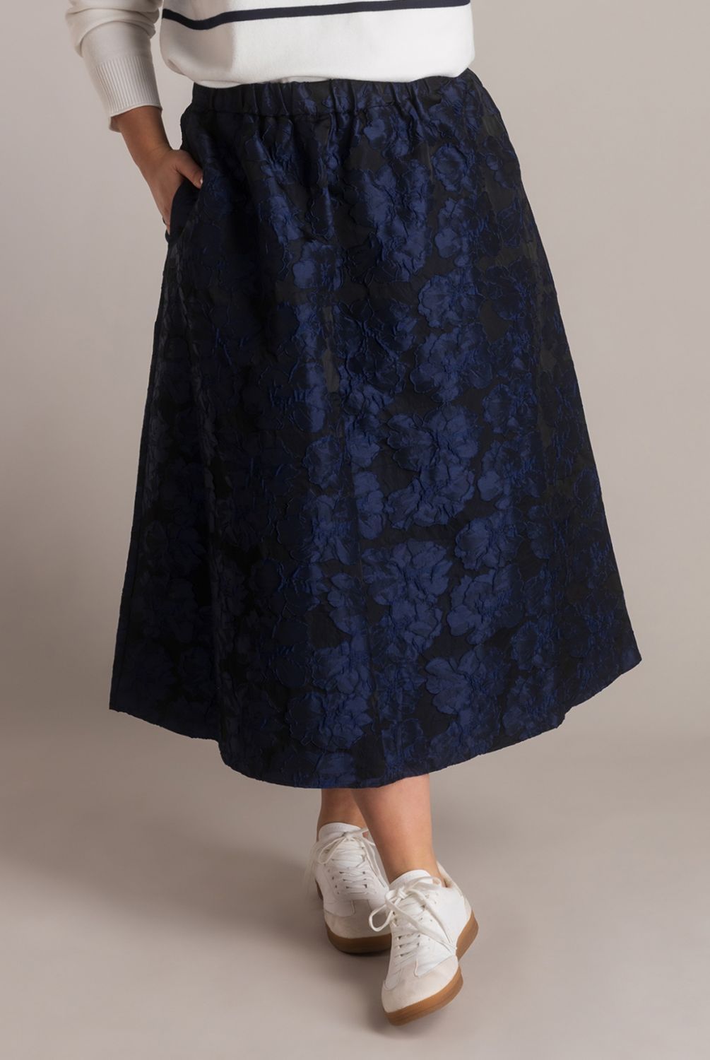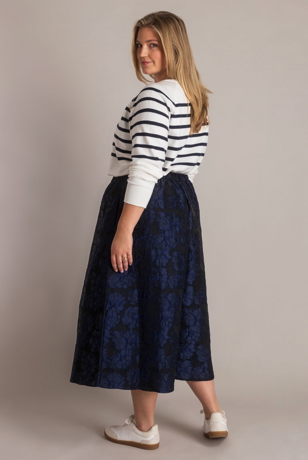 Deze rok is echt een showpiece: het donkerblauwe jacquardpatroon vangt prachtig het licht en de wijde A-lijn geeft ’m een heerlijke swing. De elastische tailleband zit supercomfortabel. Perfect met een simpele trui en sneakers—of juist chic gestyled voor een avond uit.