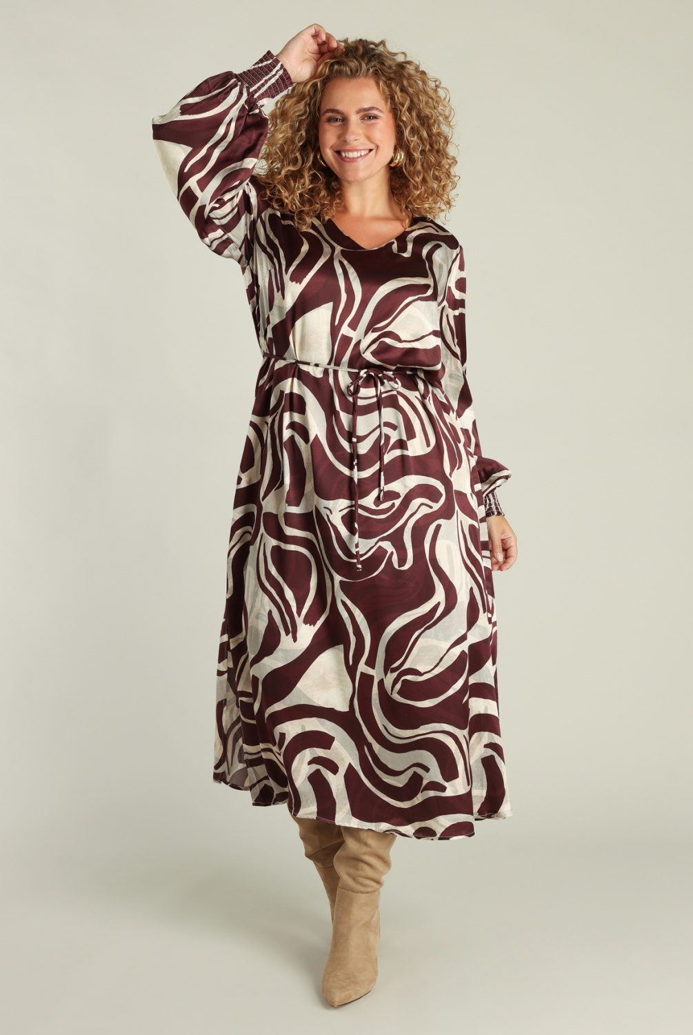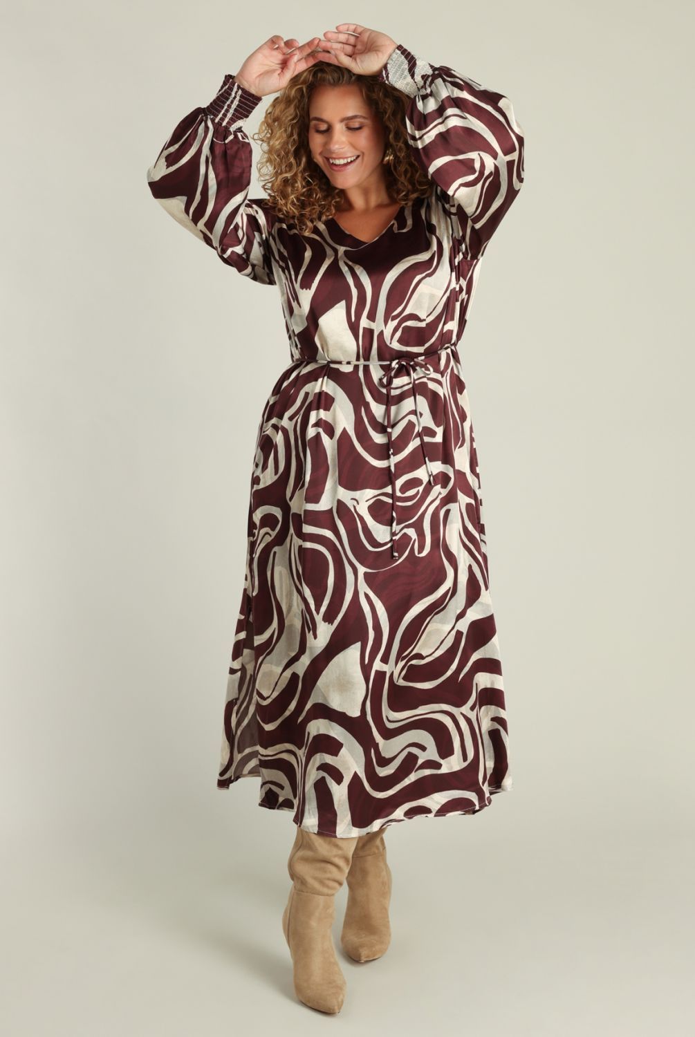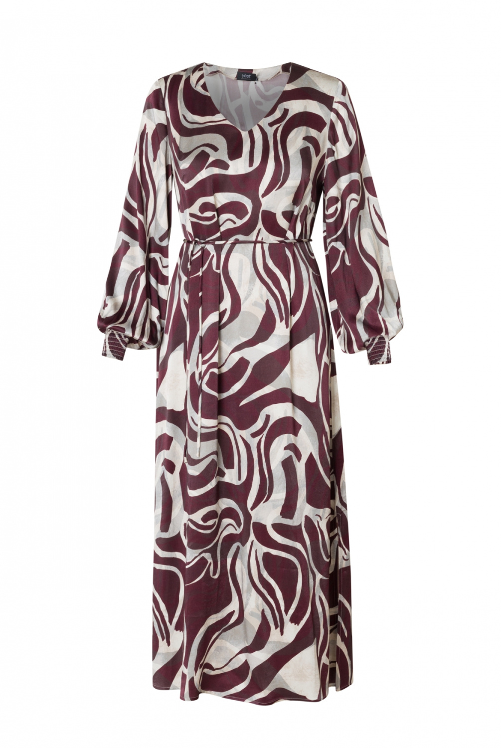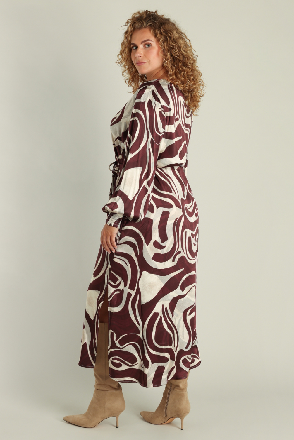 Deze jurk is uitgevoerd in een gladde, zachtglanzende stof die soepel langs het lichaam valt. De bordeaux allover print geeft een krachtig karakter. Met V-hals, wijde mouwen met gesmockte manchetten en een strikceintuur om de taille te accentueren. Een vrouwelijke maxi-jurk die comfortabel draagt en stijlvol oogt.
