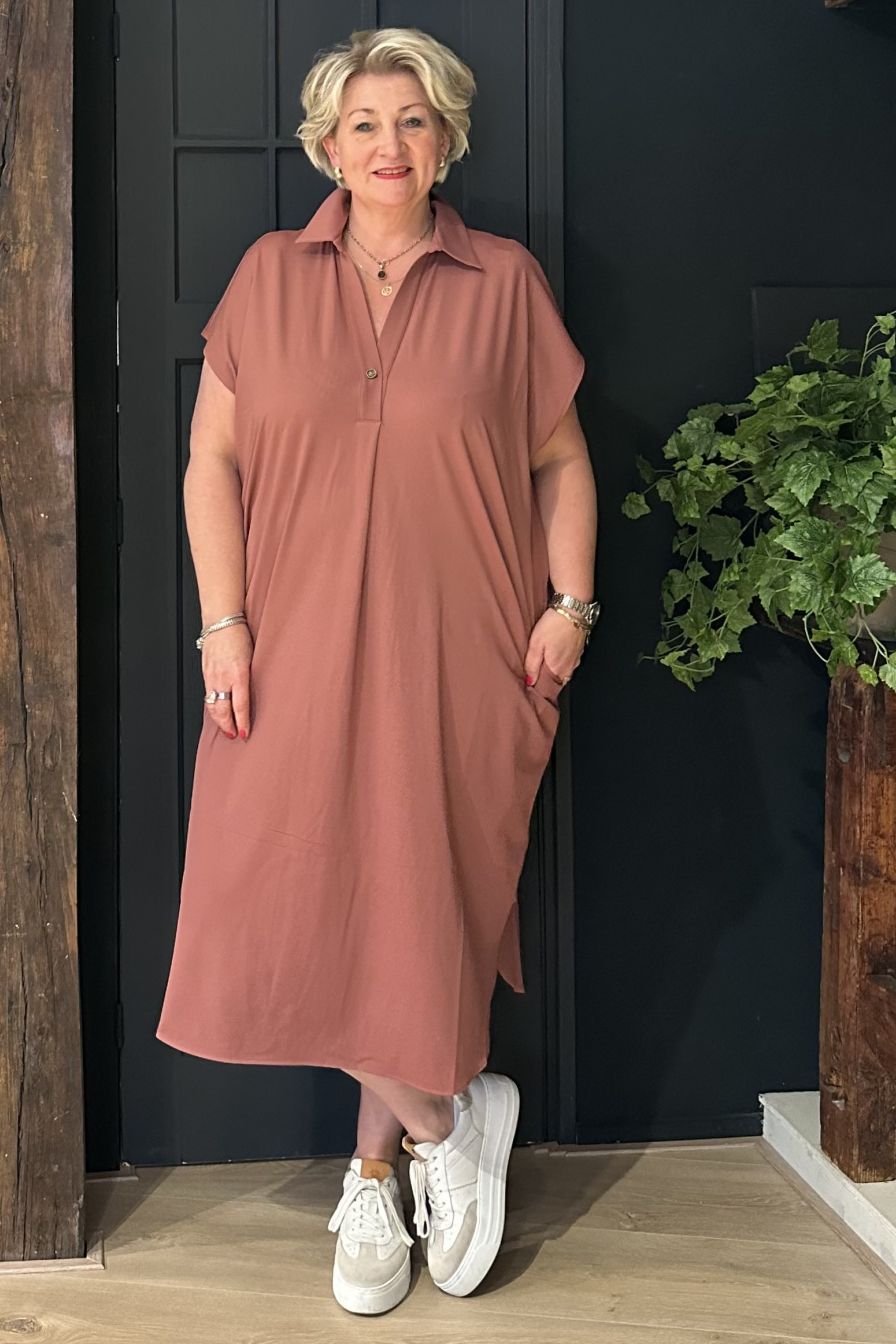 Zo’n jurk waar je direct in wilt leven: soepel, ruim, relaxed en gemaakt van travelkwaliteit die altijd mooi blijft. De losse fit geeft een heerlijk chill gevoel, terwijl de kraag en kleine knoop de look net wat extra geven. In twee tinten: Botanic Green en Plum.
