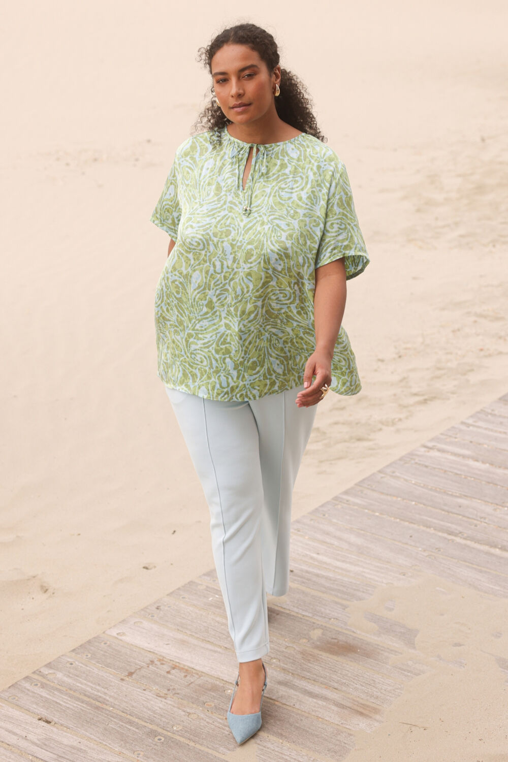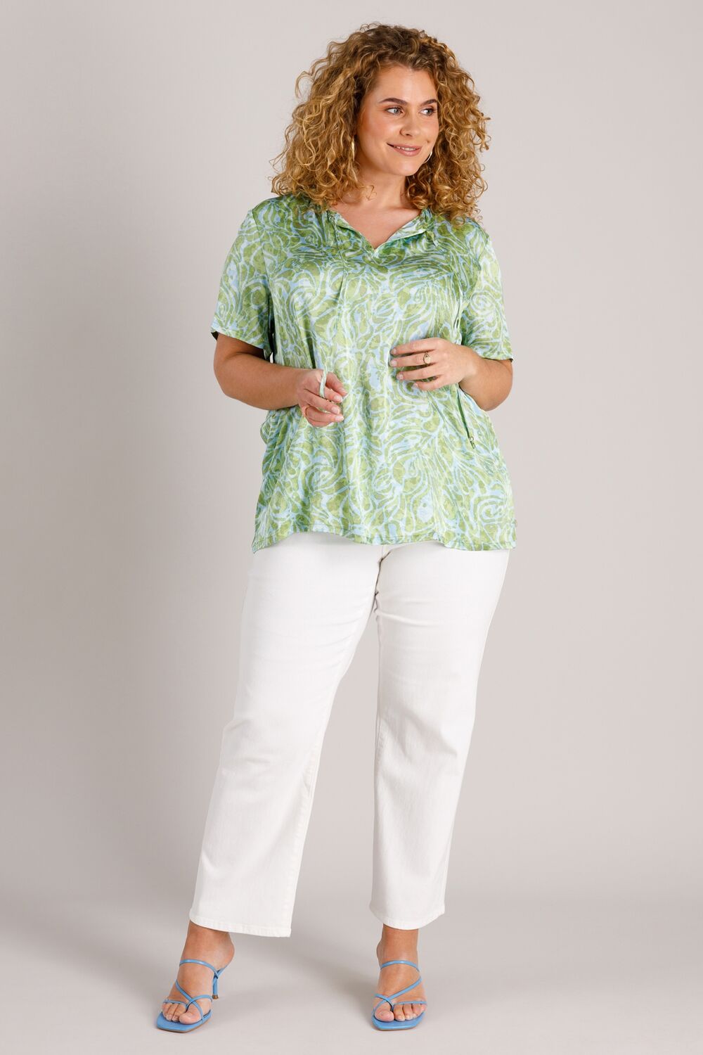Deze blouse voelt meteen zomers: dun, zacht en heerlijk luchtig. De Botanic Green print geeft een frisse uitstraling, terwijl de V-hals met koordjes het model een nonchalante twist geeft. Een fijne, easy-going top die je zo over een jeans, short of linnen broek aantrekt.