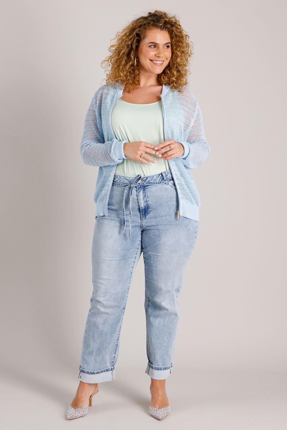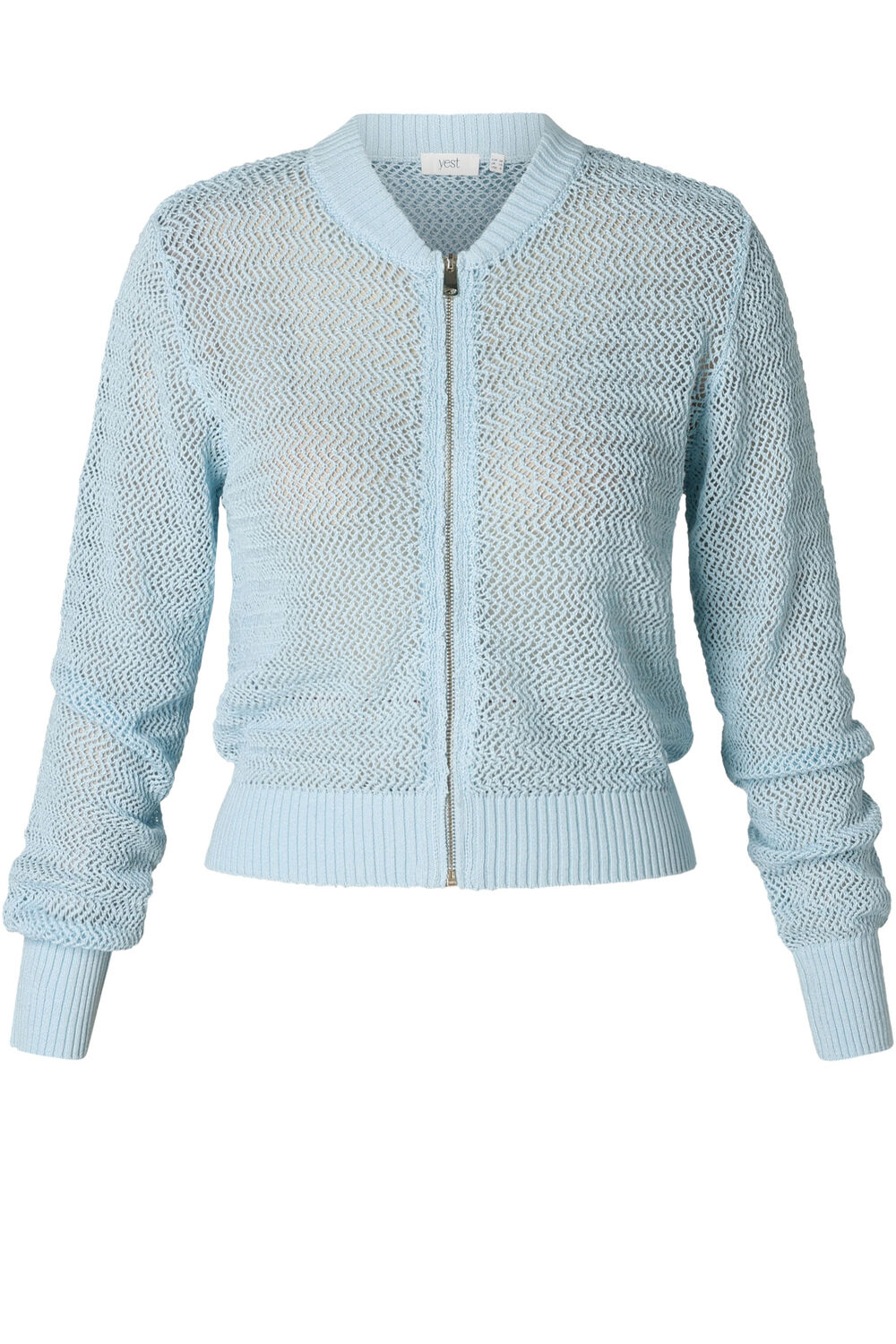 Liva is een opengebreid vestje van katoen-nylon dat luchtig en prettig draagt. Het model heeft een ritssluiting, ribboorden en een subtiel patroon dat mooi doorloopt over de mouwen. Ideaal om over een top te dragen op warmere dagen.