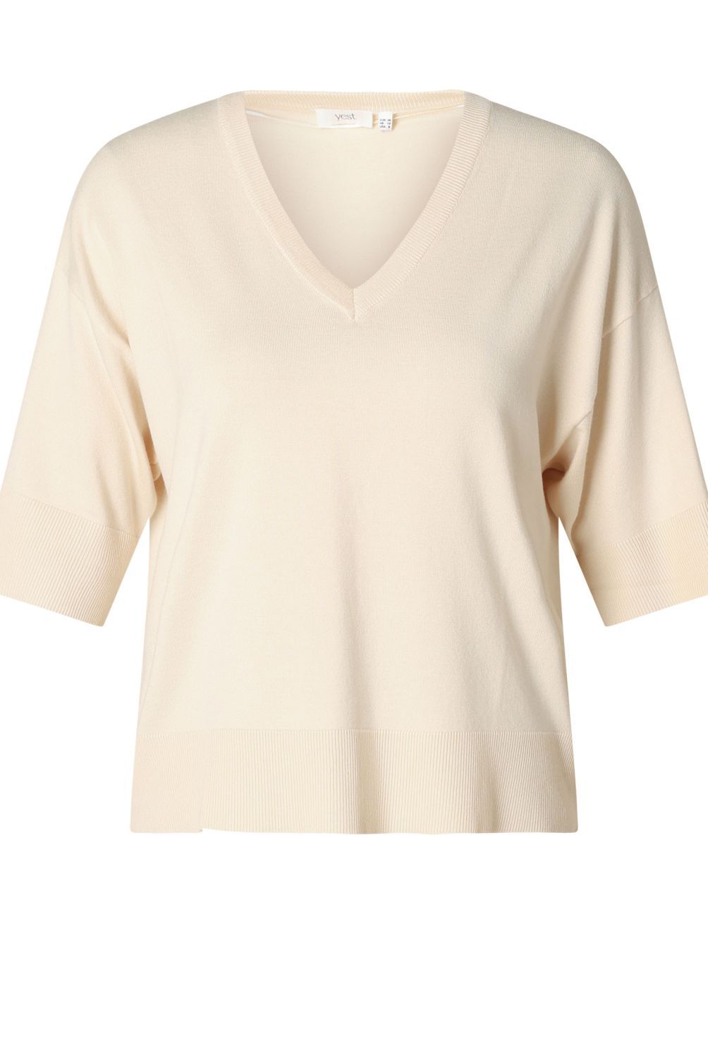 Met zijn fijne structuurbreisel, V-hals en halflange mouwen is deze trui een ideale keuze voor warmere dagen. Het model is uitgevoerd in een comfortabele fit en bestaat uit 81% viscose en 19% nylon, waardoor hij zacht aanvoelt en prettig draagt. Verkrijgbaar in 4 kleuren; Naturel, Pale Blue, Botanic Green en Plum.