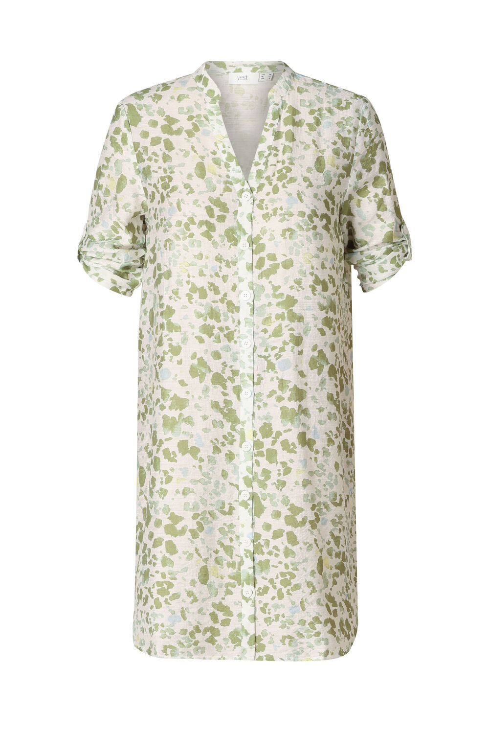 Deze zomerse jurk Luisa heeft een luchtige regular fit en is gemaakt van een comfortabele viscose-polyamide mix. De pastelgroene print zorgt voor een frisse uitstraling. De korte mouwen hebben een handige oprolfunctie en het doorknoopmodel maakt de jurk eenvoudig te dragen.