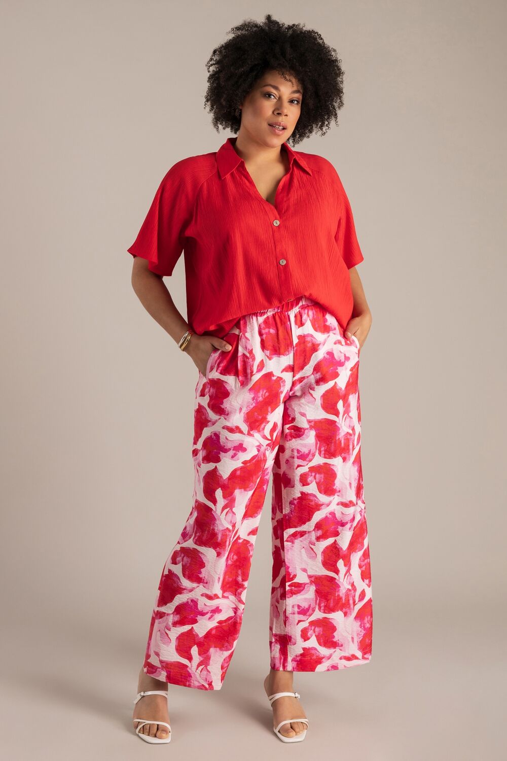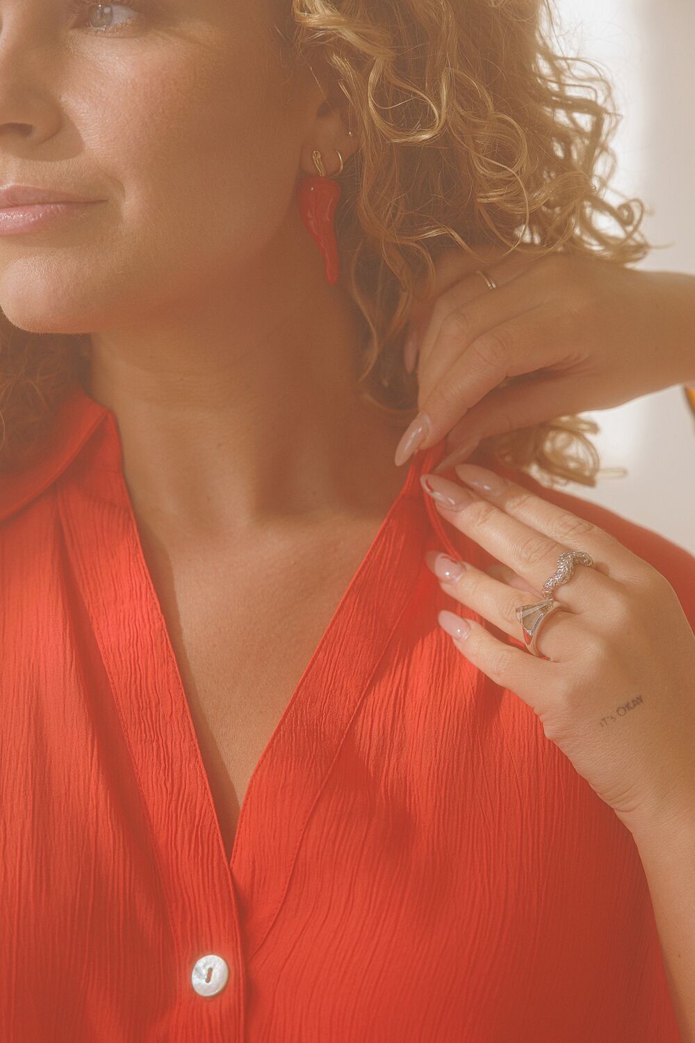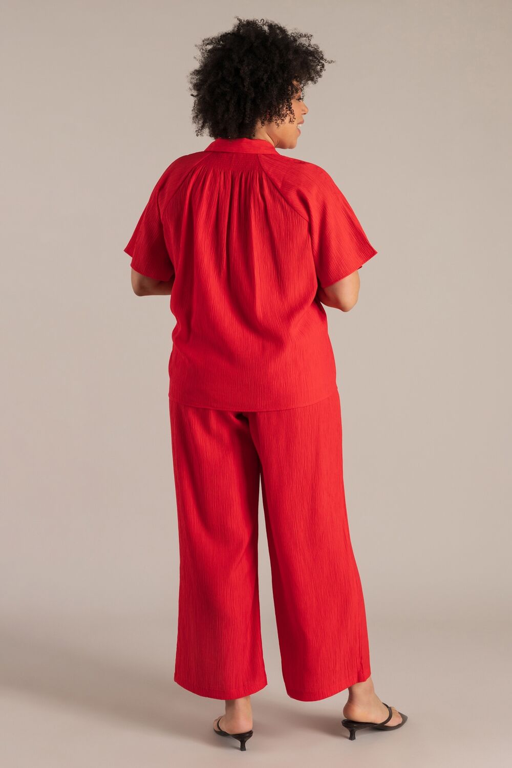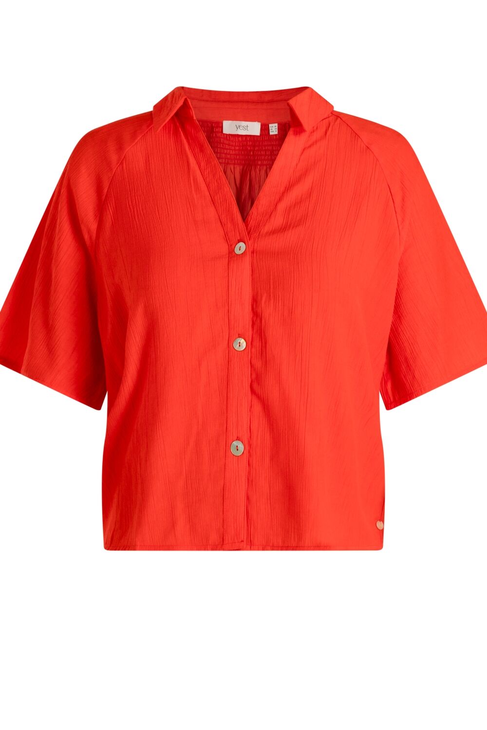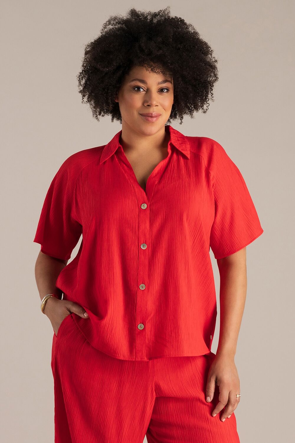 Deze blouse is uitgevoerd in een lichte crinkle stof die luchtig draagt en een subtiele structuur heeft. De effen uitvoering zorgt voor een rustige basis. Voorzien van een kraagje met V-hals en verkrijgbaar in Hot Red en Summer Taupe.