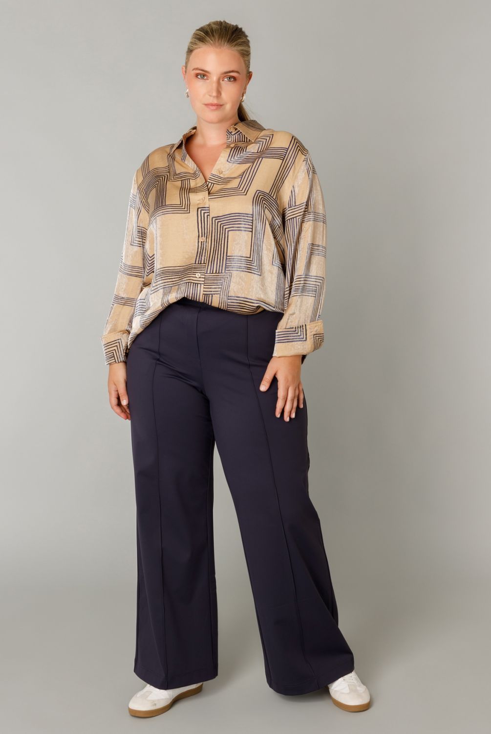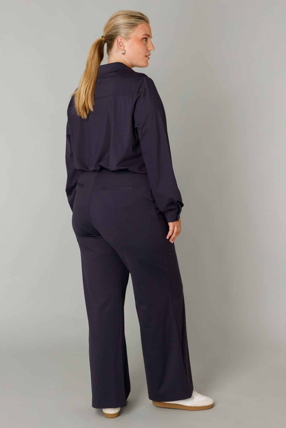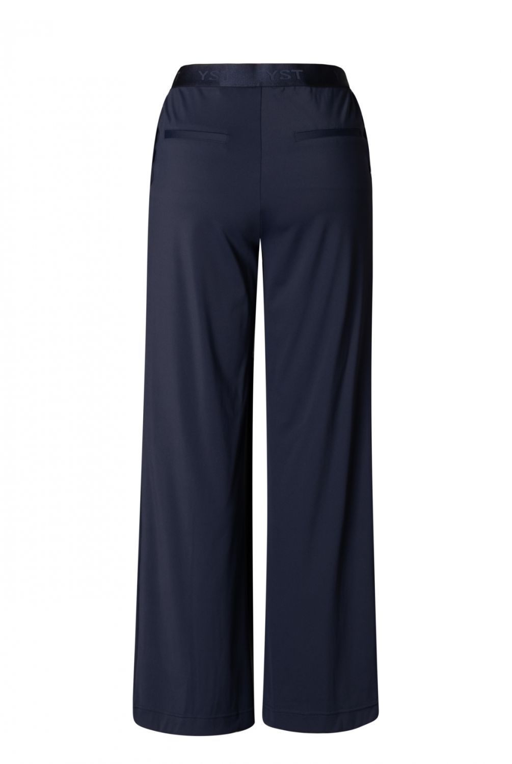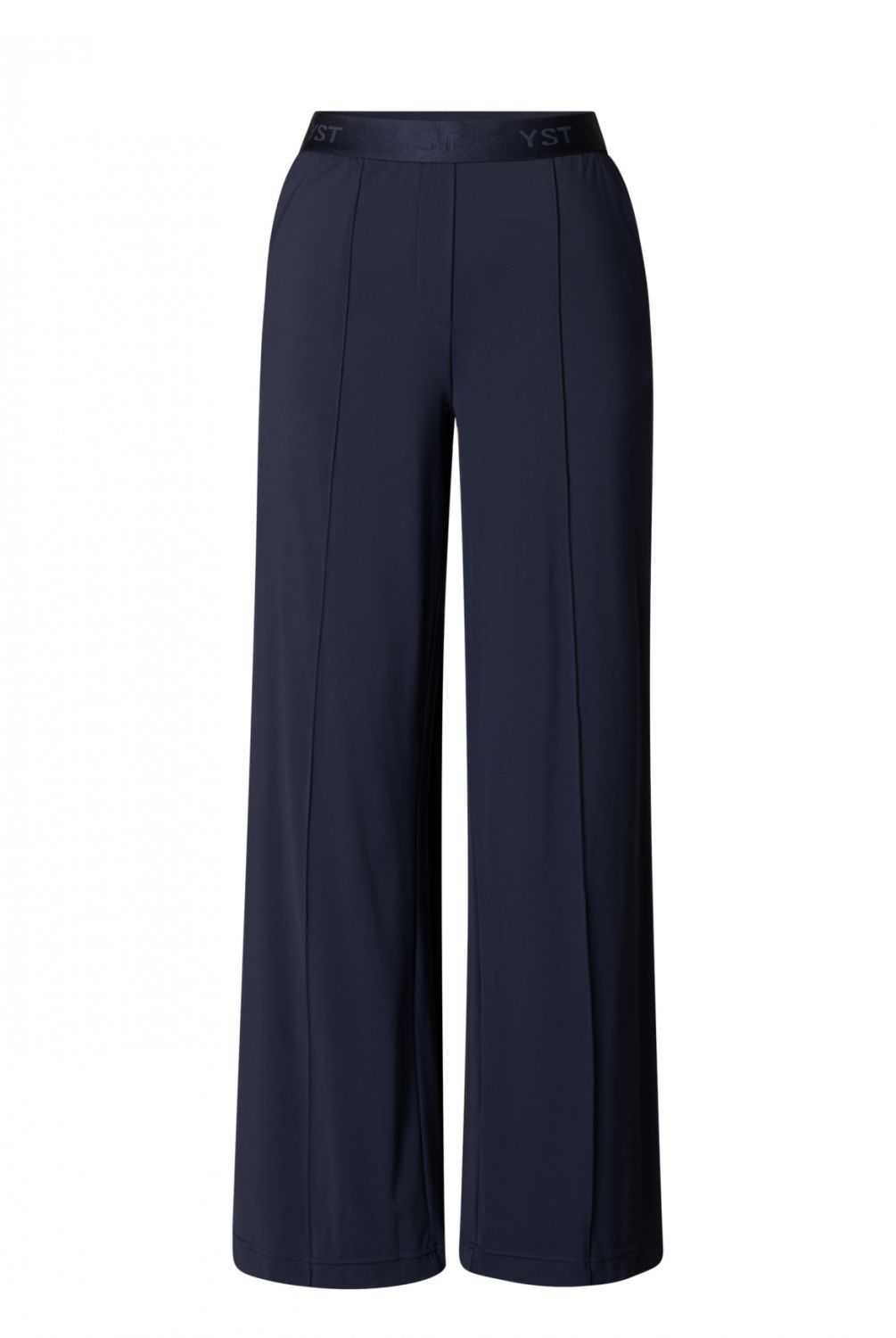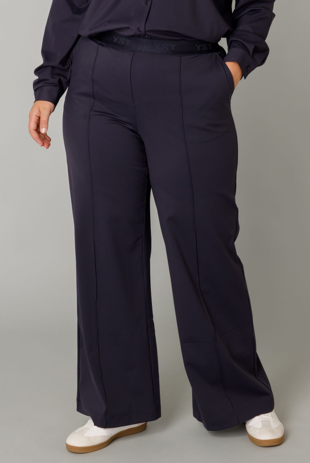 Comfortabel en stijlvol: deze dark navy wijde broek heeft een elastische tailleband, een platte naad over het middenbeen en handige steekzakken. De gladde stof maakt ‘m perfect voor een elegante, relaxte look.