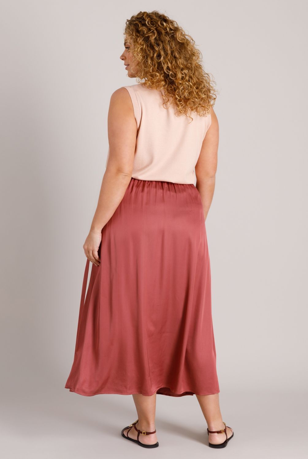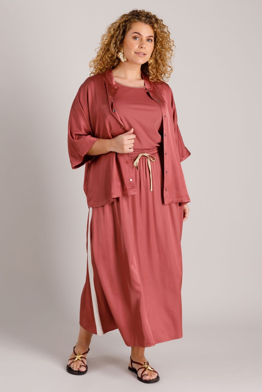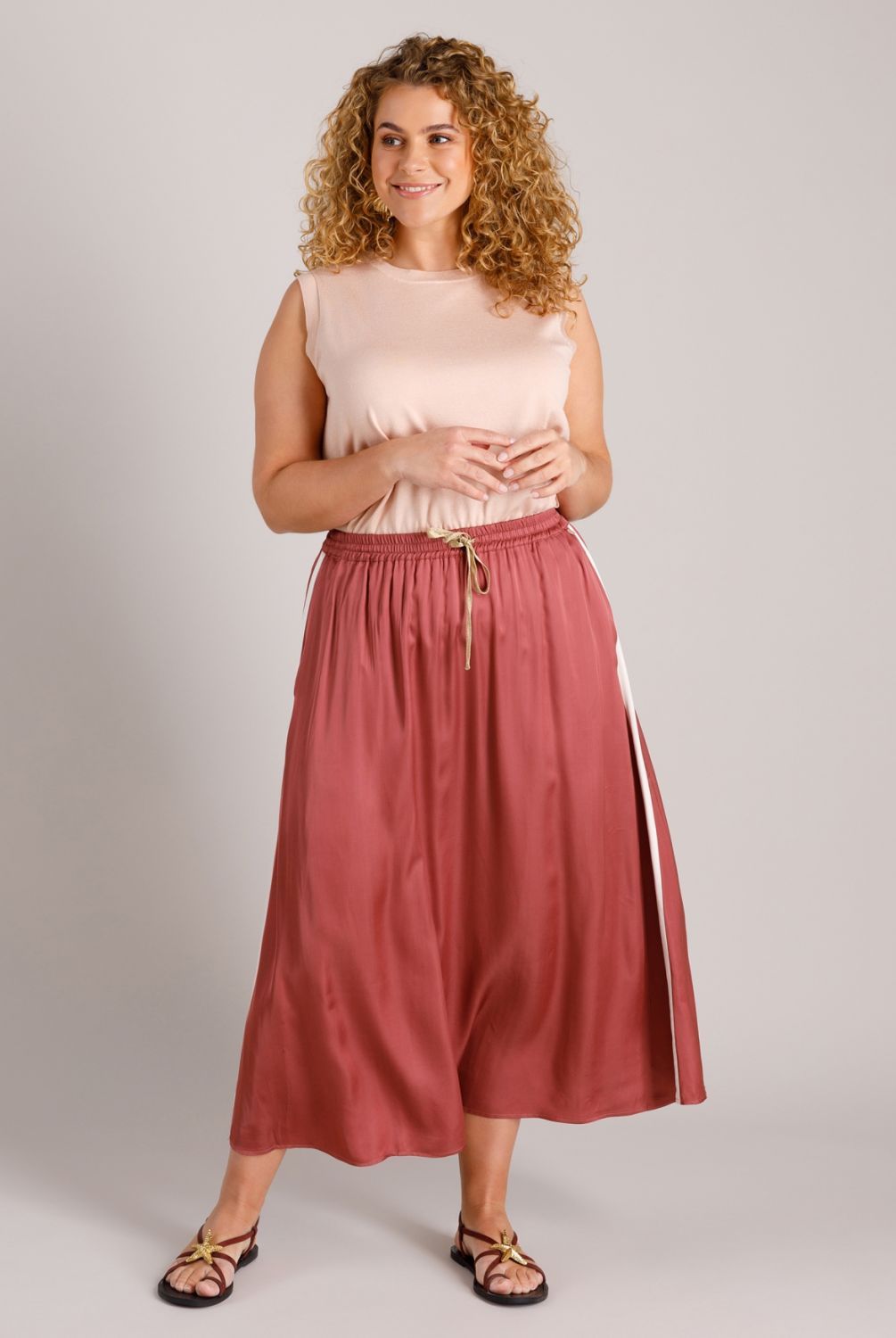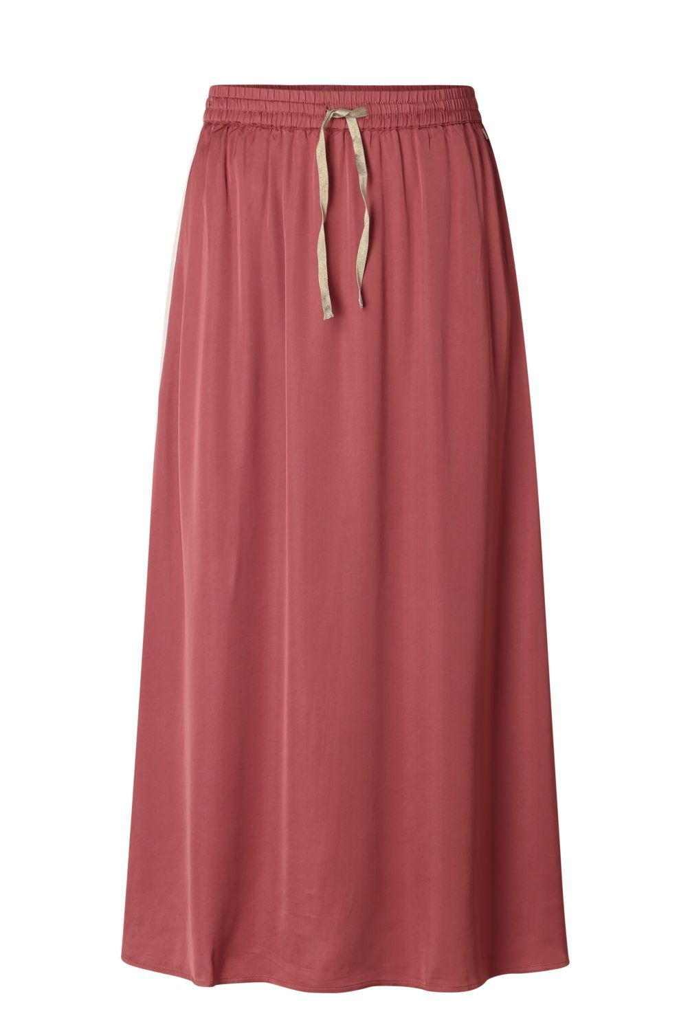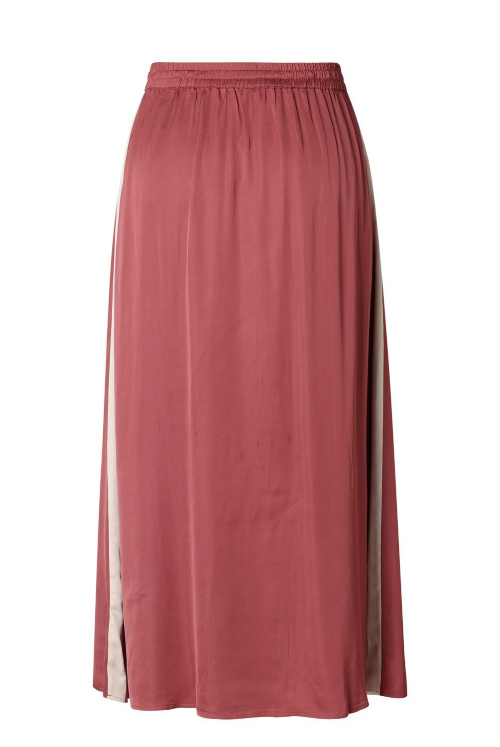 Deze rok is echt een favoriet! De satijnstof voelt zacht en glad aan, en de plumkleur geeft hem een chique, maar toch ontspannen look. De contrasterende zijstreep maakt hem net wat sportiever, en door het elastiek in de taille zit hij heerlijk comfortabel.