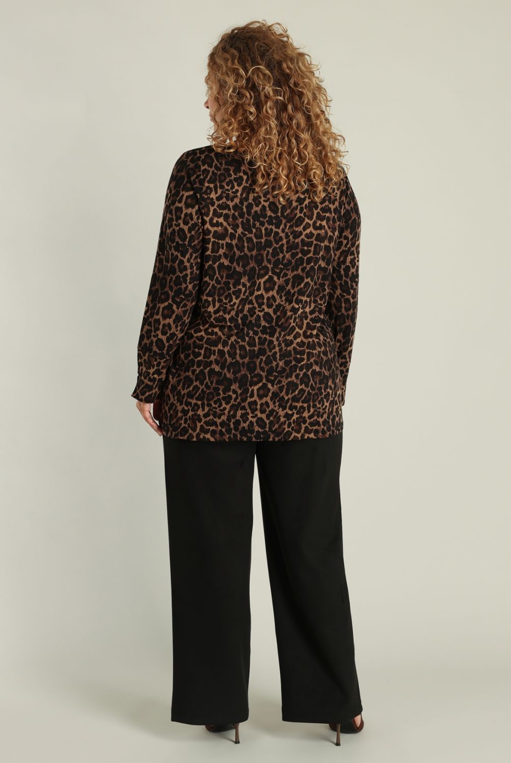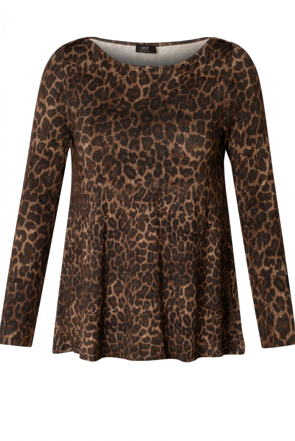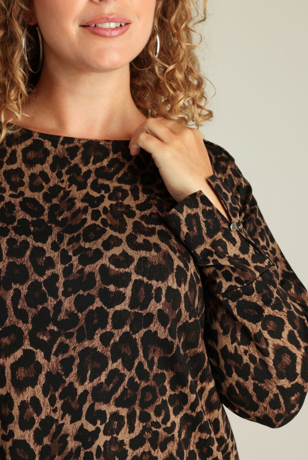 Dit shirt is gemaakt van een zachte jersey in Ecovero viscose met stretch, waardoor het comfortabel meebeweegt. De boothals en lange mouwen met manchet geven een verzorgde uitstraling. Verkrijgbaar in twee varianten: een bordeauxrode grafische print en een bruine luipaardprint. Duurzaam, stijlvol en makkelijk te combineren.