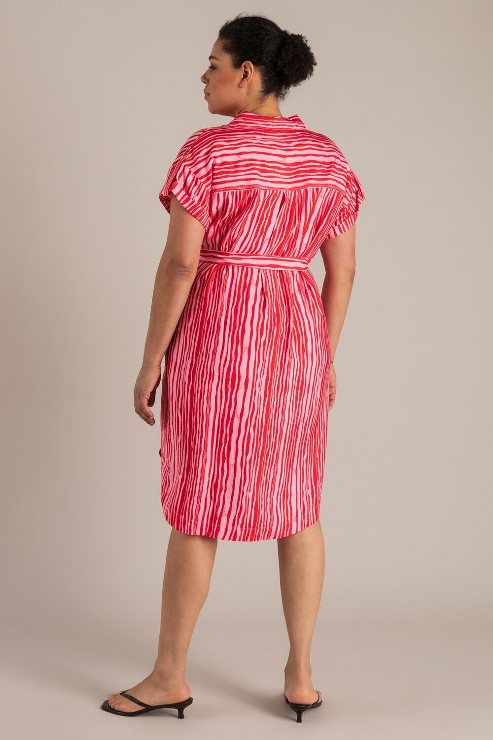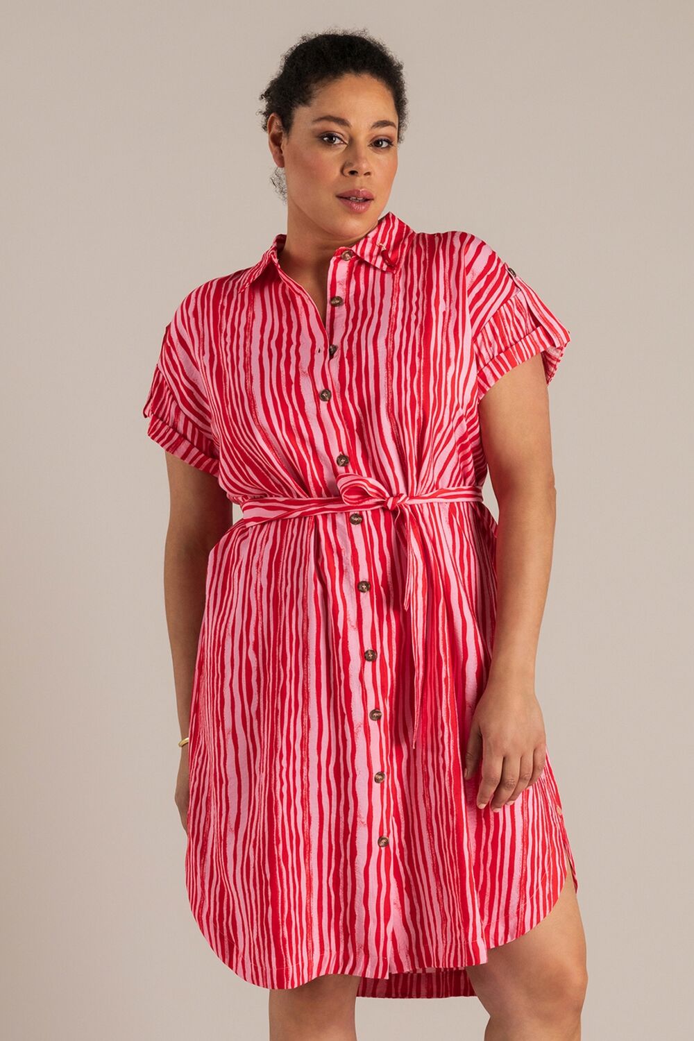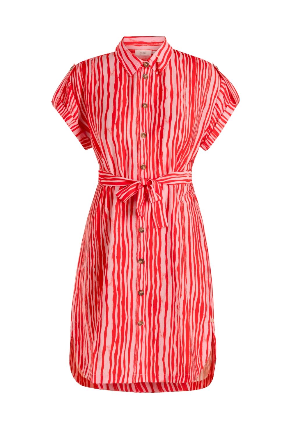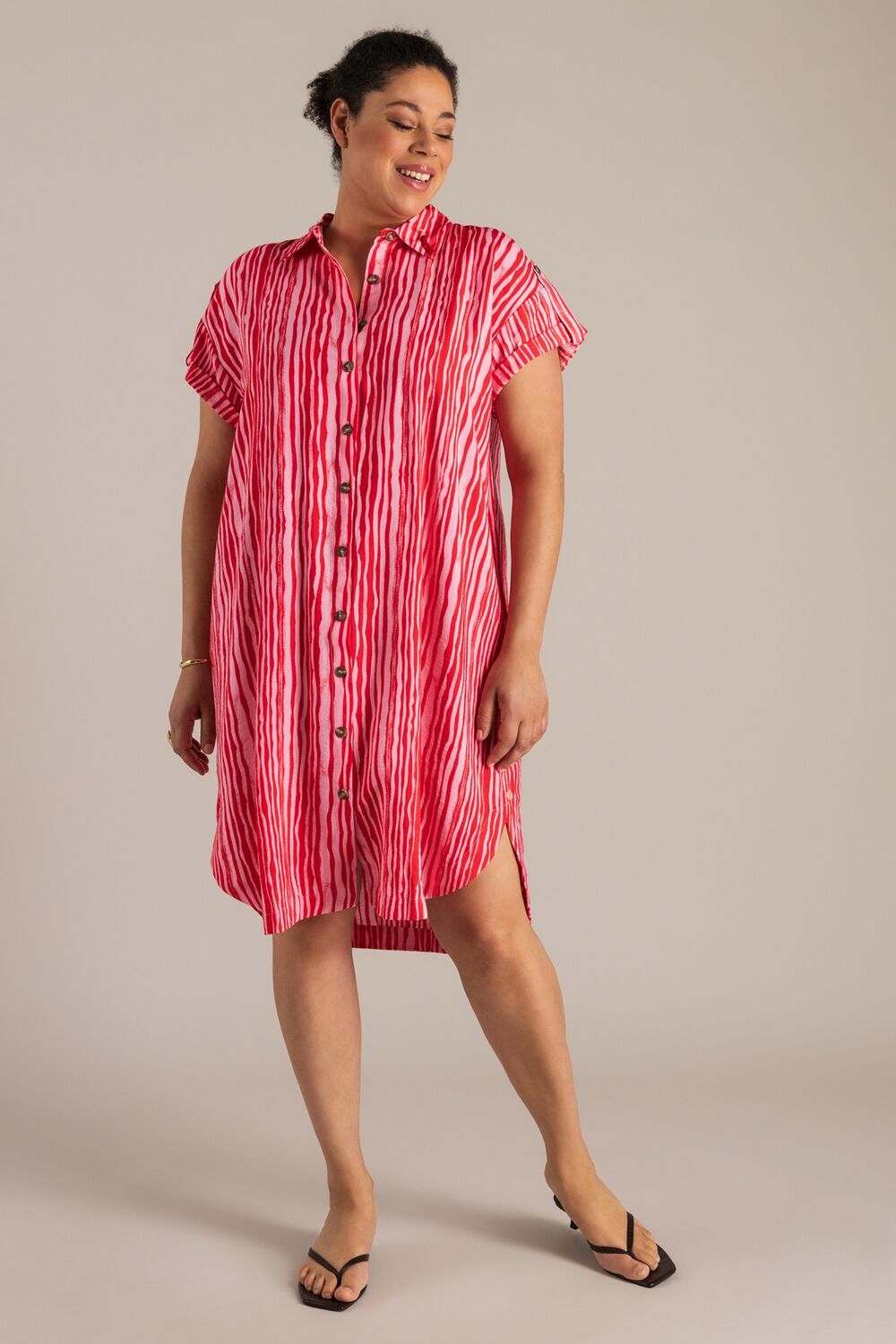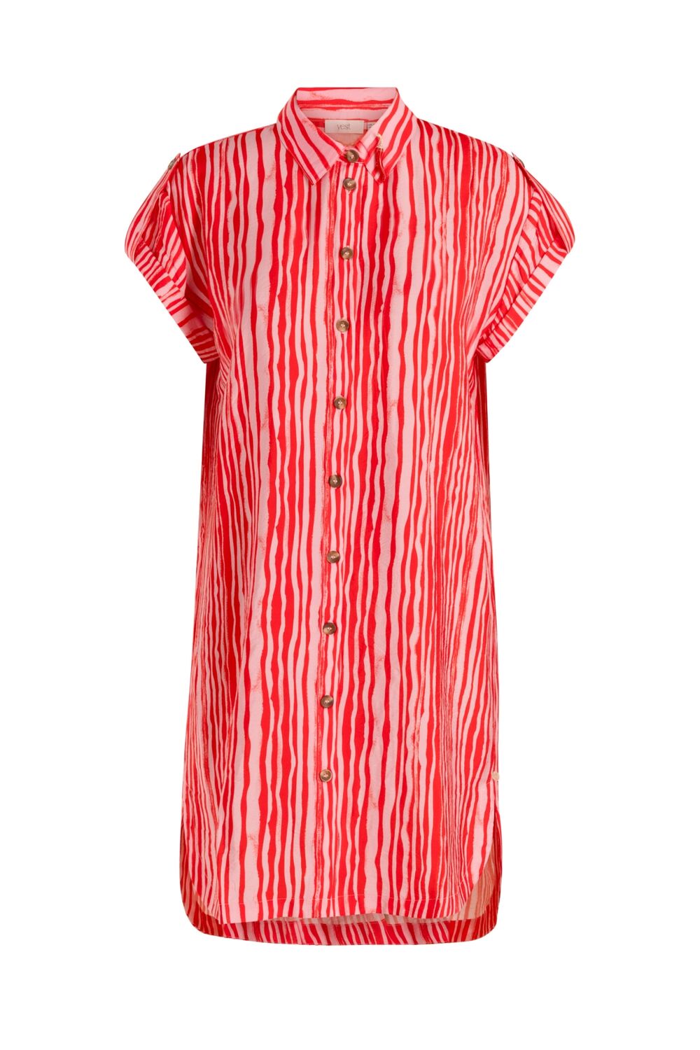 Dit is zo’n jurk die meteen zomers aanvoelt. De stof is licht en een beetje gekreukt voor een relaxte look. De fit zit lekker ruim en met de knoopjes draag je ’m zoals je wilt. Die red pepper broche? Gewoon een leuk extraatje.
