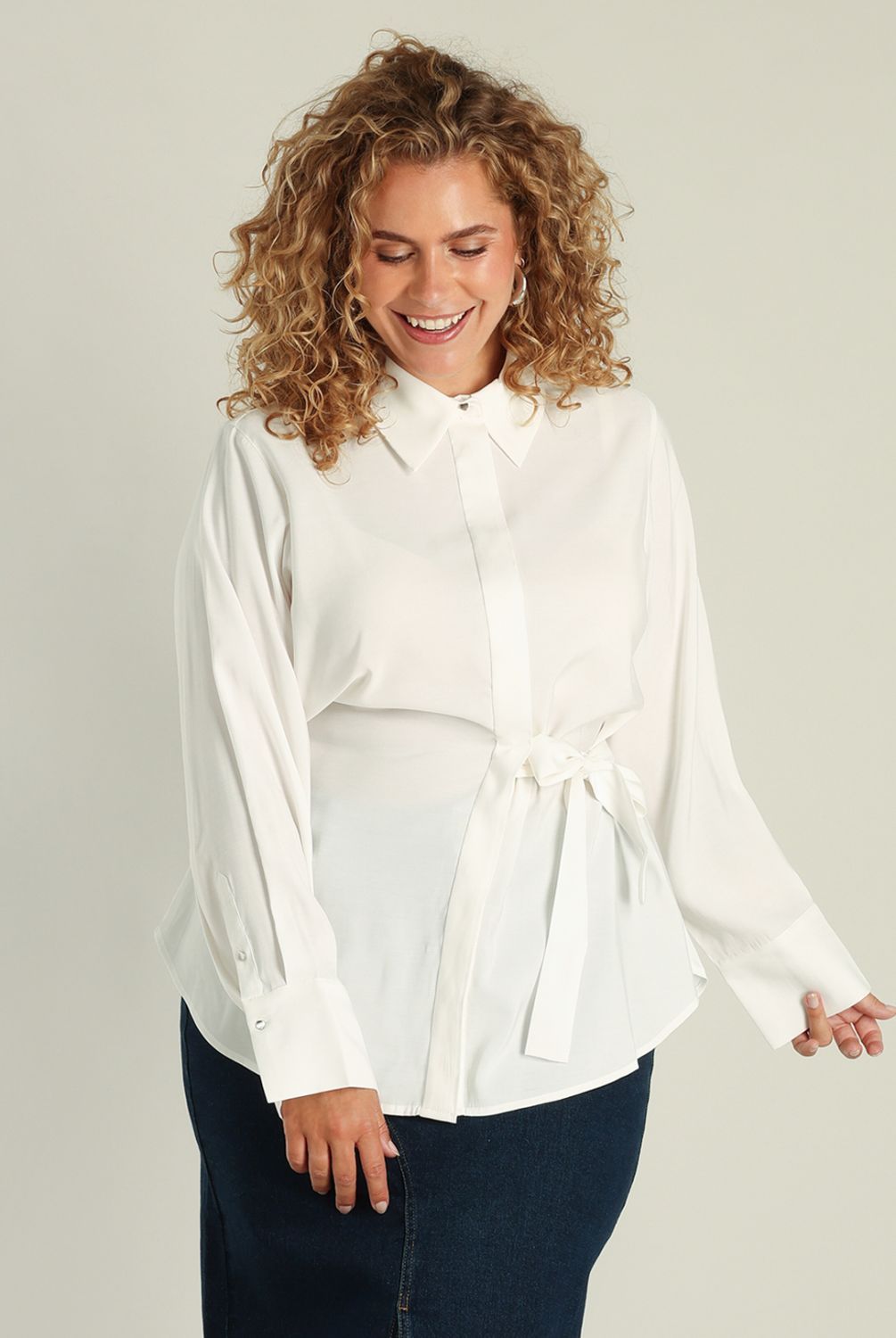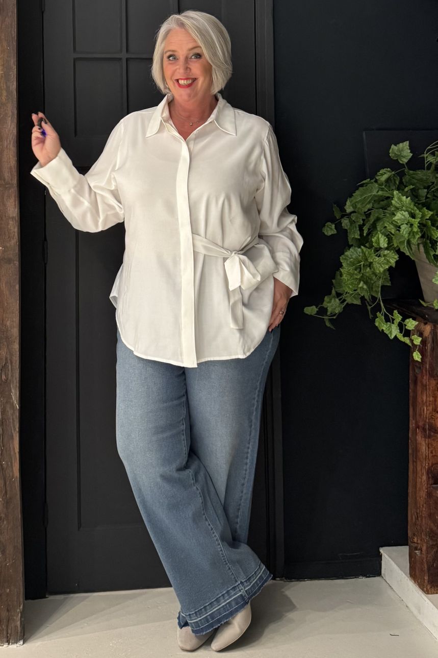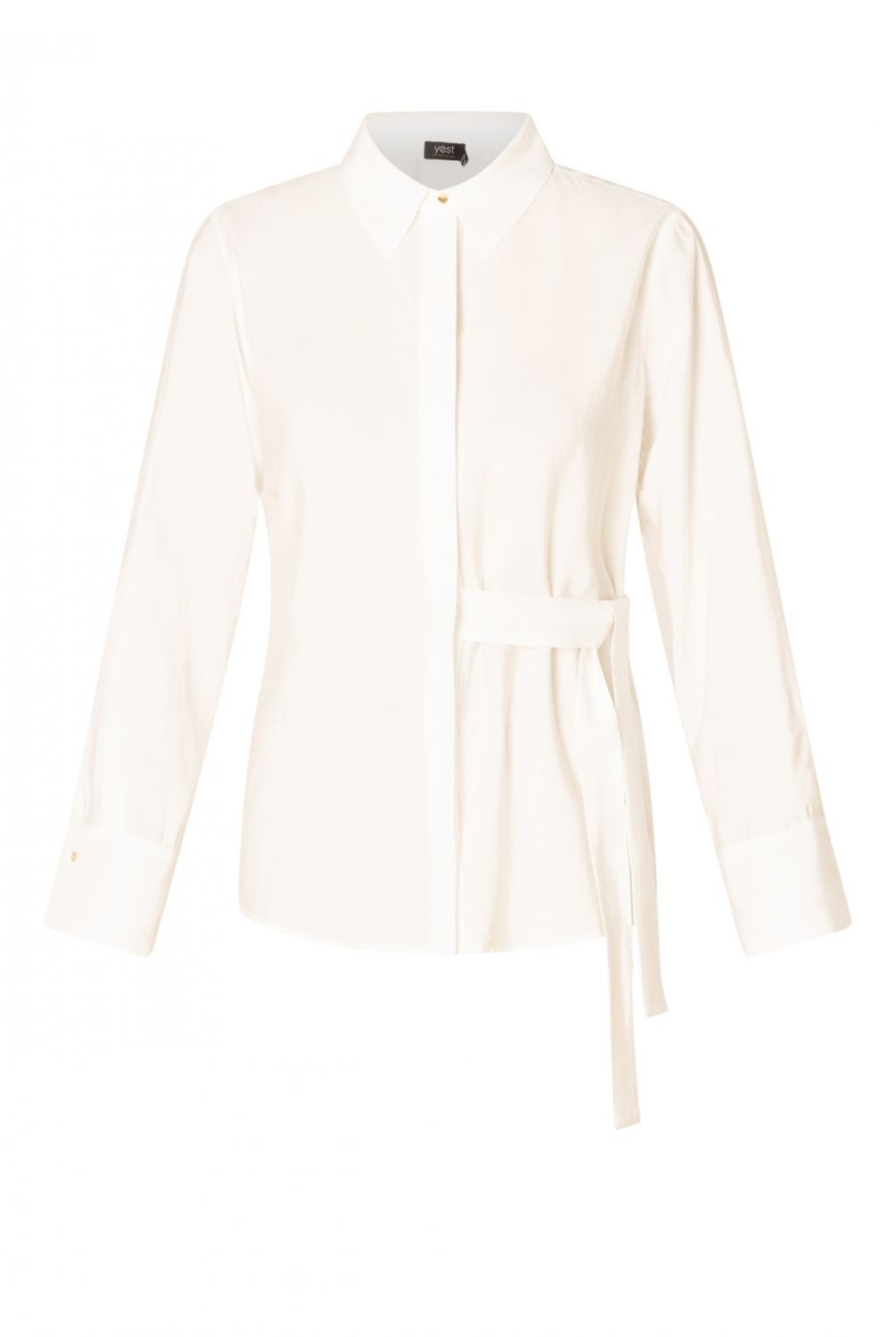 Deze blouse combineert eenvoud met subtiele details. De soepele viscosemix voelt prettig aan en heeft een matte uitstraling. Het model valt recht en heeft een strikceintuur met twee losse lussen die je naar wens kunt bevestigen of weglaten.