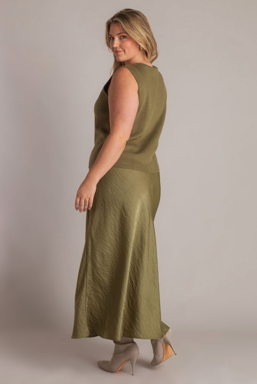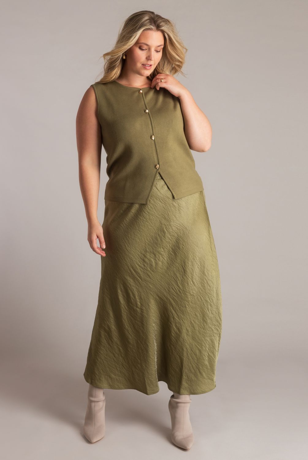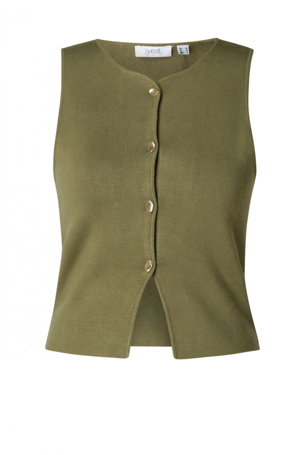 Dit gebreide mouwloze vestje is gemaakt van een zachte viscose-nylonmix en heeft een fijn, glad breisel. De glanzende knopen vormen een subtiel detail dat het ontwerp net iets chiquer maakt. Verkrijgbaar in olive en light grey, twee rustige tinten die makkelijk combineren.