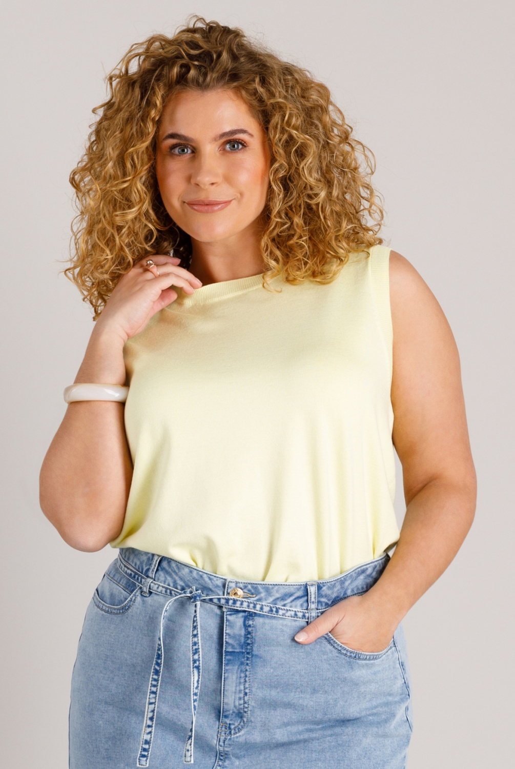Een top waar je meteen ideeën van krijgt: los dragen op een pantalon, of juist als complete twinset met het bijpassende vestje. De fijngebreide stof en hoge halslijn zorgen voor een frisse, minimalistische uitstraling. En met drie mooie kleuren om uit te kiezen zit je eigenlijk altijd goed.