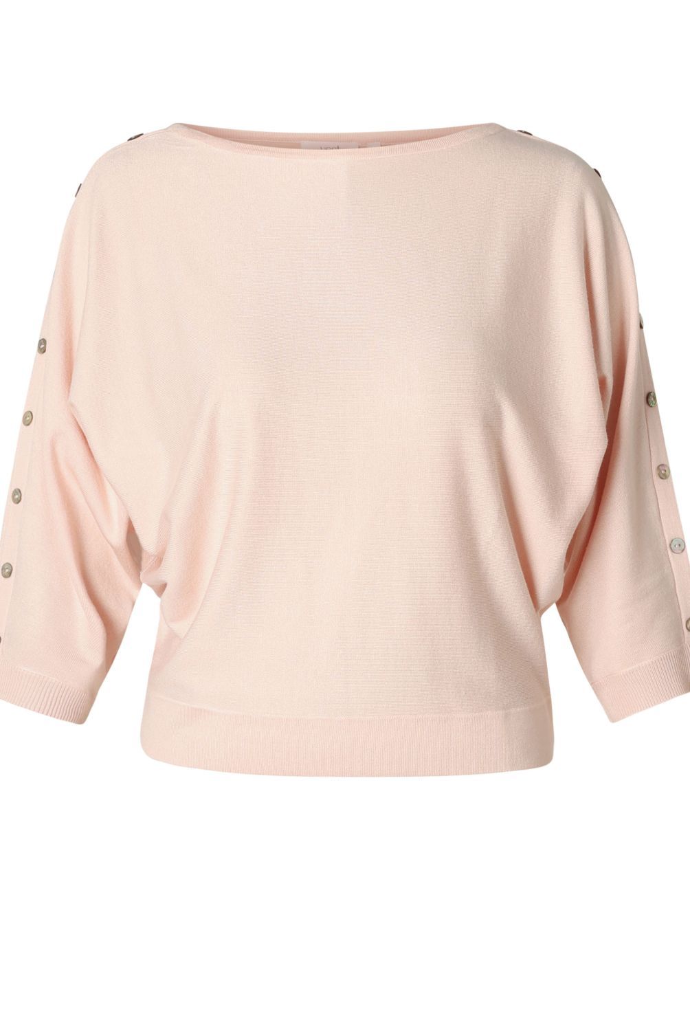 Deze gebreide trui in viscose-nylonblend draagt soepel en voelt zacht aan op de huid. Het ontwerp heeft een verfijnde boothals, verlaagde schoudernaden en 3/4-mouwen met een knopenrij als extra accent. De relaxte pasvorm maakt dit item ideaal voor luchtige, eenvoudige looks.