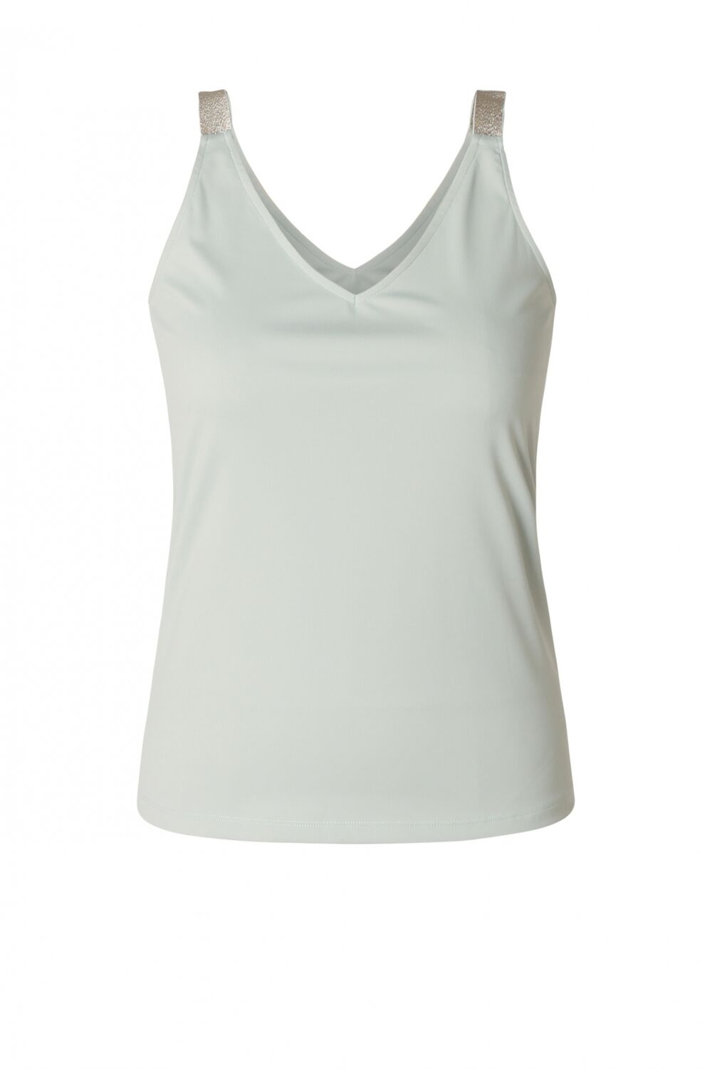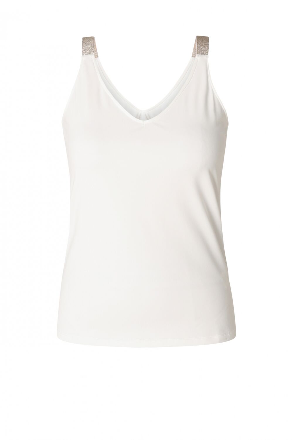 Dit hemdje is zo’n item dat je de hele zomer door blijft pakken. De comfortabele, vormvaste travelstof beweegt fijn mee en de glitterbandjes geven precies genoeg sprankel. Extra leuk: je draagt hem aan twee kanten, met V-hals of ronde hals. Makkelijk, luchtig en stijlvol.