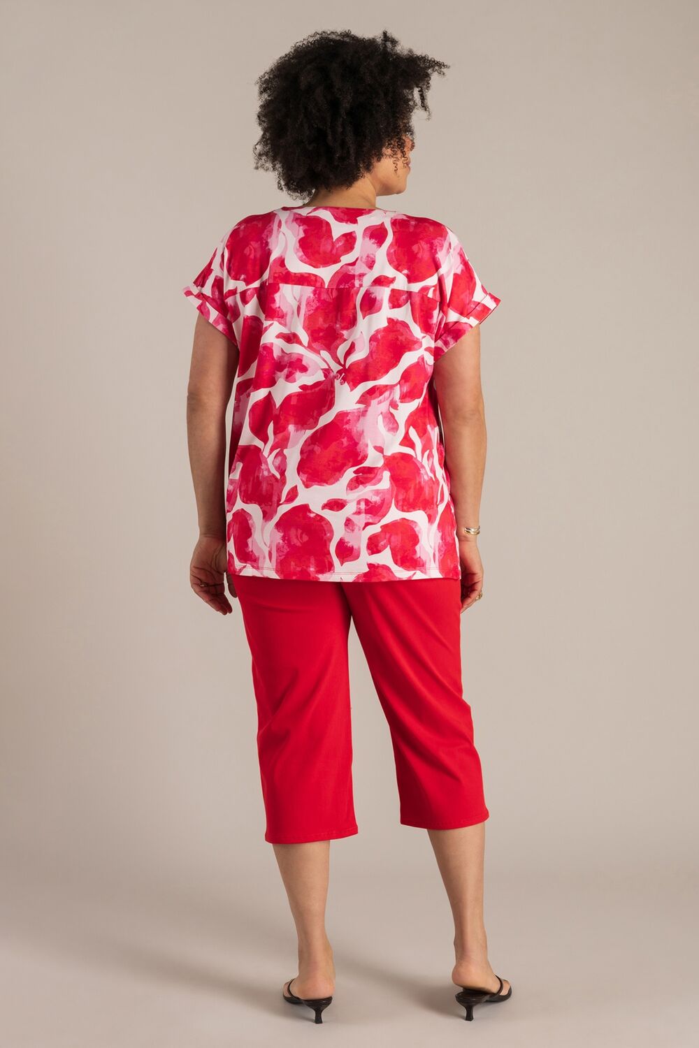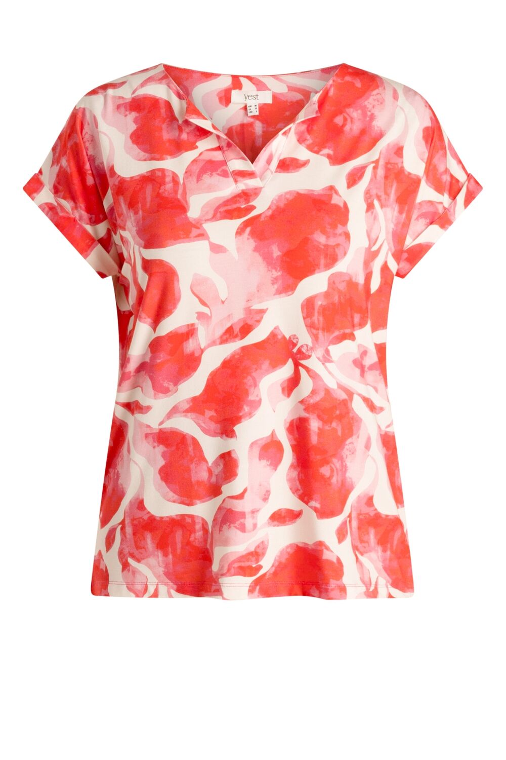 Dit T-shirt is gemaakt van een soepele jersey kwaliteit die zacht aanvoelt en licht meerekt. De kapmouwtjes zorgen voor een comfortabele pasvorm rond de schouders. De V-hals met kleine split en de allover print geven het ontwerp een opvallend, zomers karakter.