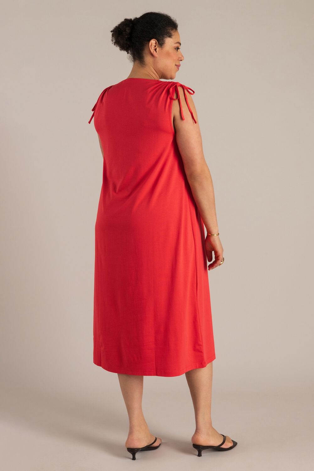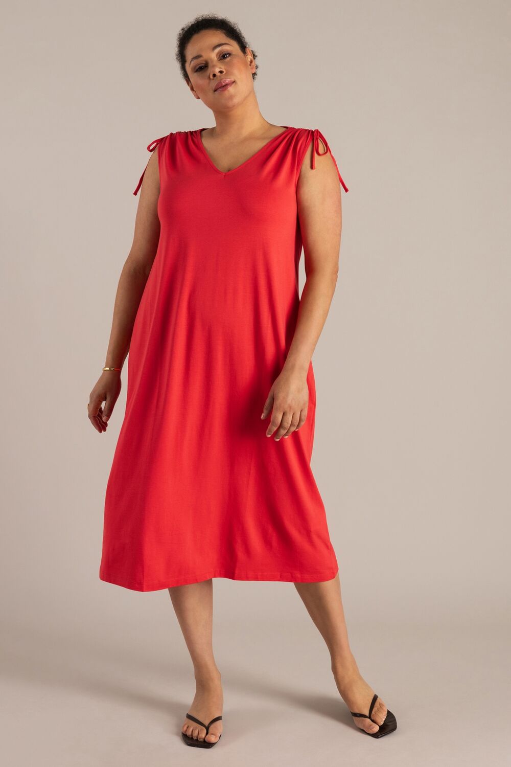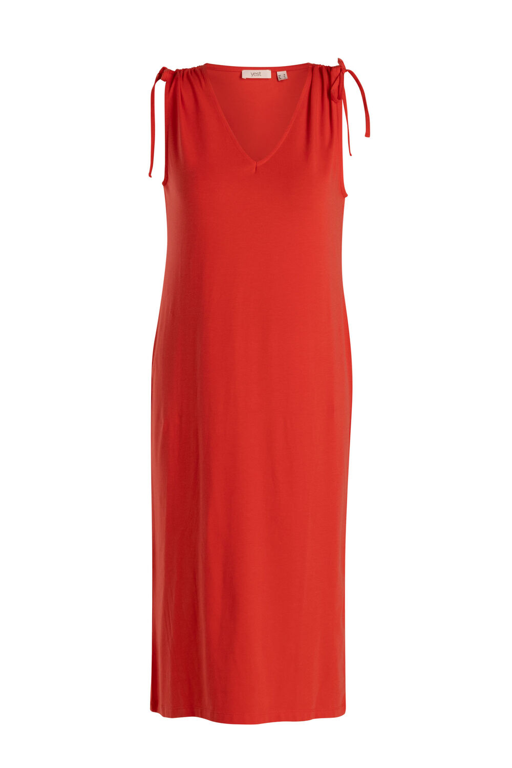 Deze lange jersey jurk is gemaakt van een soepele, licht elastische stof die prettig draagt op warme dagen. De V-hals en verschuifbare schouderpartij zorgen voor een aanpasbare pasvorm. Verkrijgbaar in red en taupe. Het model valt recht en volgt het lichaam op een natuurlijke manier.