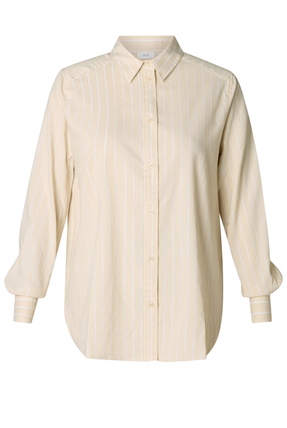 Deze blouse heeft dat heerlijke, losse silhouet dat meteen comfortabel voelt. De verticale strepen maken ’m mooi lang en slank, terwijl de subtiele glans in de stof voor net dat beetje extra zorgt. In de zachte natureltint past hij overal bij—een echte allrounder voor elke dag.