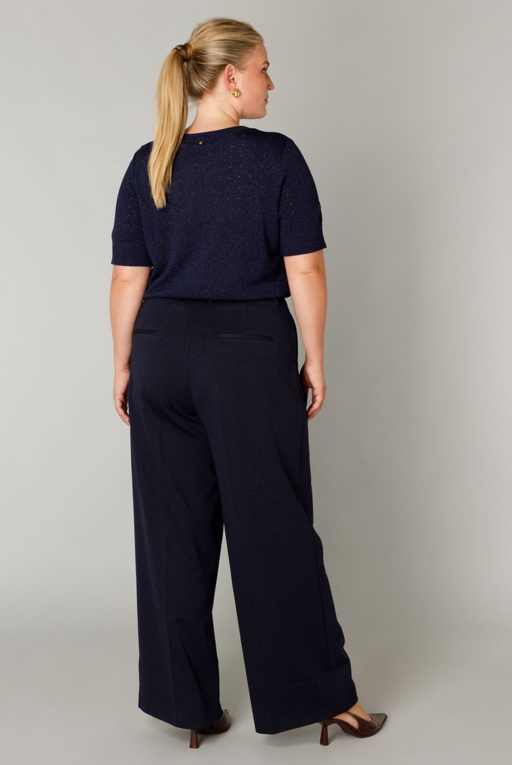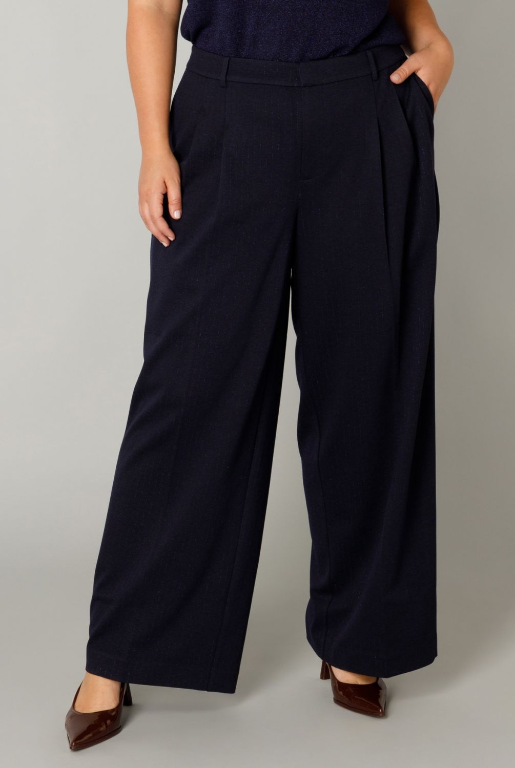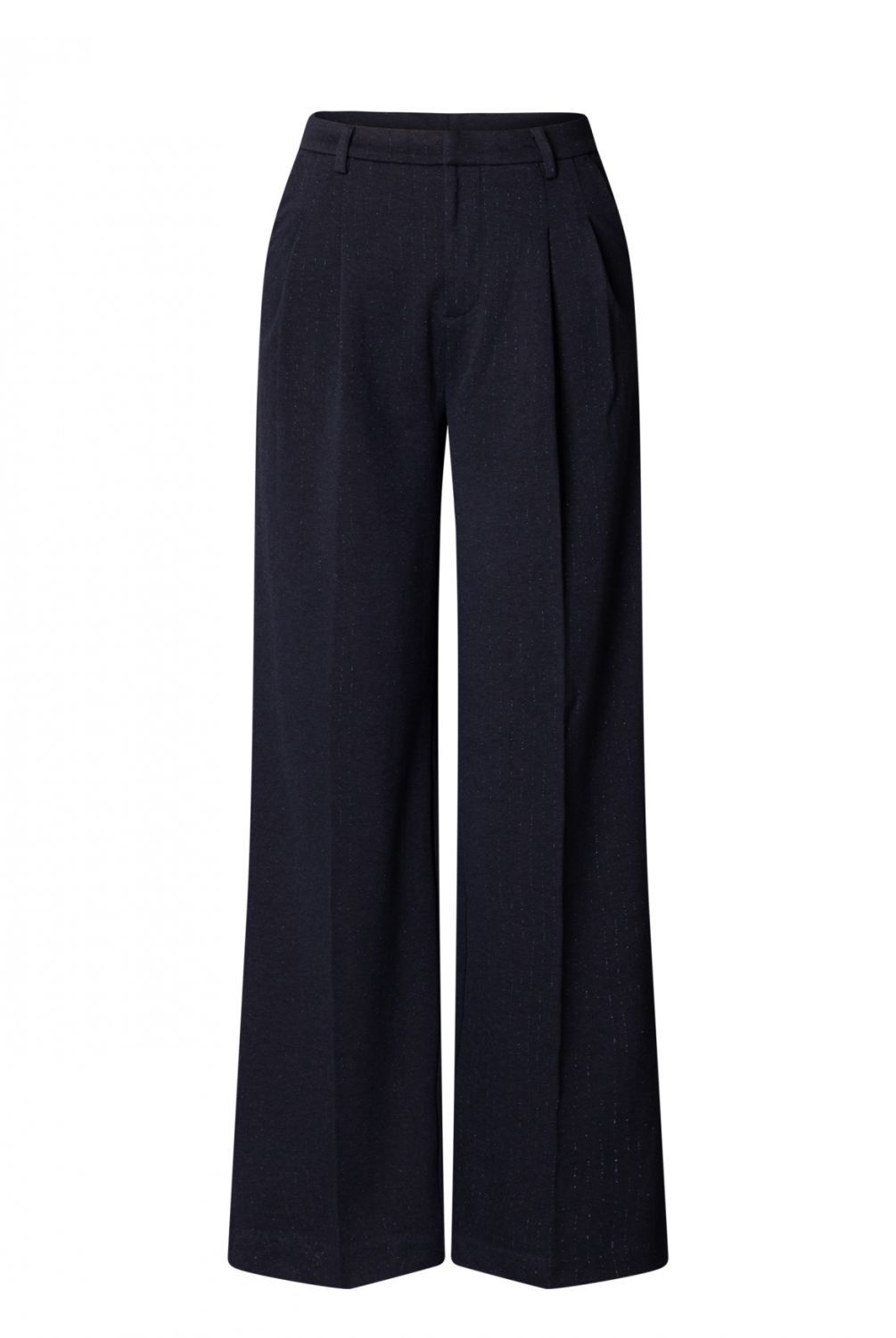 Comfortabel en met een subtiel glansje! Deze pantalon heeft een bandplooi en een wijd model voor een relaxte, stijlvolle look. Je kunt kiezen uit twee kleuren die makkelijk te combineren zijn, Dark Grey melange en Dark Navy.