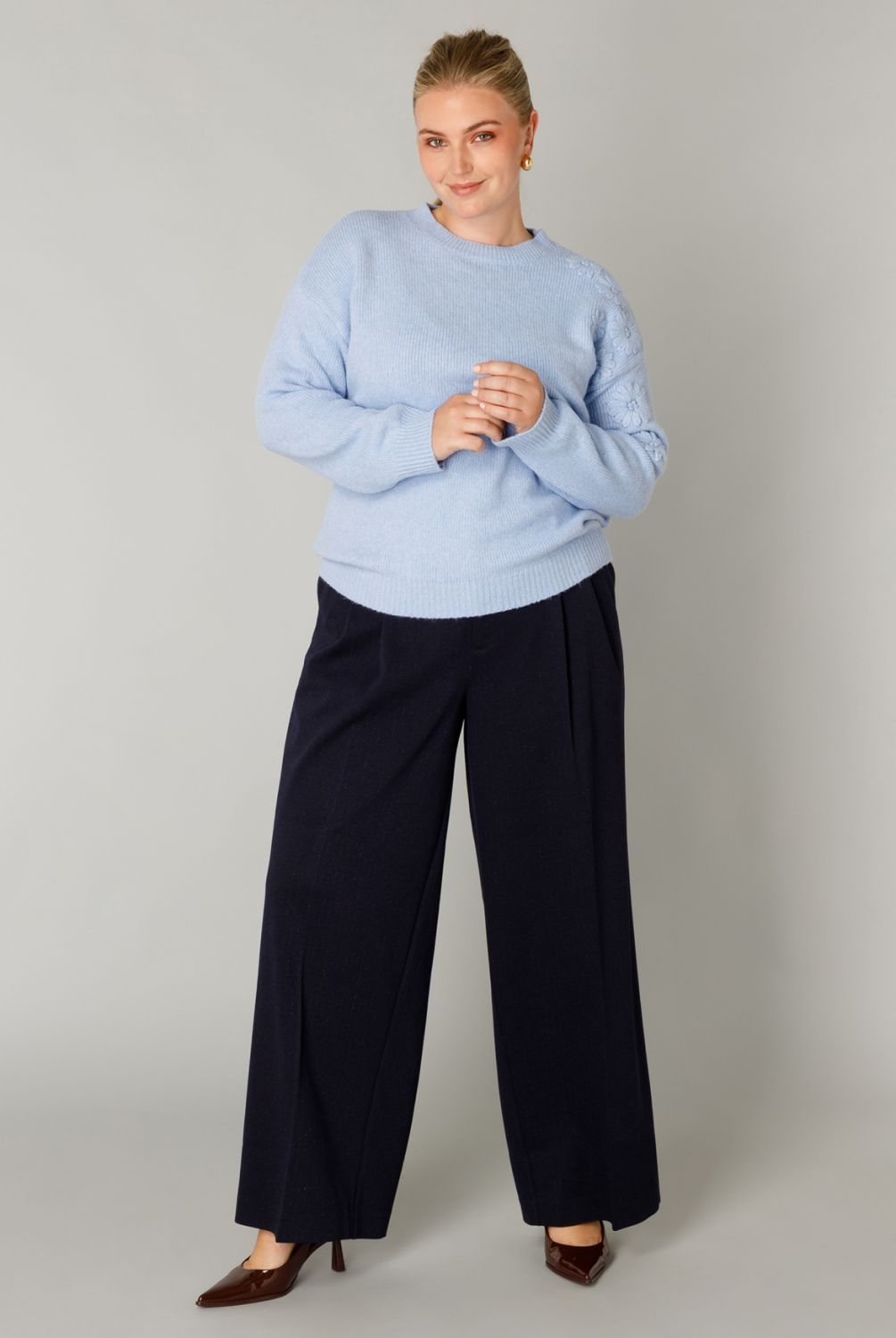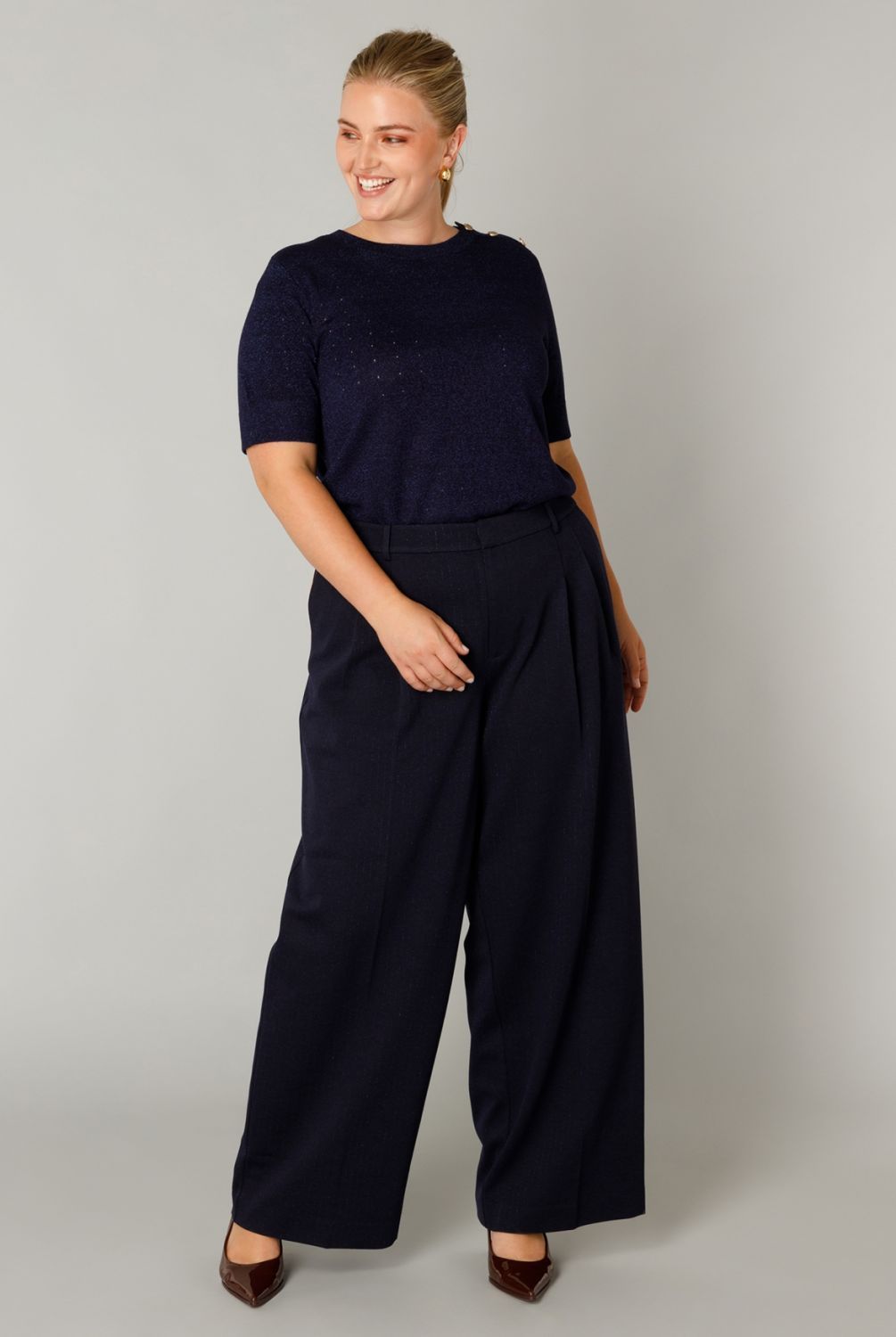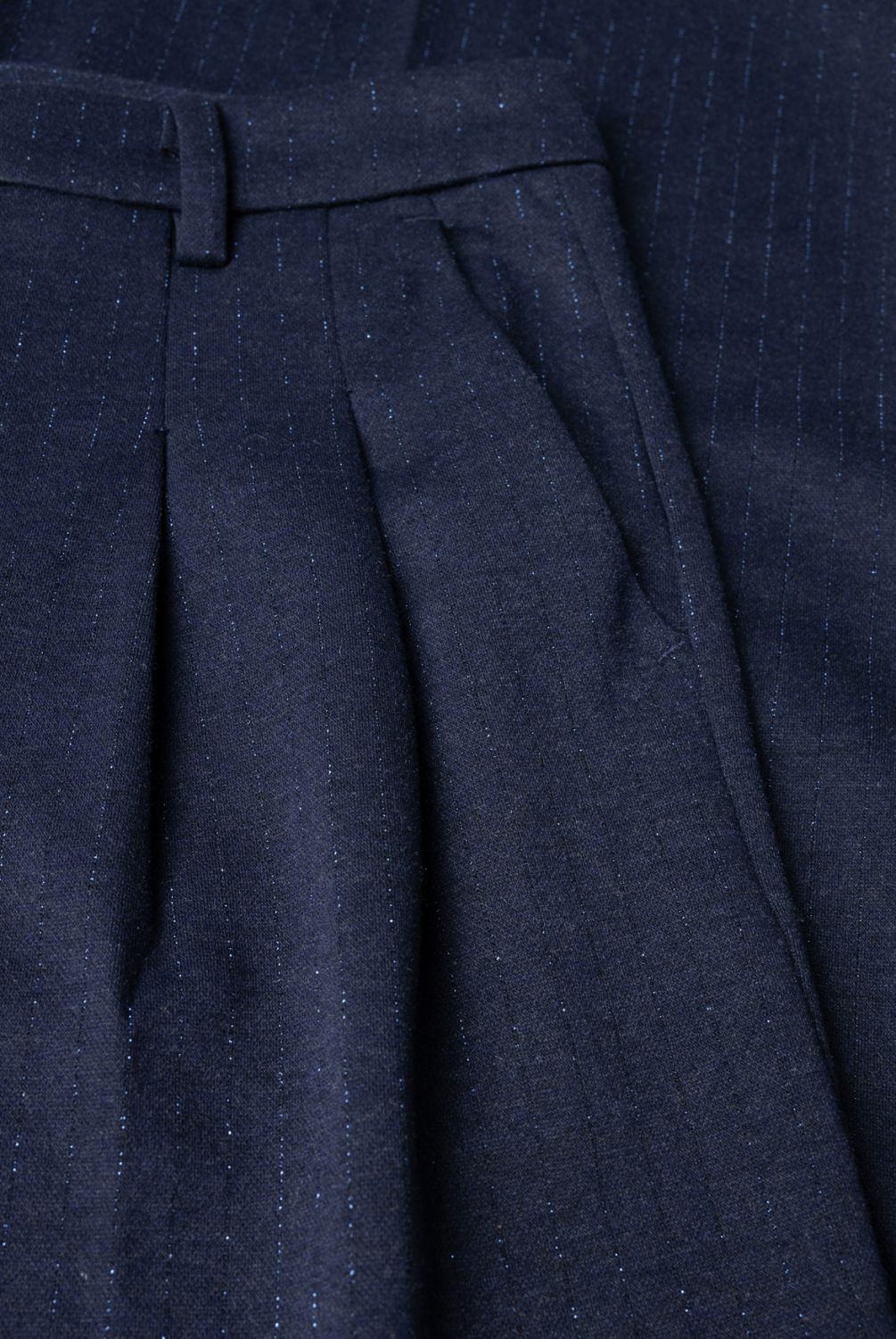 Comfortabel en met een subtiel glansje! Deze pantalon heeft een bandplooi en een wijd model voor een relaxte, stijlvolle look. Je kunt kiezen uit twee kleuren die makkelijk te combineren zijn, Dark Grey melange en Dark Navy.
