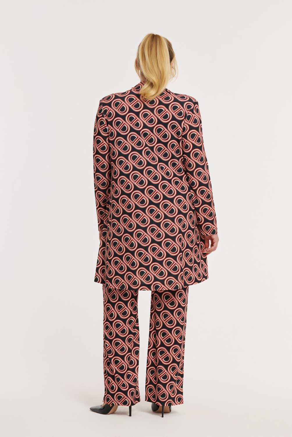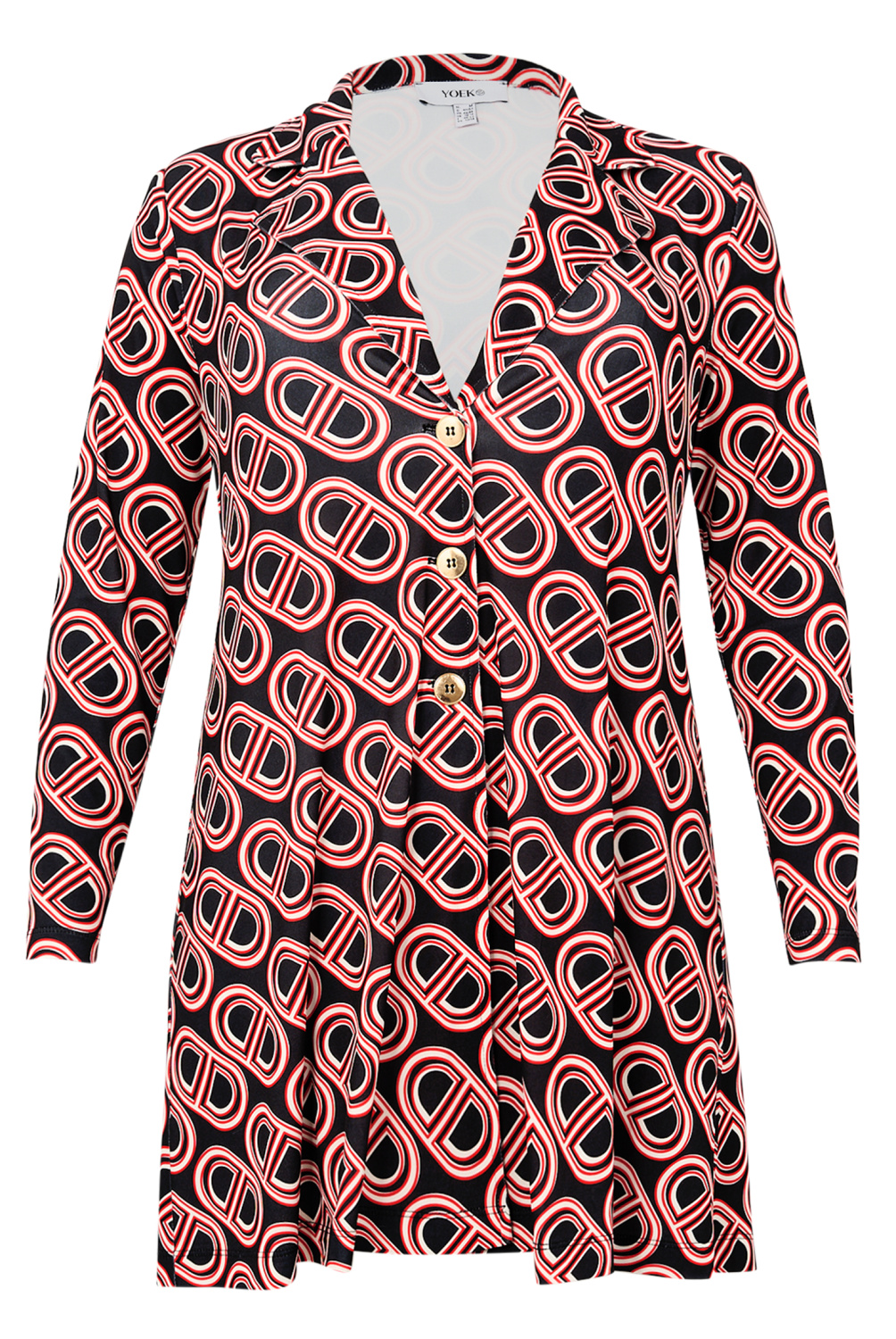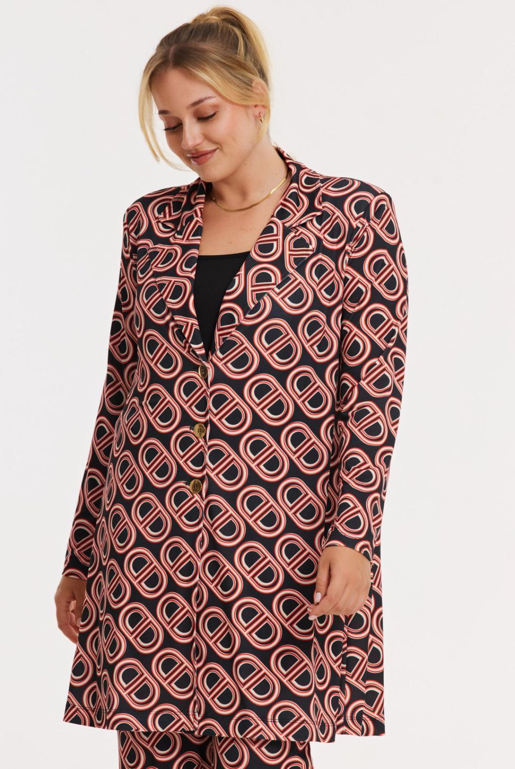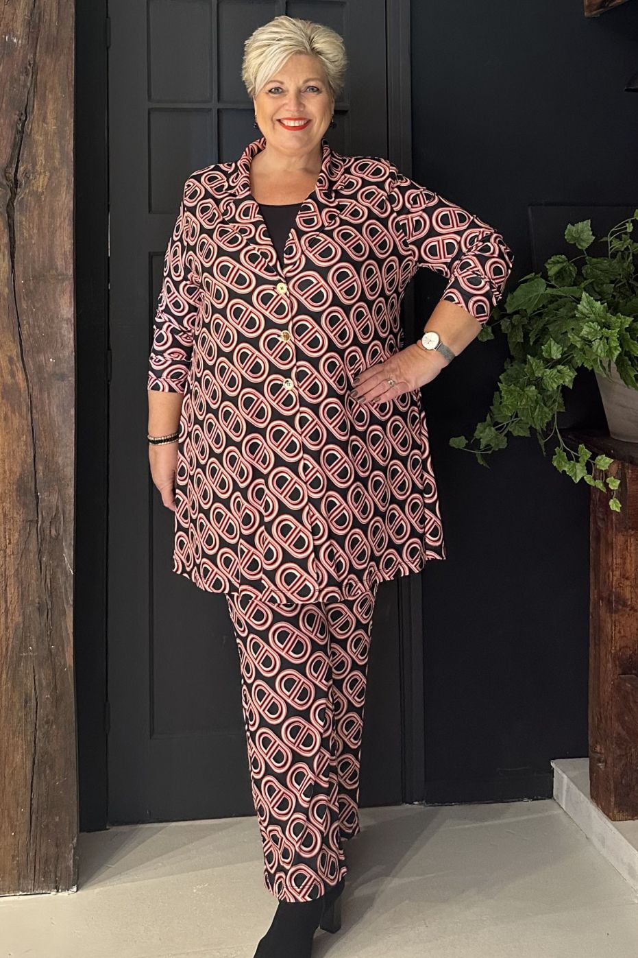 Ontdek nu deze statement blazer in een opvallende retroprint, uitgevoerd in ons comfortabele dolce-materiaal. De soepele stretchstof voelt heerlijk zacht aan en beweegt met je mee. Combineer met de bijpassende broek voor een krachtige, modieuze look. Perfect voor de vrouw die durft op te vallen met stijl.