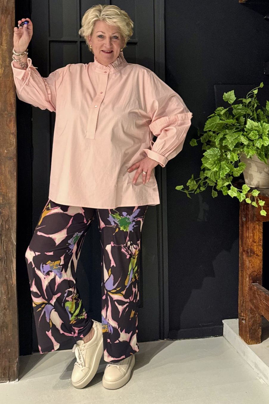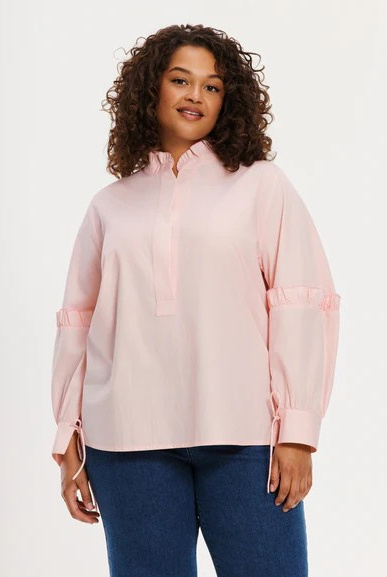 Oh lichtroze, katoen én ruches! Met deze blouse ben je helemaal klaar voor een frisse voorjaarslook. De katoenen, iets wijdere blouse is voorzien van verfijnde details; zoals een opstaand kraagje, subtiele split-halslijn en sierlijke ruches op de mouwen welke bij de manchetten voorzien zijn van een striklint voor een speels accent.