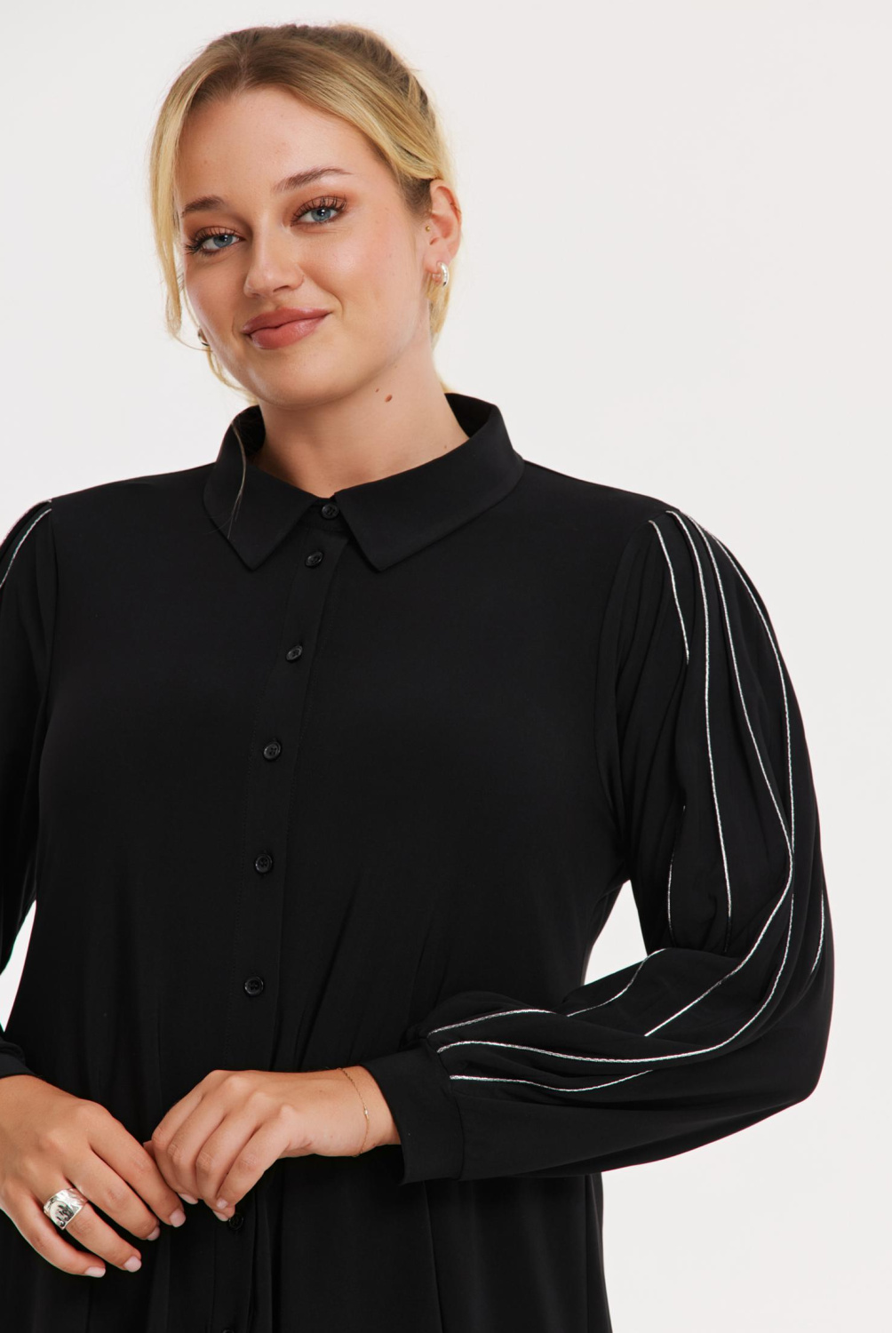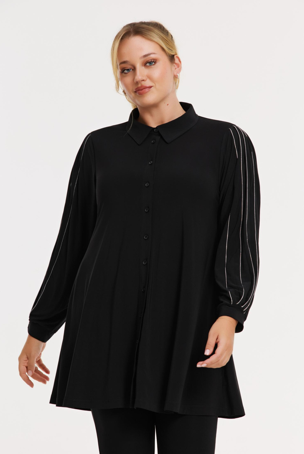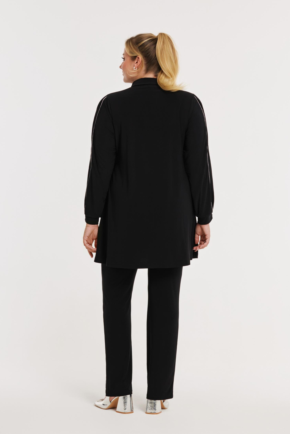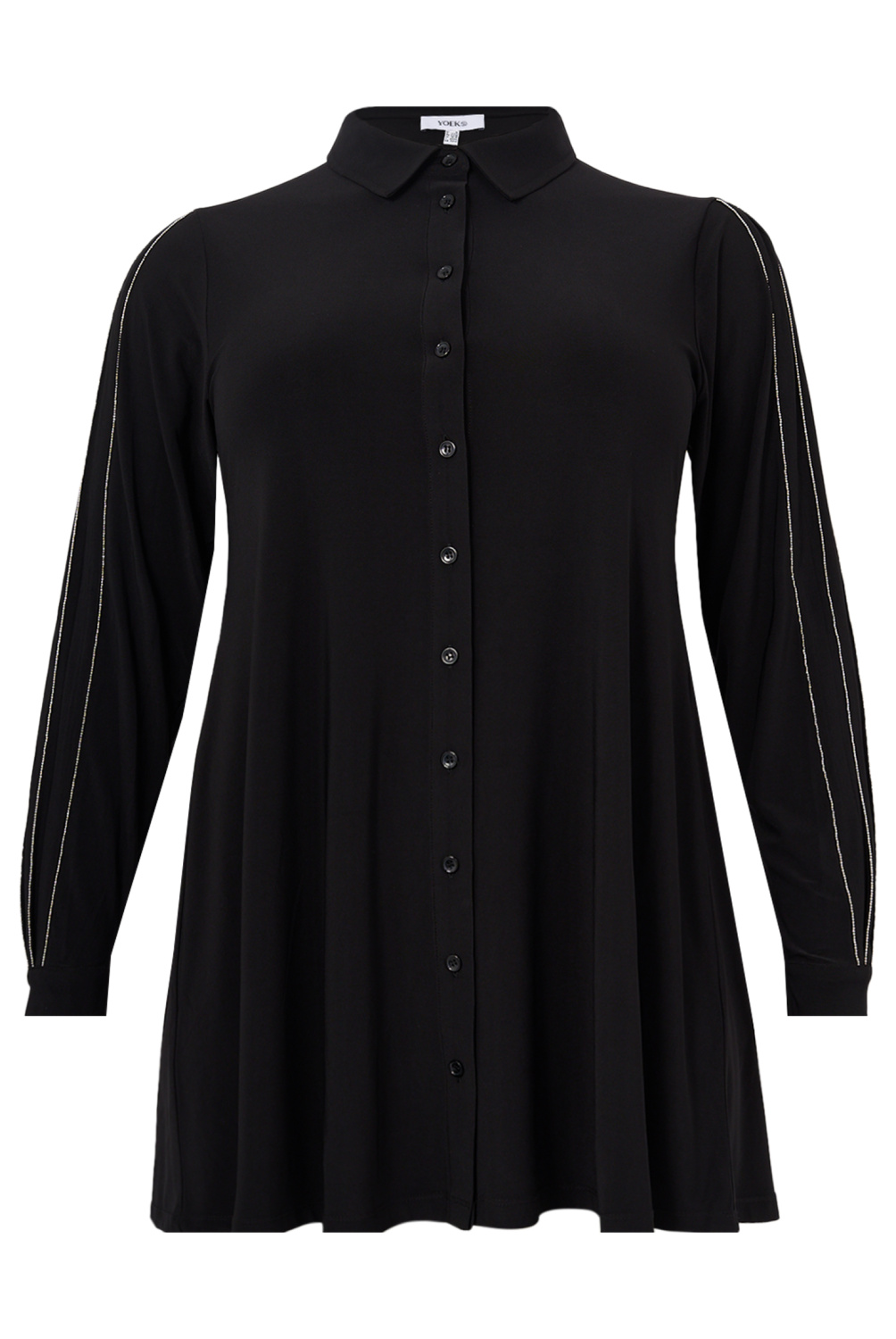 Deze zwarte blouse van het kenmerkende dolce-materiaal biedt ultiem comfort met een vleugje elegantie. De geplooide mouwen zijn afgewerkt met subtiele faux leren details die zorgen voor een moderne, verfijnde look. Met klassieke kraag, knoopsluiting en de populaire wide bottom pasvorm.