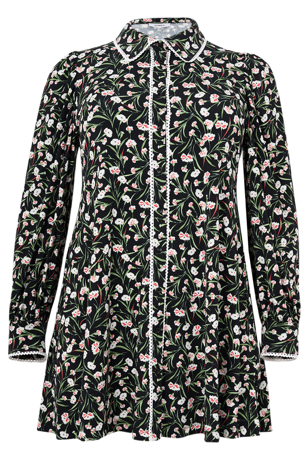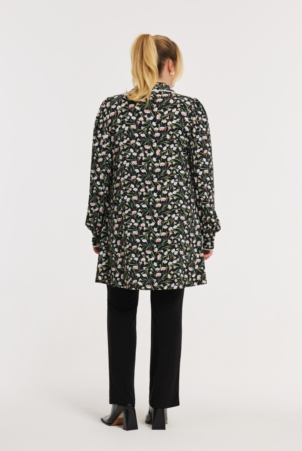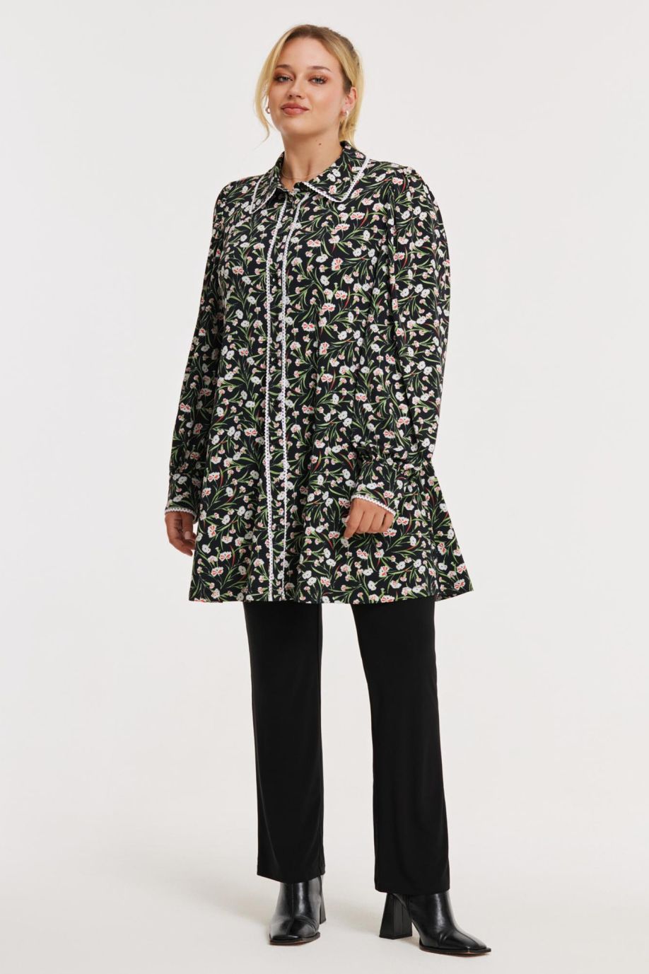 Deze prachtige blouse van het comfortabele dolce materiaal is versierd met een charmante bloemenprint op een zwarte ondergrond. De witte kanten details langs de kraag, knoopsluiting en manchetten geven het ontwerp een romantische uitstraling. Met licht geplooide mouwen en een flatterende wide bottom pasvorm.