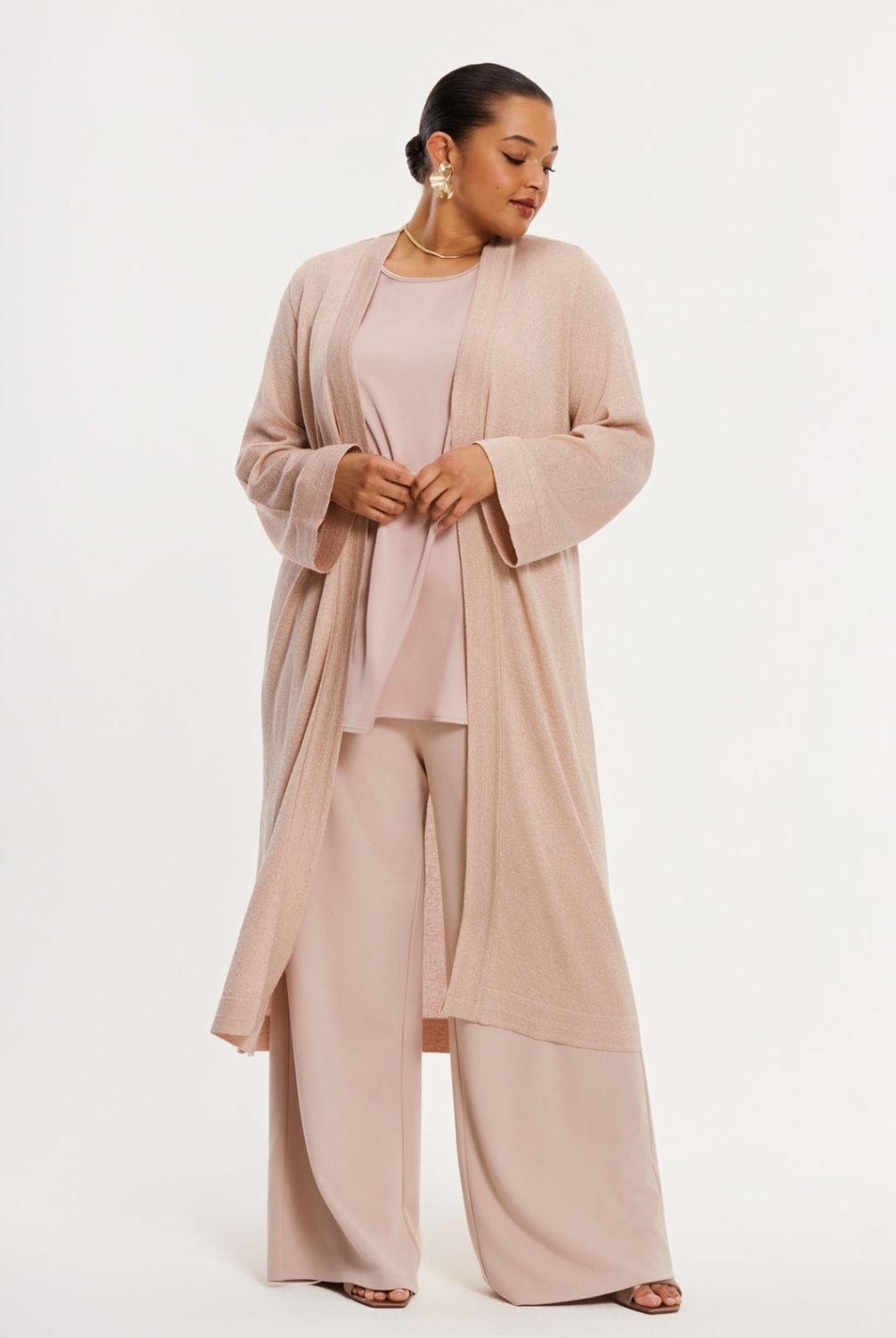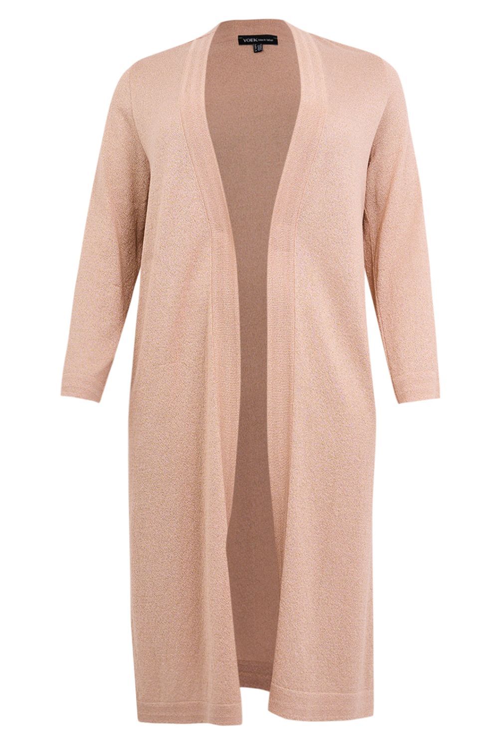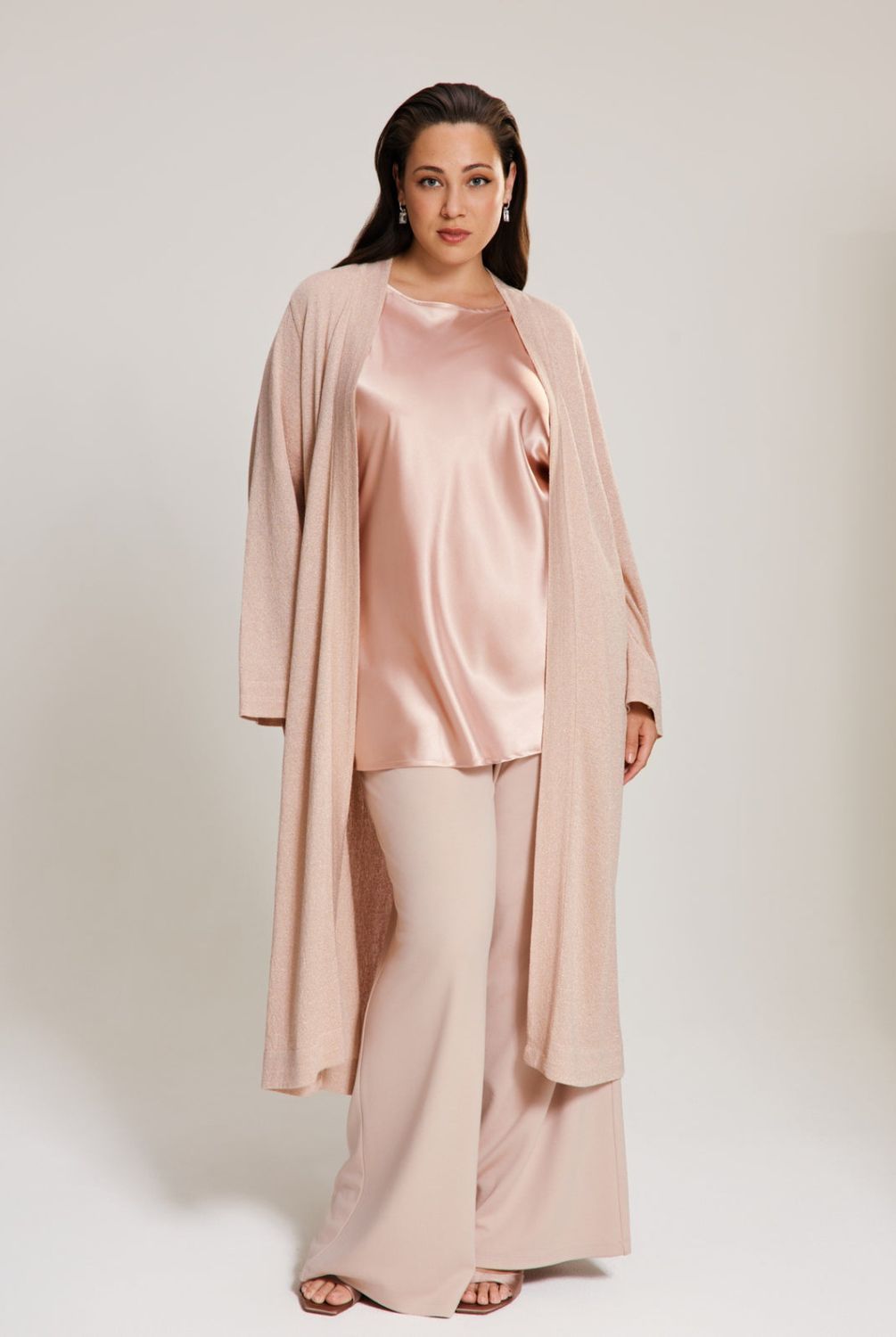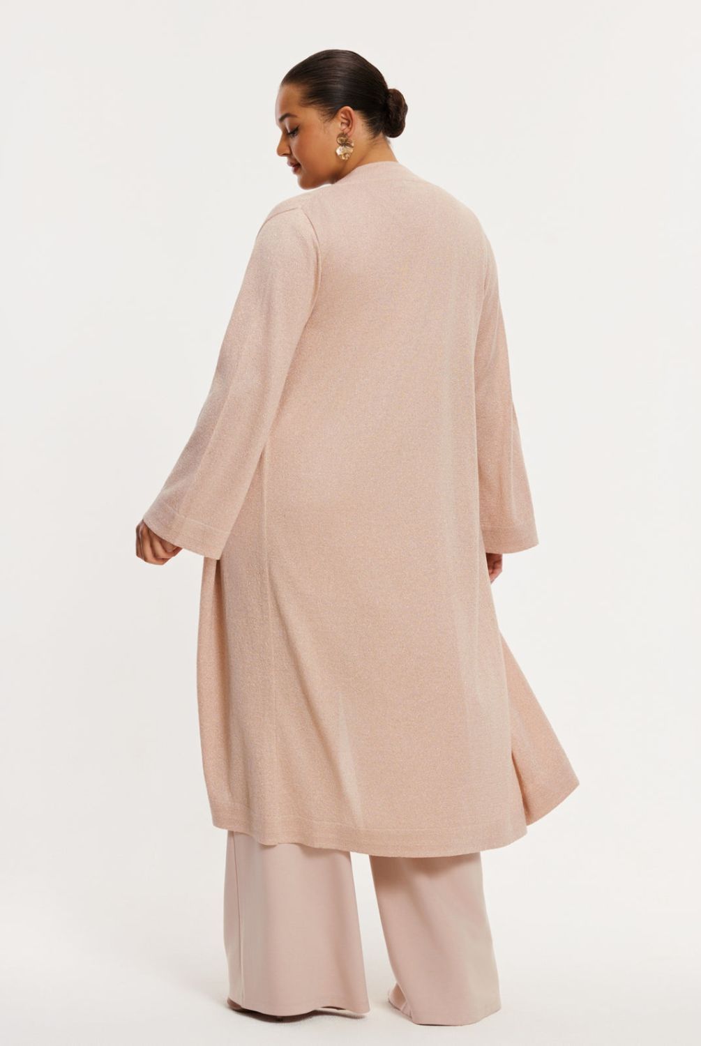 Een elegante lange cardigan in een poedertint, afgewerkt met een subtiele glans. Het openvallende model valt sierlijk en past zowel bij casual als geklede outfits. Wijde mouwen en een zachte knit maken het tot een luxe maar comfy keuze.
