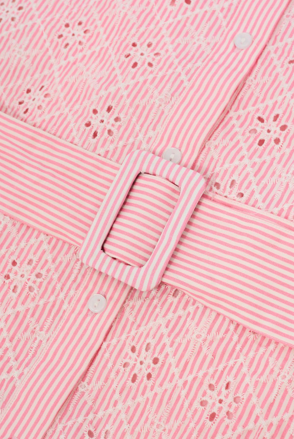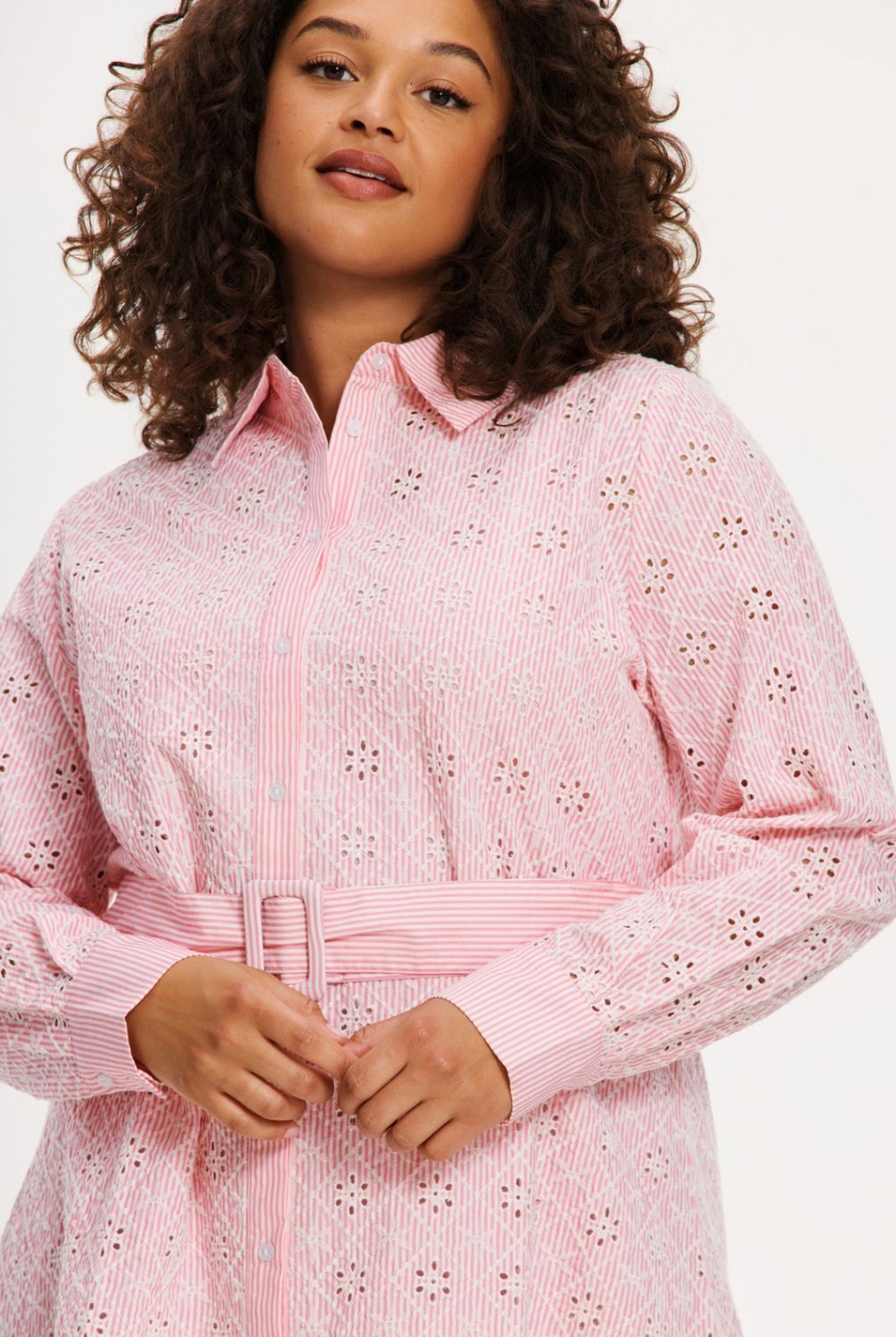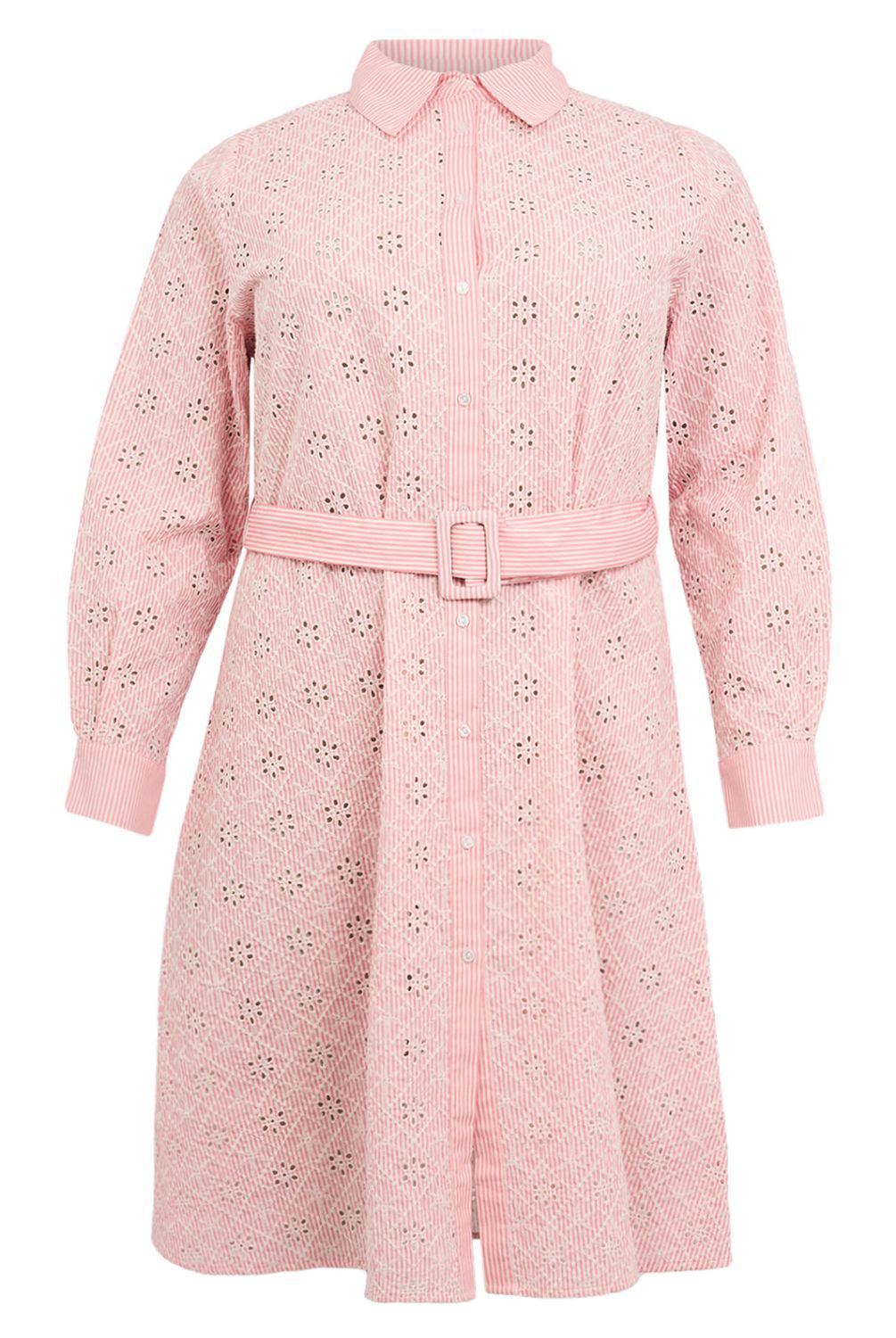 Geef je zomergarderobe een upgrade met deze blouse-jurk in fijne zacht roze en witte strepen. Gemaakt van ademend katoen combineert dit item een tijdloze look met romantische broderie anglaise details. Voorzien van een knoopsluiting aan de voorkant en een klassieke kraag, evenals een bijpassende ceintuur die de taille accentueert voor een flatterende pasvorm. Perfect voor zonnige dagen en om stijlvol de stad mee in te lopen!