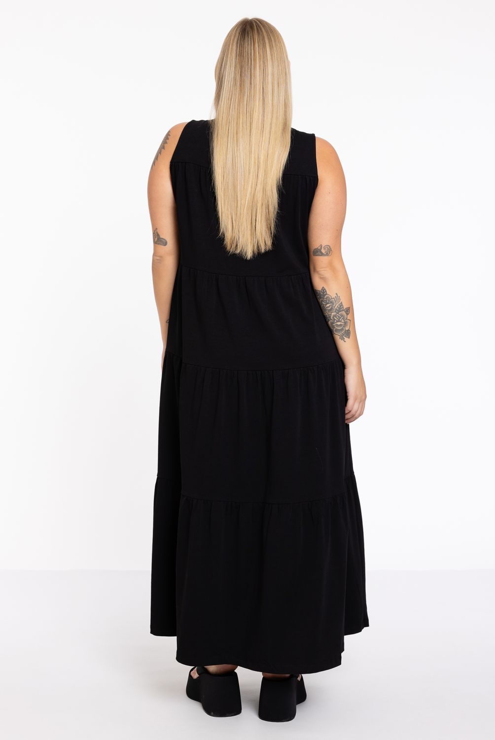 Van strand tot diner, deze jurk is perfect voor bijna elke zomerse gelegenheid. Het is gemaakt van biologisch katoen wat de jurk zacht, licht en luchtig maakt. De jurk heeft een ronde halslijn, wijde pasvorm en heeft een enkellengte. Van de taille tot de zoom heeft de jurk romantische ruches.