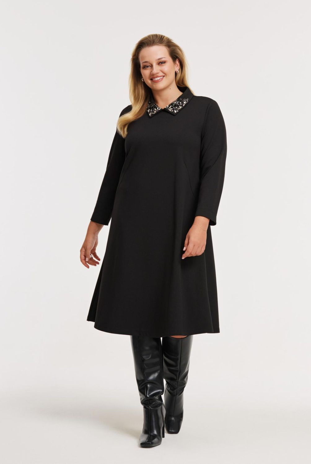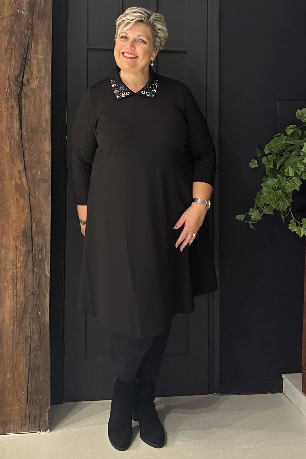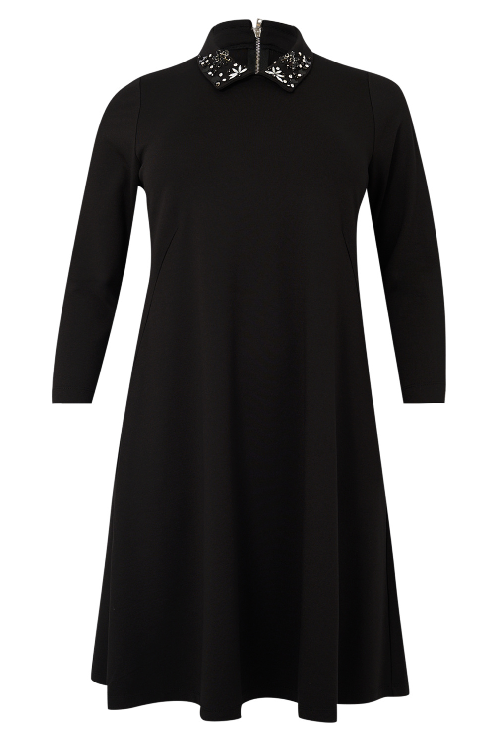Een zwarte A-lijn jurk met een kraag versierd met fonkelende kraaltjes en stenen. De ritssluiting bij de hals geeft een moderne twist. Ontworpen met lange mouwen en een strakke snit voor tijdloze elegantie. Een veelzijdig item dat van kantoor tot avond gedragen kan worden, gemaakt van de ietwat stevigere Vero stof.
