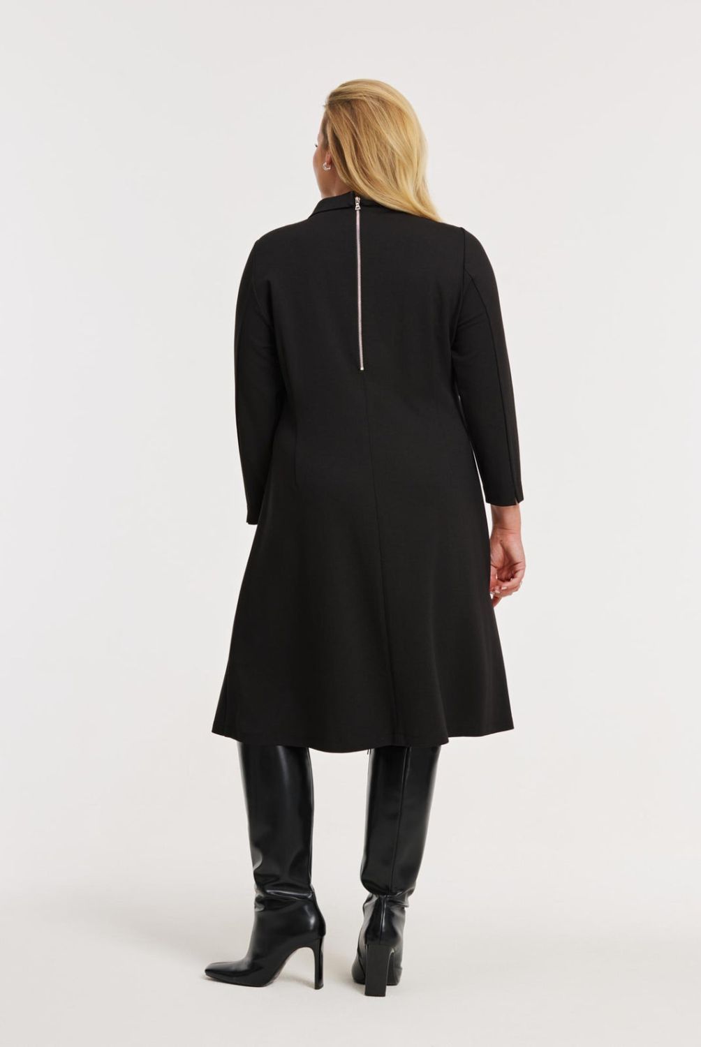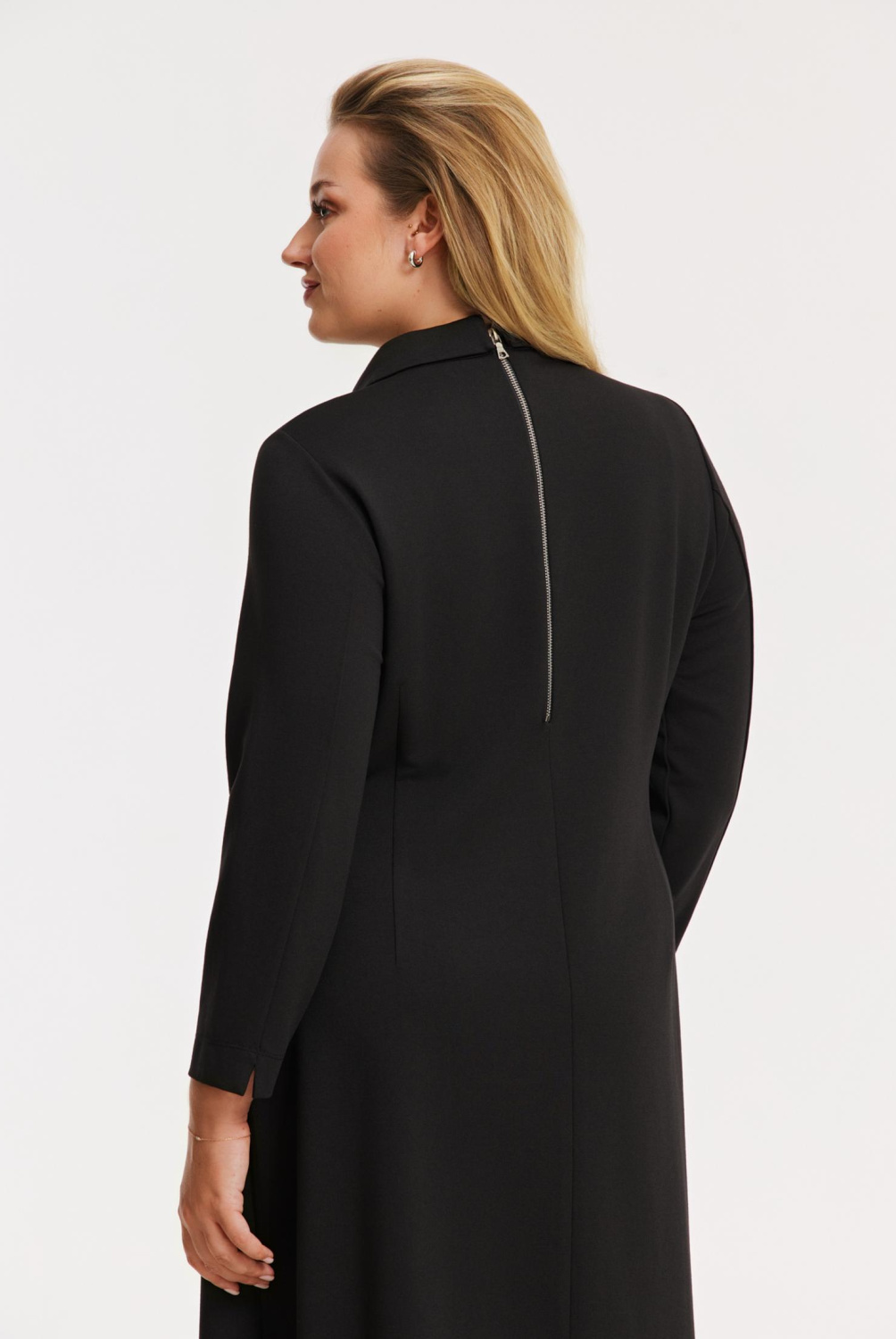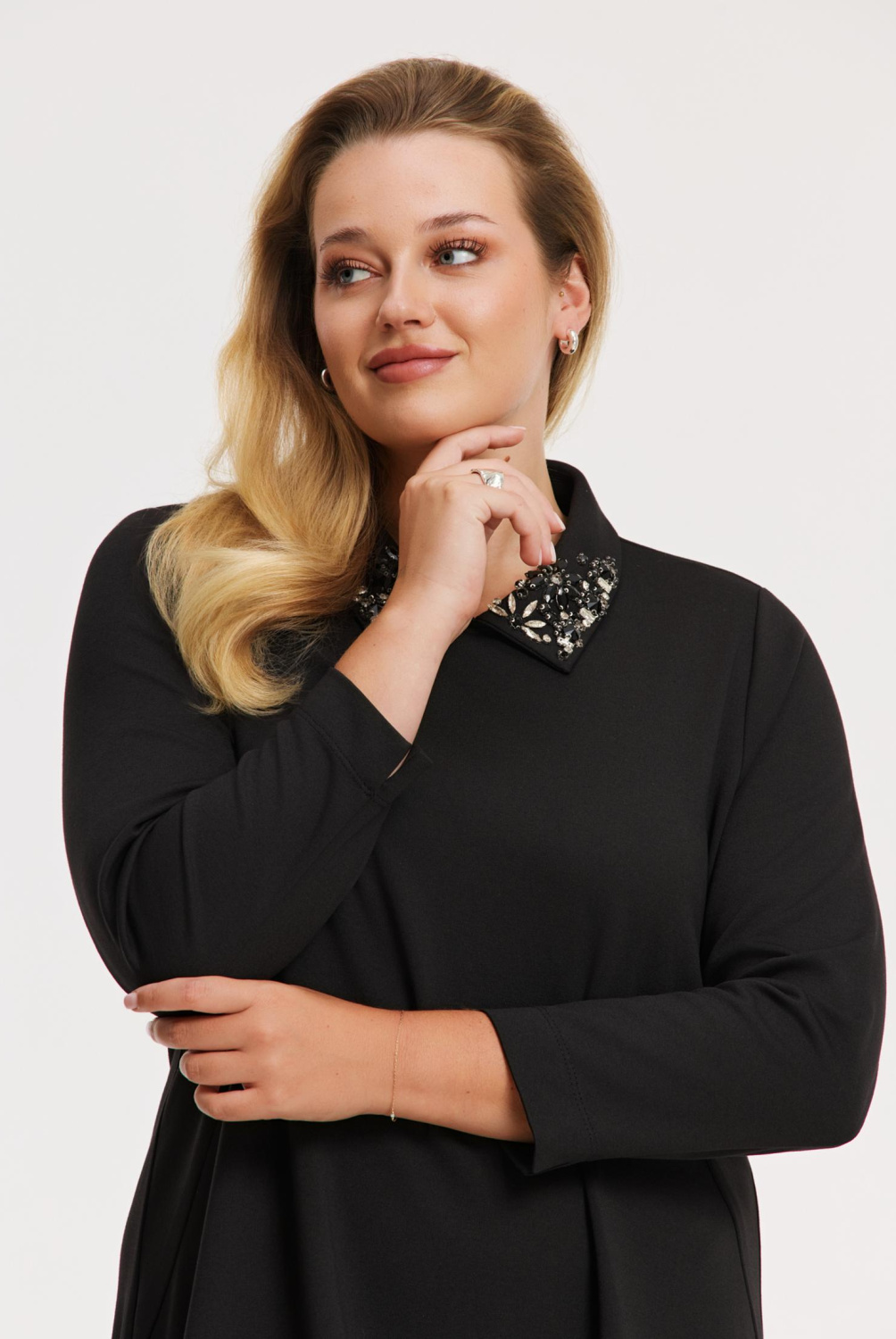 Een zwarte A-lijn jurk met een kraag versierd met fonkelende kraaltjes en stenen. De ritssluiting bij de hals geeft een moderne twist. Ontworpen met lange mouwen en een strakke snit voor tijdloze elegantie. Een veelzijdig item dat van kantoor tot avond gedragen kan worden, gemaakt van de ietwat stevigere Vero stof.