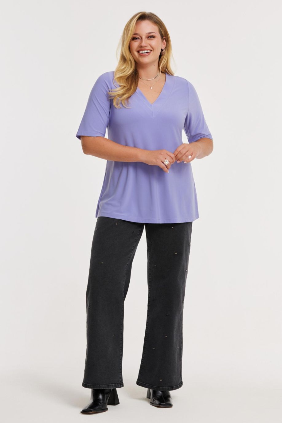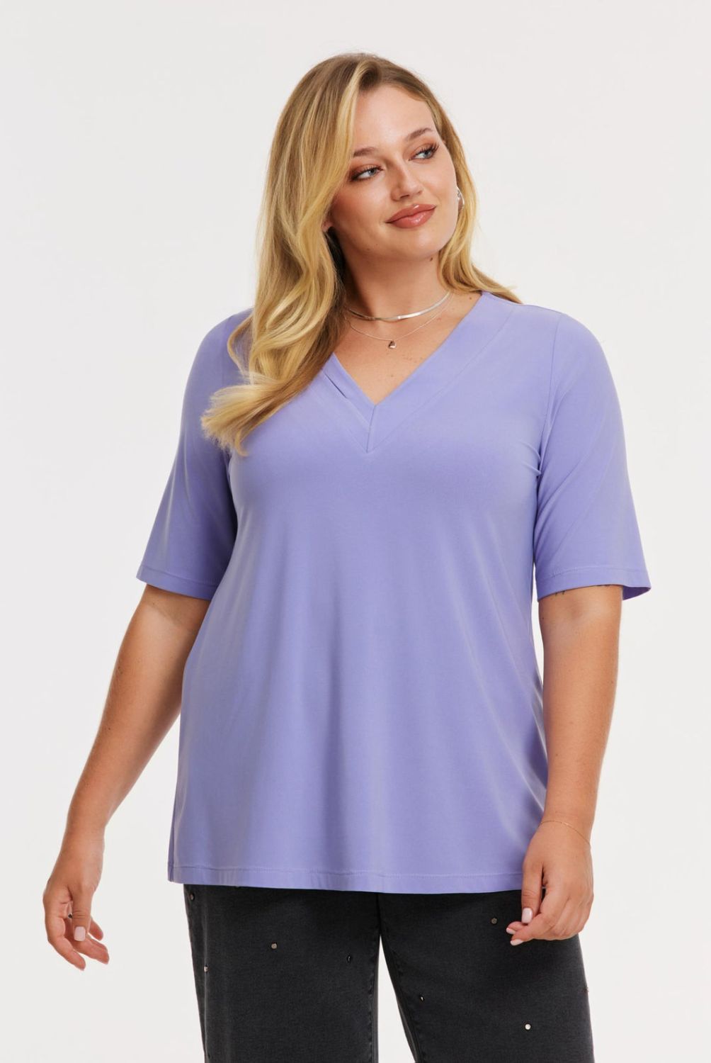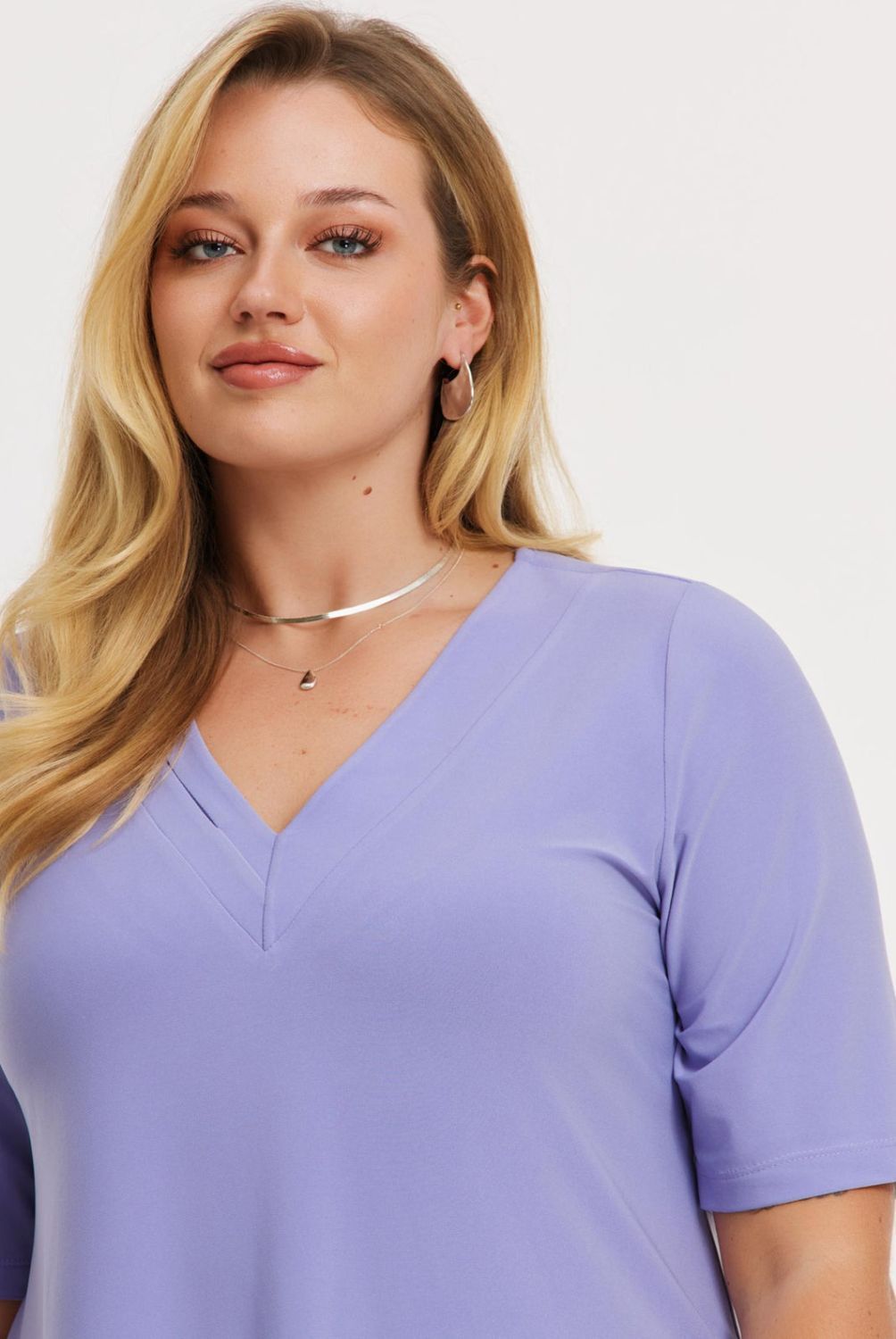 Een veelzijdige top met een strakke V-hals en korte mouwen, ontworpen voor dagelijks draagcomfort. De A-lijn snit zorgt voor een flatterend effect. Gemaakt van een zachte stof die soepel valt. Makkelijk te combineren met zowel casual als geklede looks.