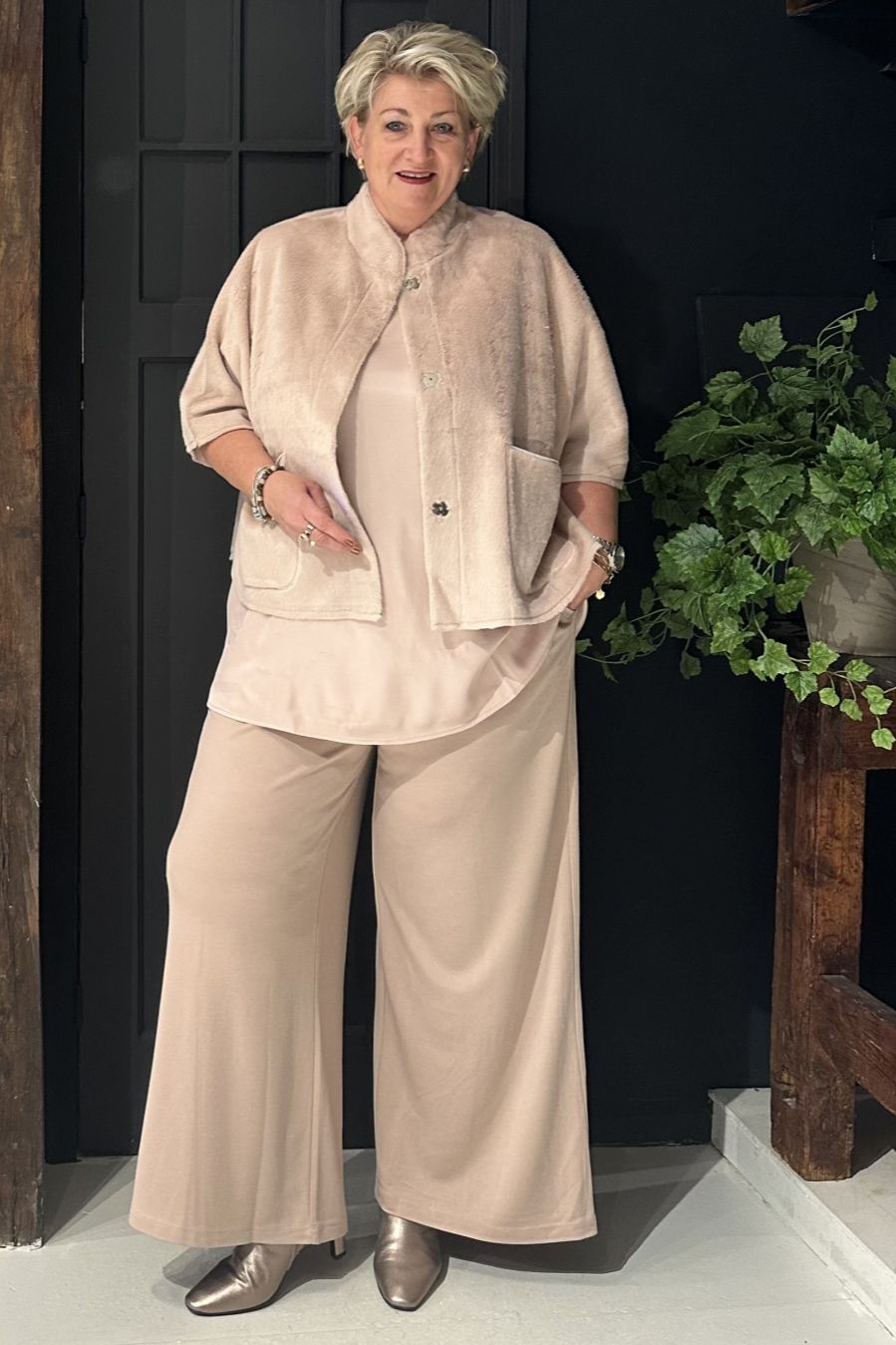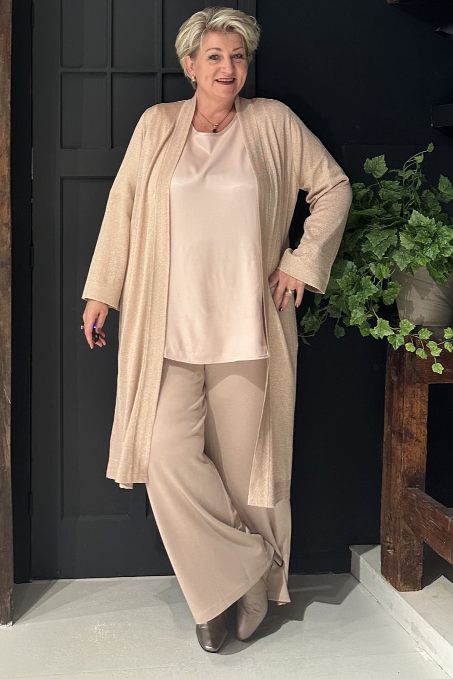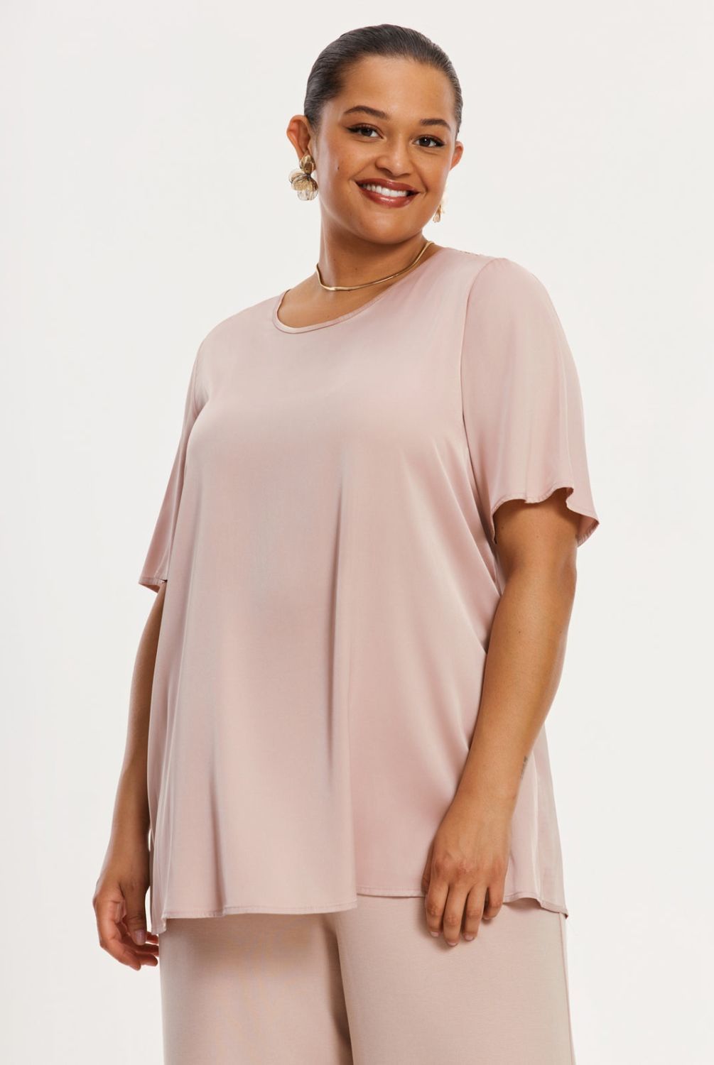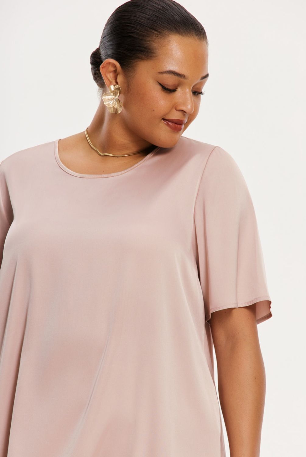 Deze prachtige top, uitgevoerd in een zachte poedertint en gerecycled materiaal heeft een prachtige, satijnachtige glans. De luxe top met wijde pasvorm heeft korte mouwen en dient als de perfecte basis voor bijvoorbeeld een vrouwelijke business look. Maar ook enorm goed te mixen en matchen met de andere items in deze tint uit onze Midnight Soirée collectie, voor al jouw feestelijke outfits!