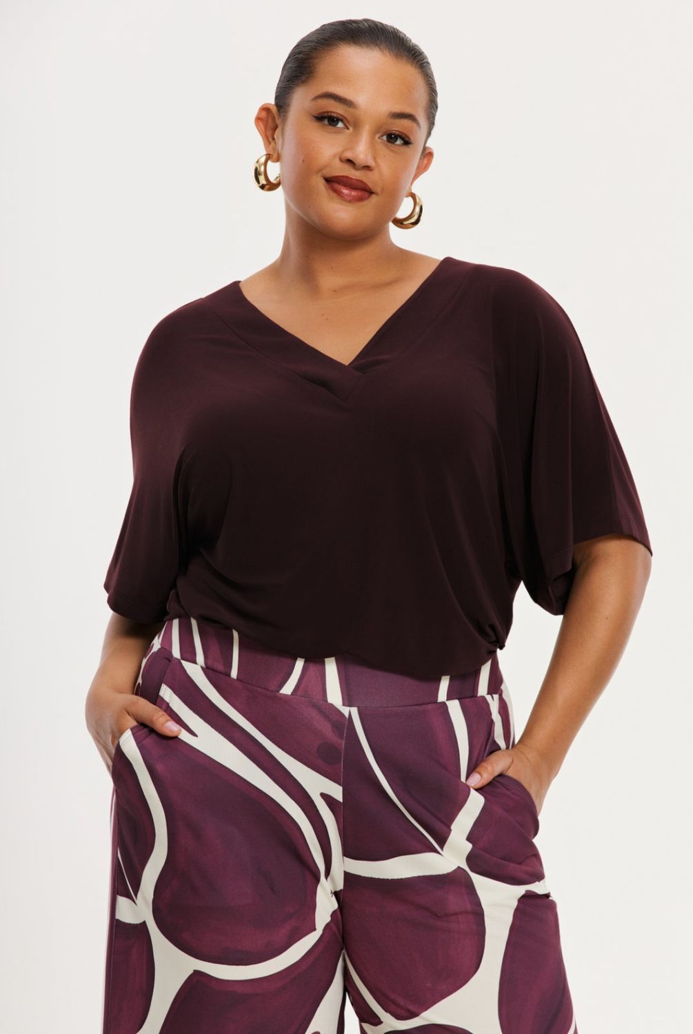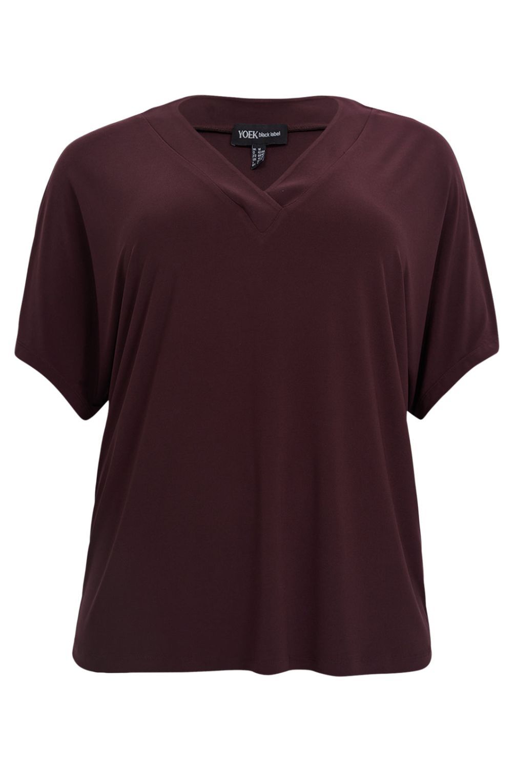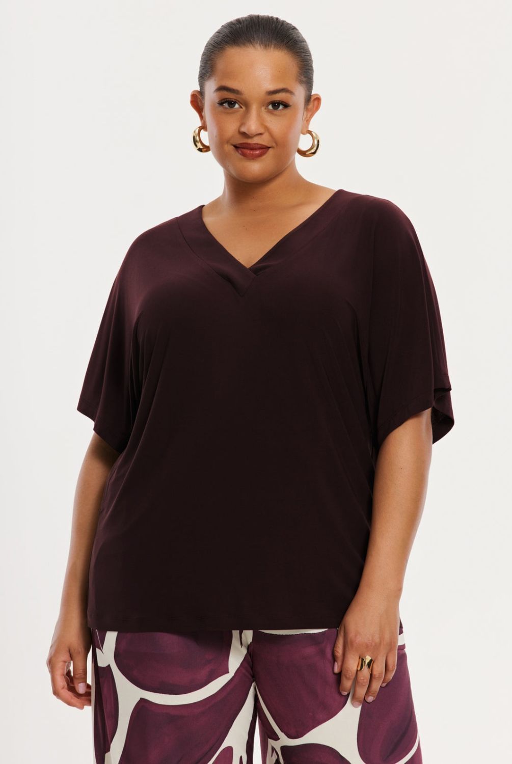 Naast statement styles, zijn fijne basics ook goed om te hebben! Verrijk je garderobe met dit elegante T-shirt in een warme bordeaux tint. Het model is vervaardigd van ons recycled dolce materiaal: zacht, soepel en duurzaam comfortabel. Met V-hals en een wijde pasvorm, perfect te combineren met een geprinte broek of een uni look—casual én chic.