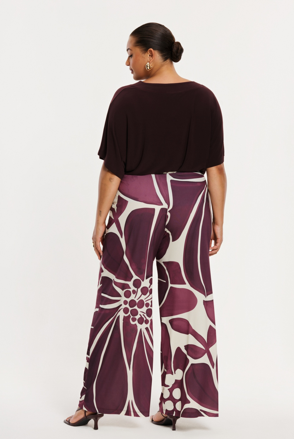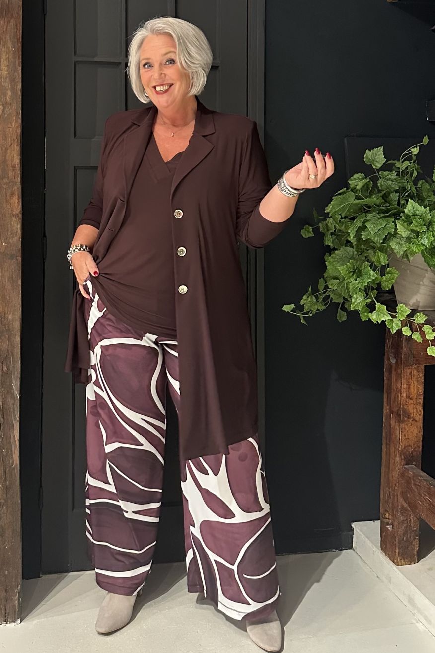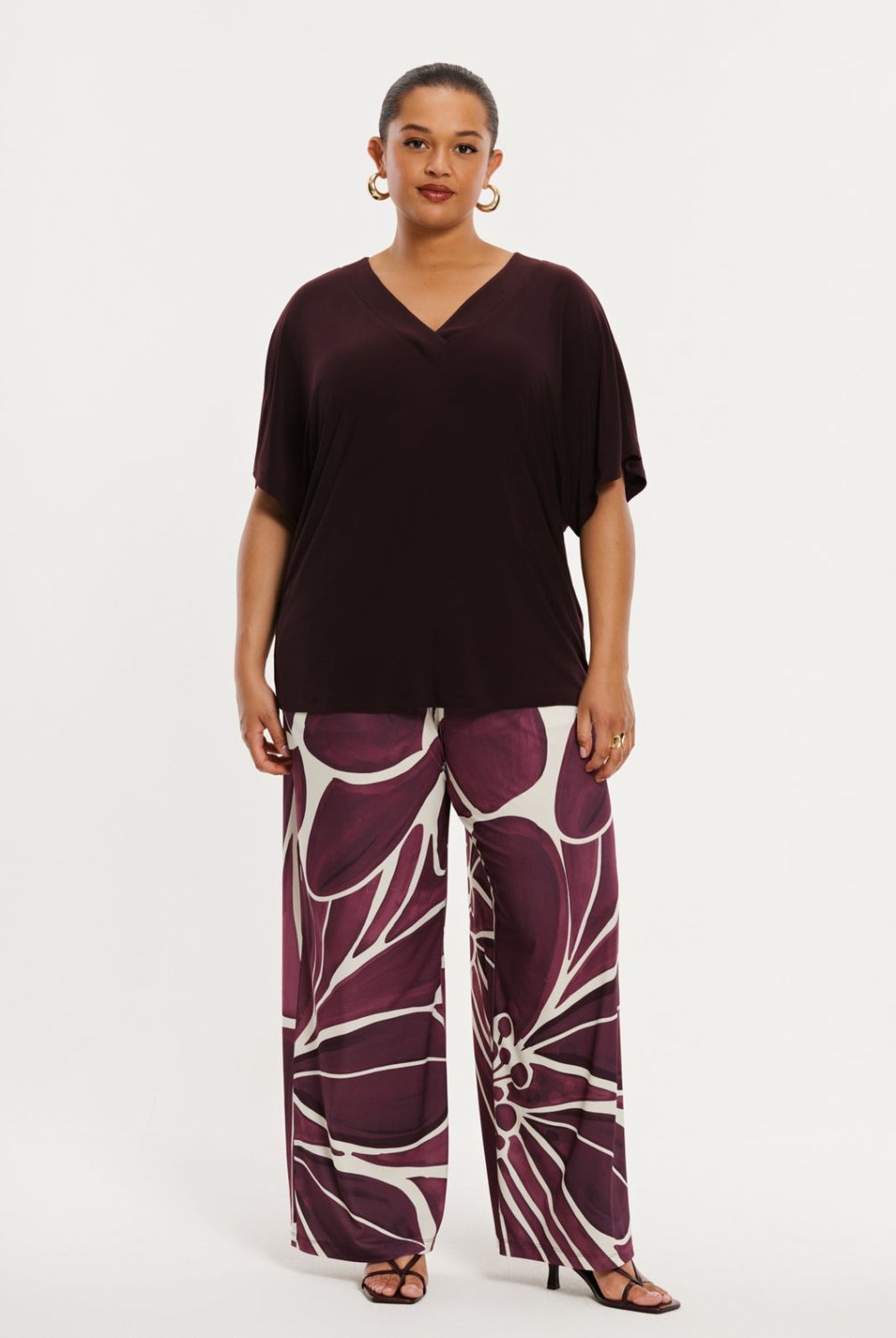 Naast statement styles, zijn fijne basics ook goed om te hebben! Verrijk je garderobe met dit elegante T-shirt in een warme bordeaux tint. Het model is vervaardigd van ons recycled dolce materiaal: zacht, soepel en duurzaam comfortabel. Met V-hals en een wijde pasvorm, perfect te combineren met een geprinte broek of een uni look—casual én chic.