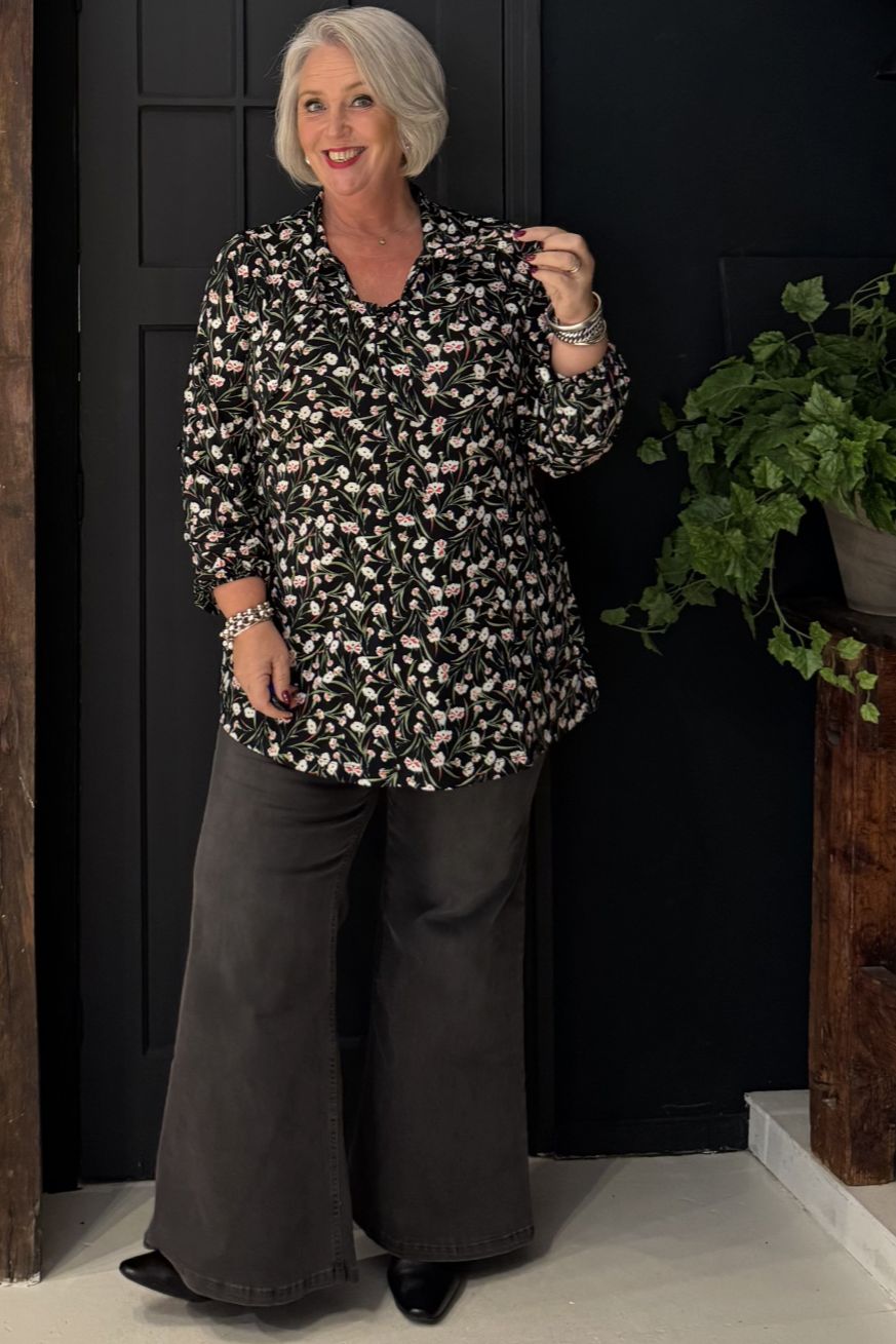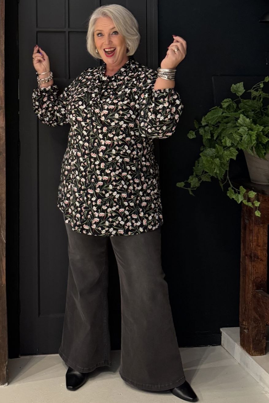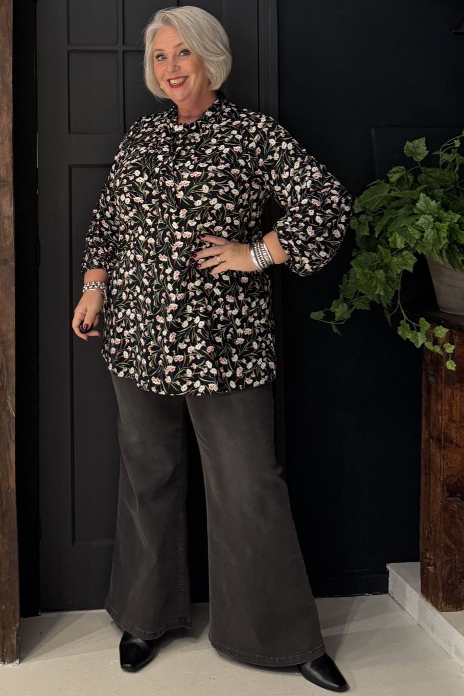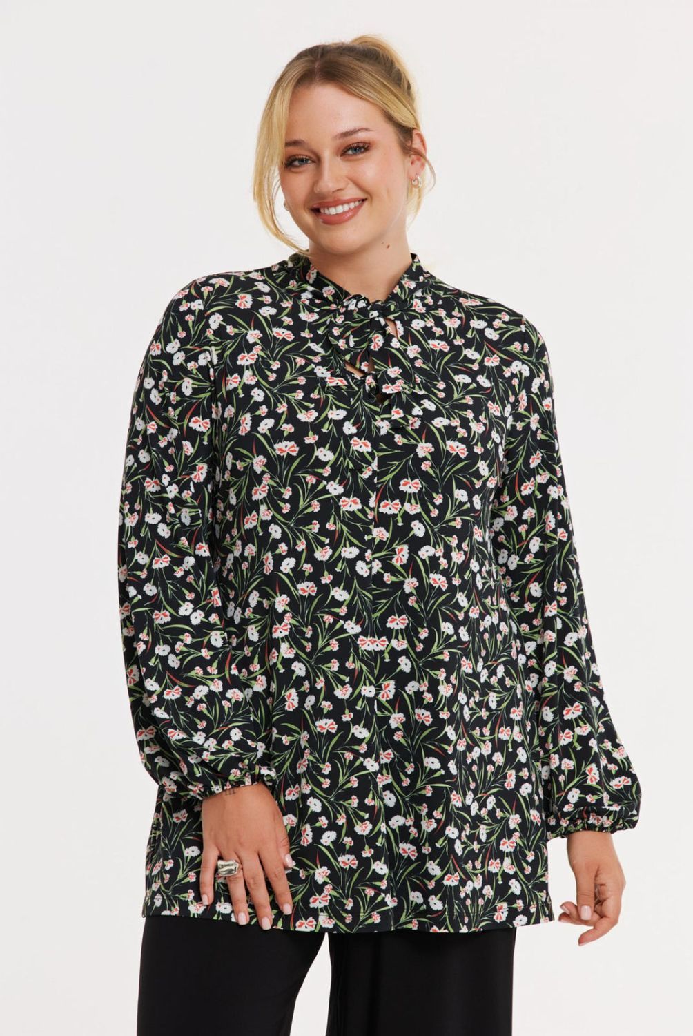 Deze stijlvolle tuniek, gemaakt van het comfortabele dolce-materiaal, is bedrukt met een charmante bloemenprint op een zwarte ondergrond. De striksluiting bij de hals geeft het ontwerp een vrouwelijke twist. Dankzij de bekende flare fit van YOEK valt de tuniek soepel en flatterend.
