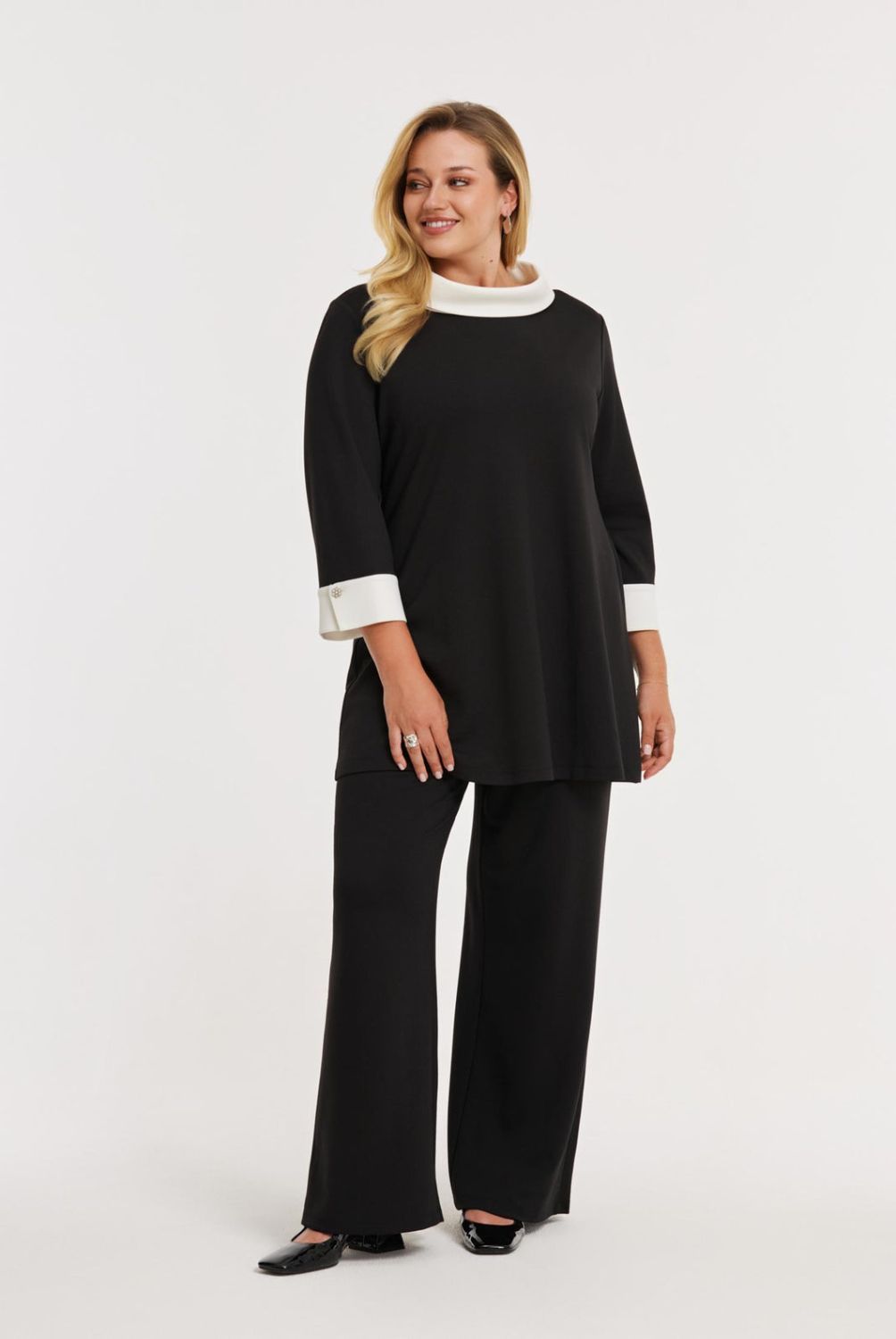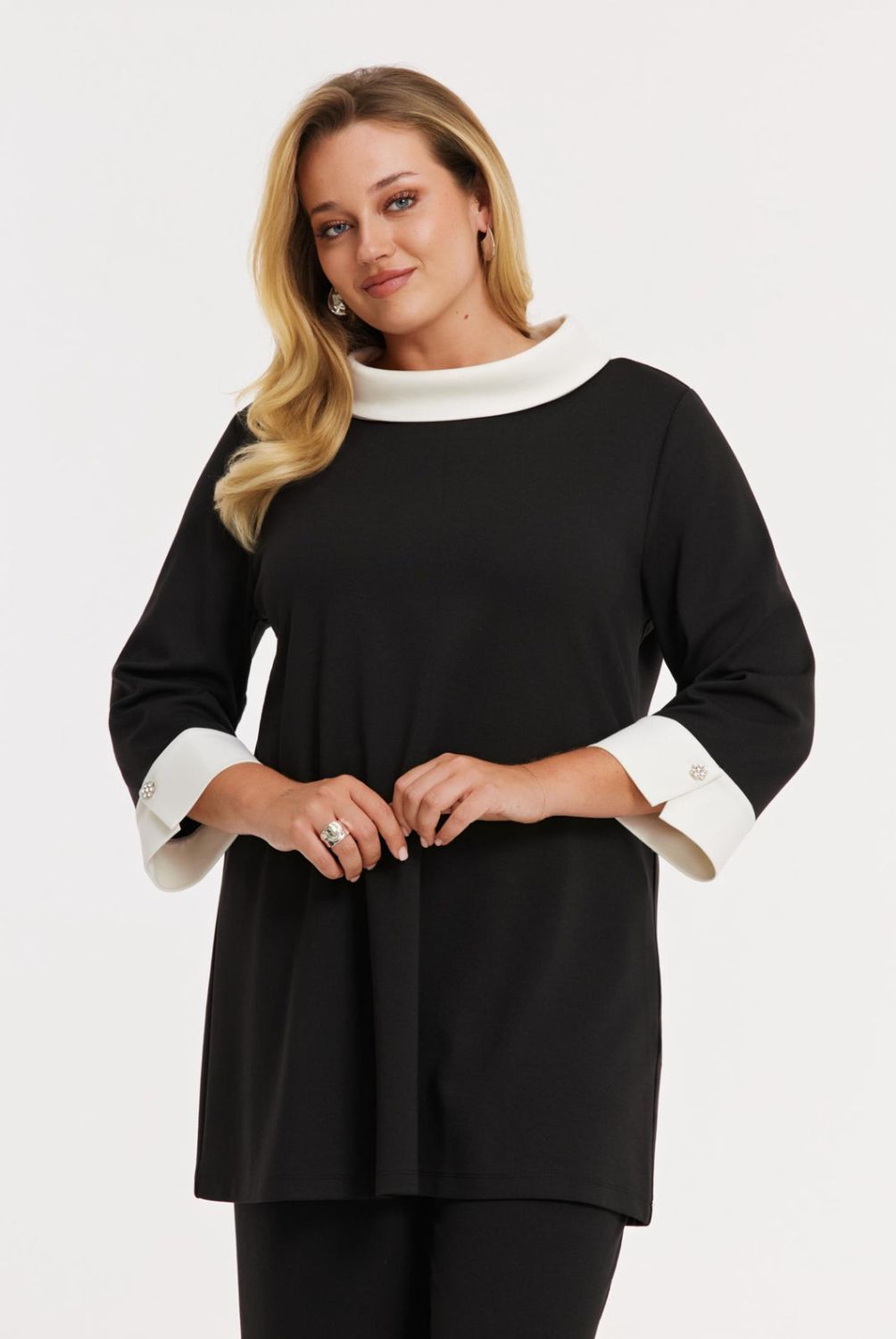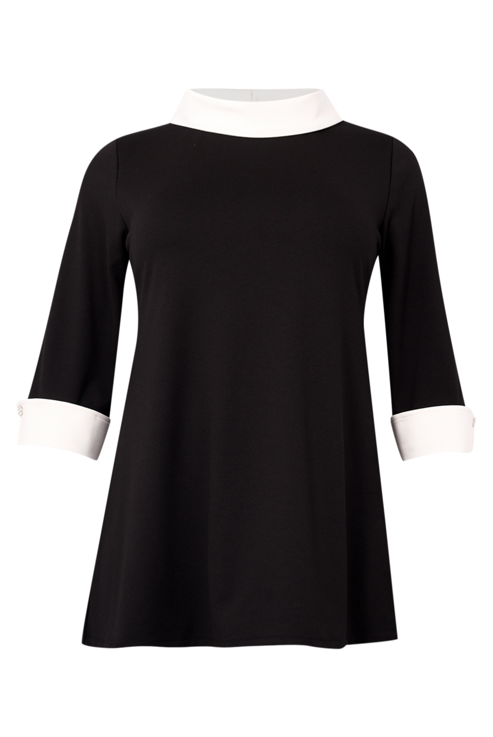 Een tuniek met een strak zwart-wit ontwerp, afgewerkt met contrasterende kraag en manchetten. De 3/4 mouwen geven de look een moderne twist. De licht uitlopende snit zorgt voor comfort en stijl. Een tijdloos item dat seizoen na seizoen gedragen kan worden. Gemaakt van de iets stevigere Vero stof.