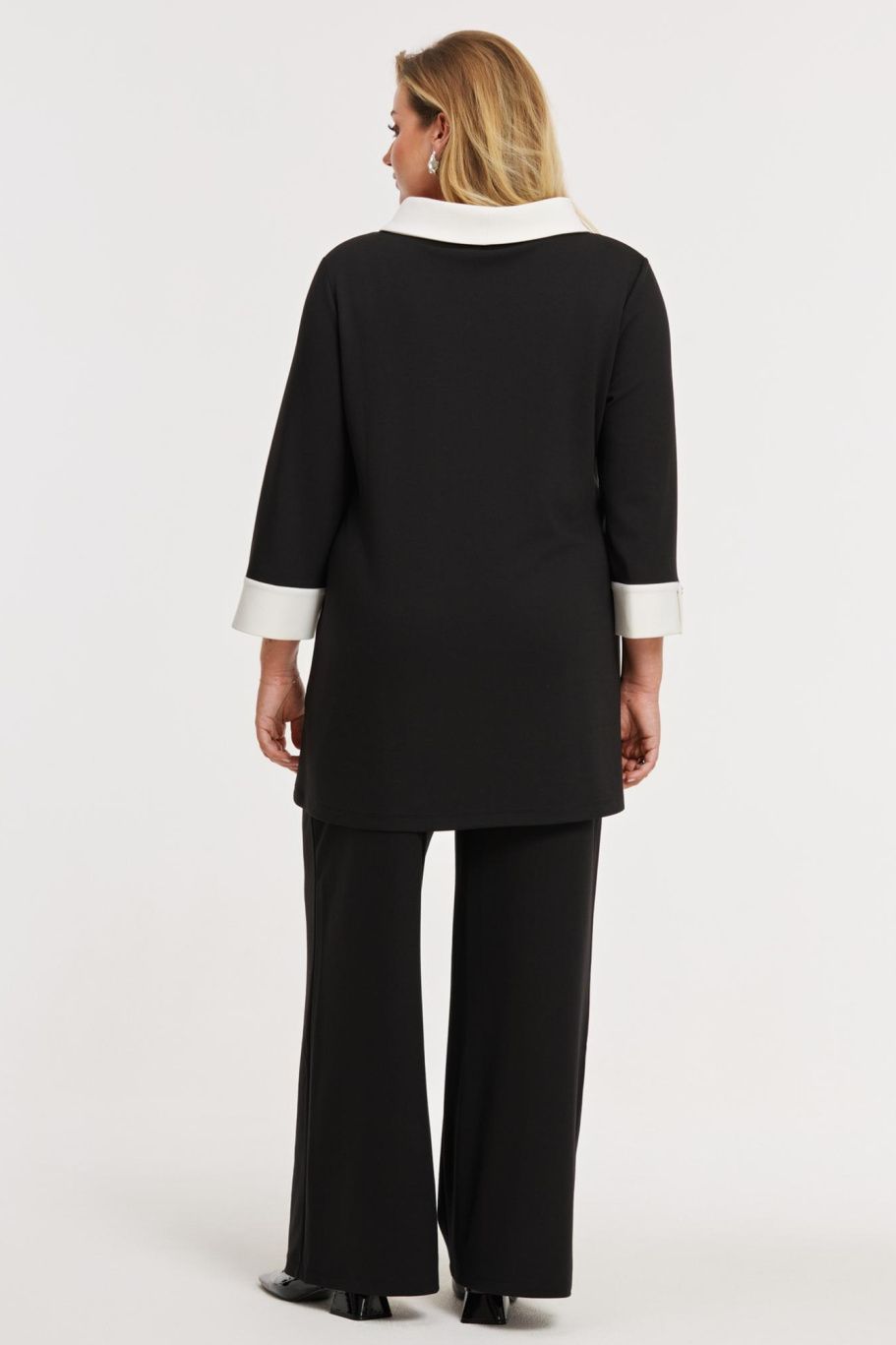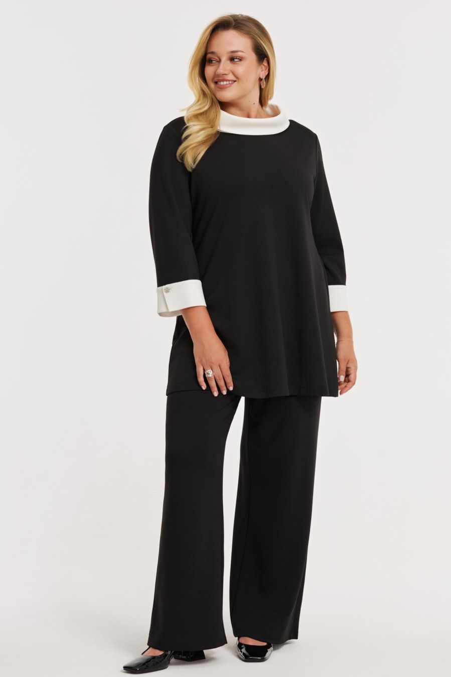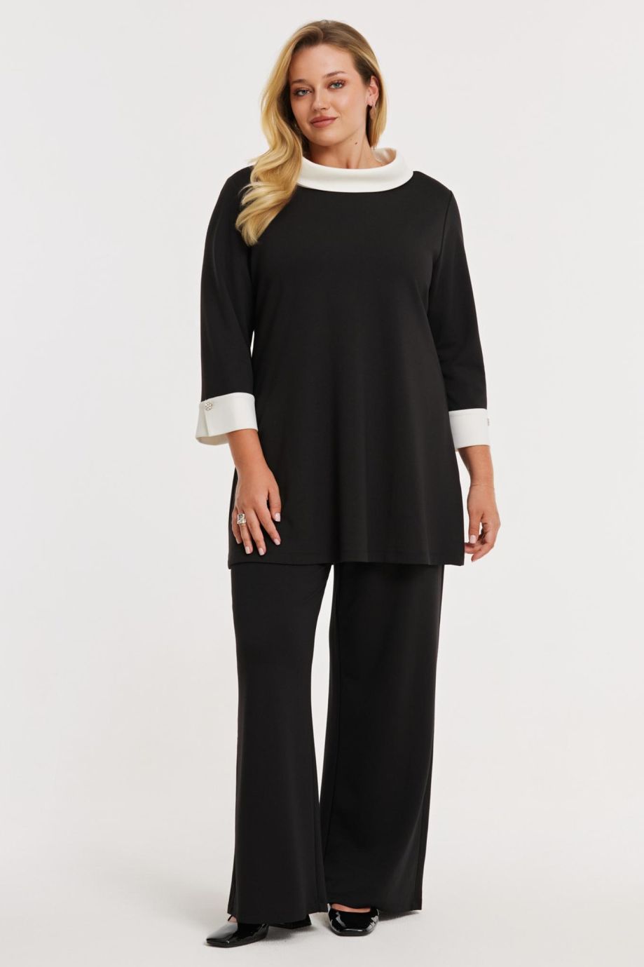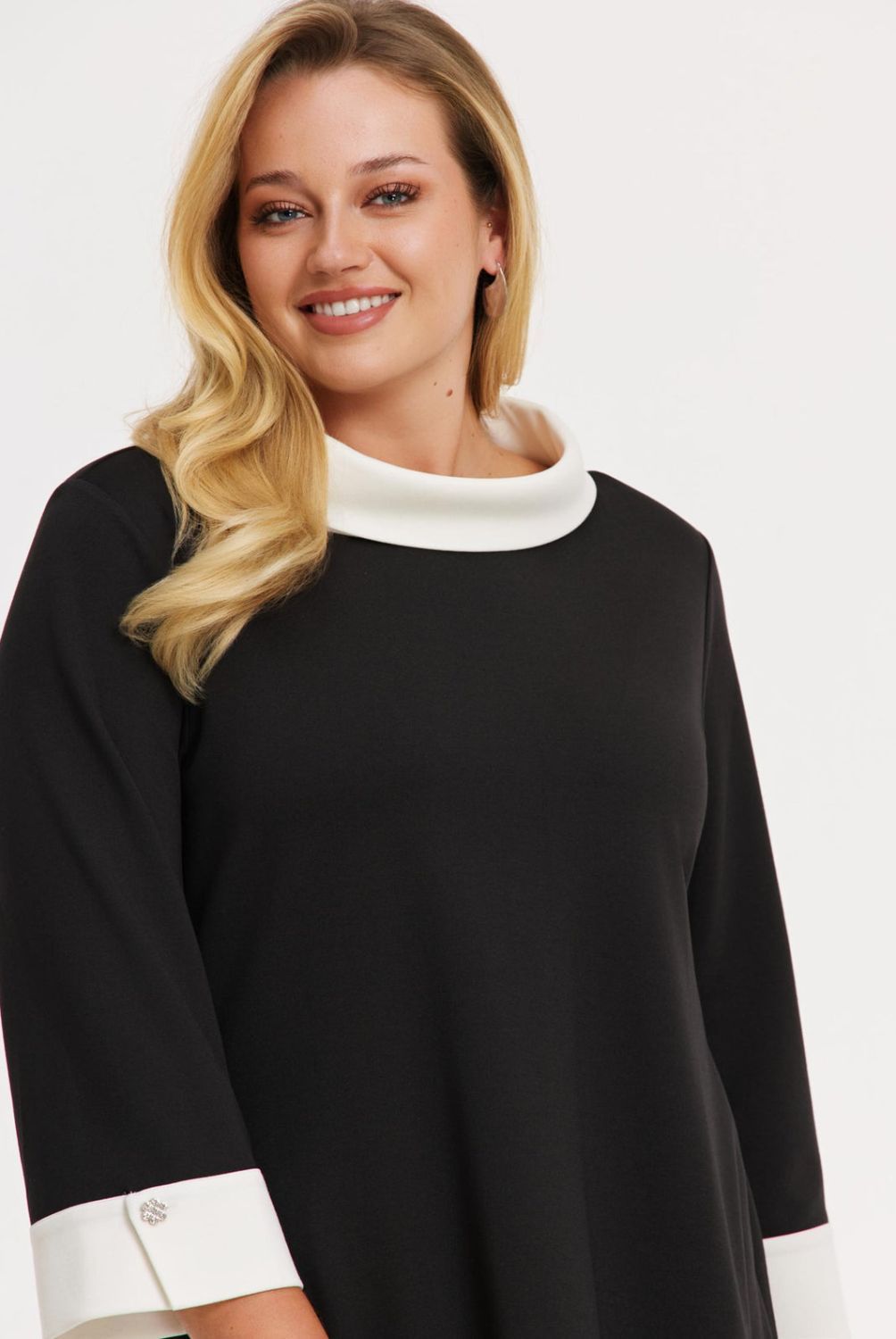 Een tuniek met een strak zwart-wit ontwerp, afgewerkt met contrasterende kraag en manchetten. De 3/4 mouwen geven de look een moderne twist. De licht uitlopende snit zorgt voor comfort en stijl. Een tijdloos item dat seizoen na seizoen gedragen kan worden. Gemaakt van de iets stevigere Vero stof.