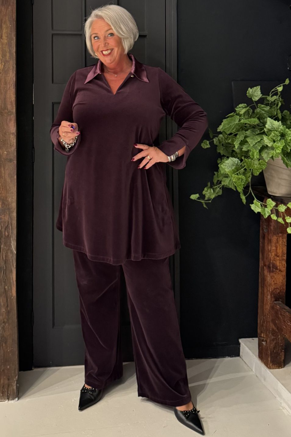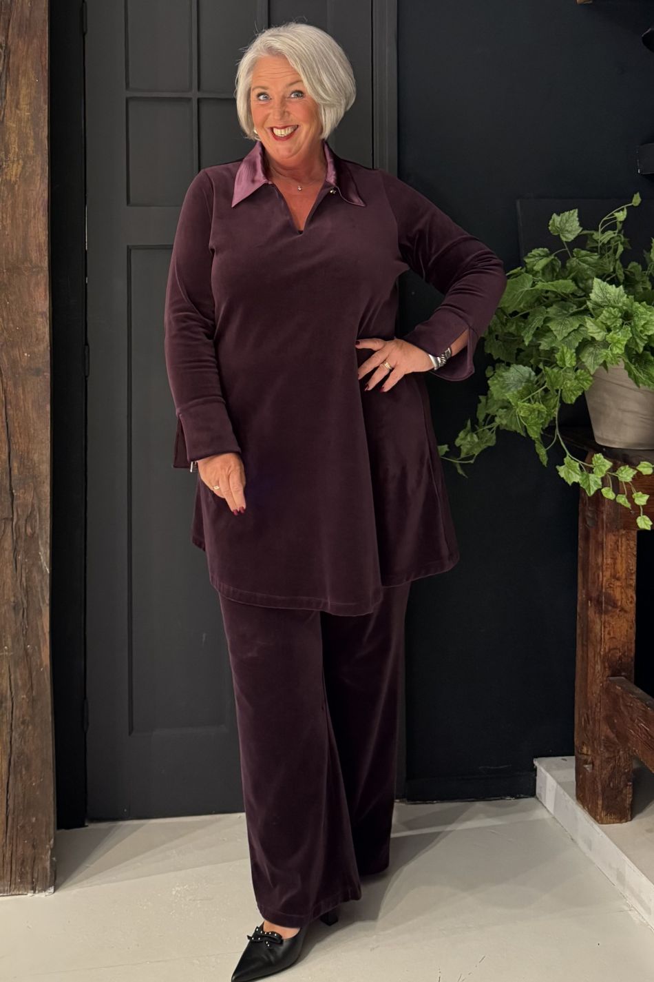 Een wide bottom tuniek van zacht velours, afgewerkt met een contrasterende glanzende kraag. De lange mouwen en de subtiele A-lijn zorgen voor comfort en elegantie. De keyhole-halslijn geeft een verfijnd accent. Een veelzijdig item dat moeiteloos van dag naar avond gedragen kan worden.