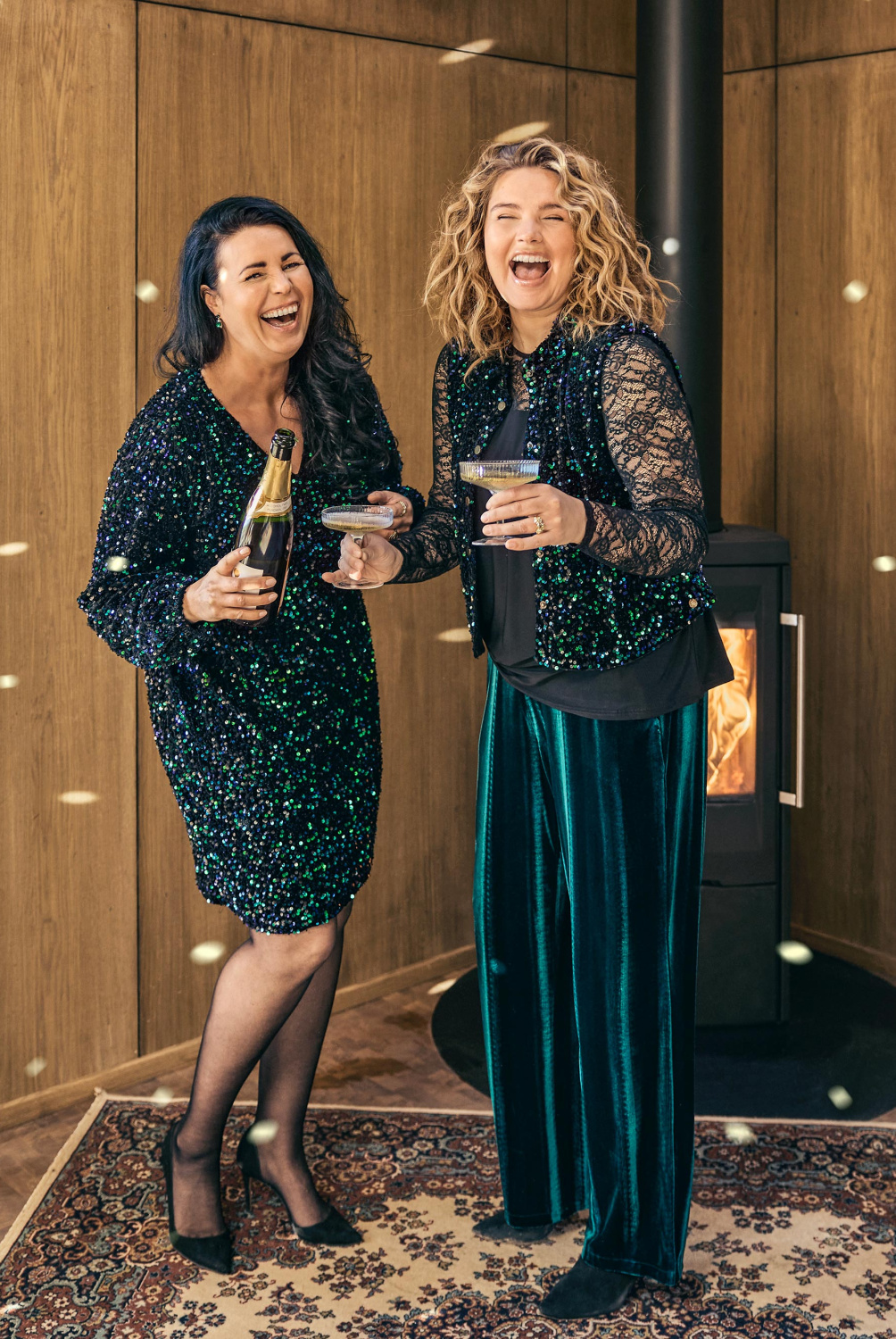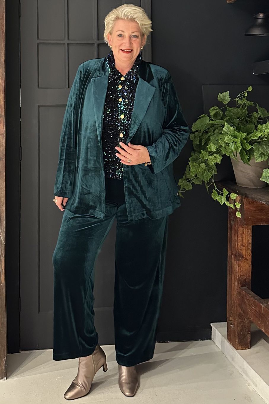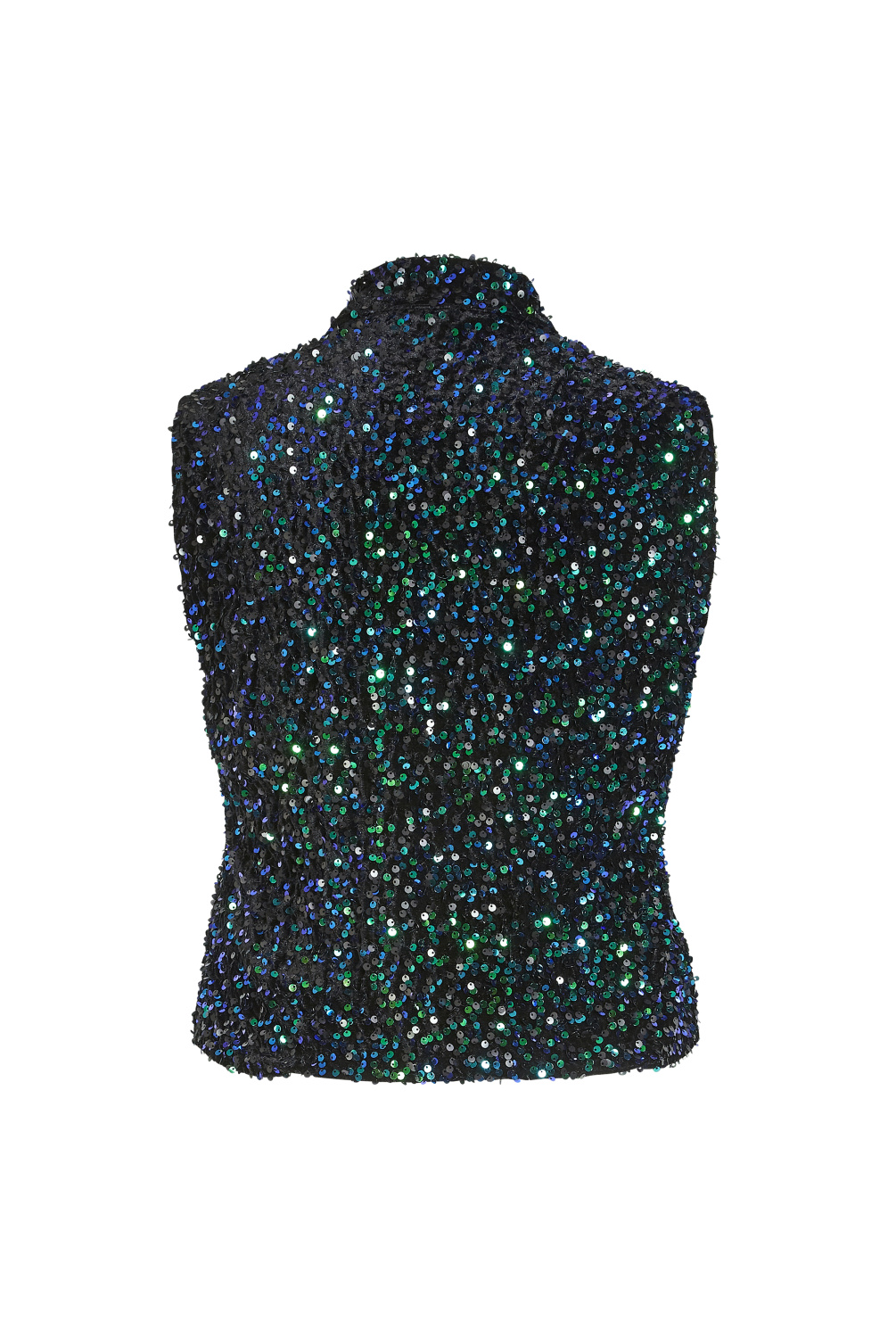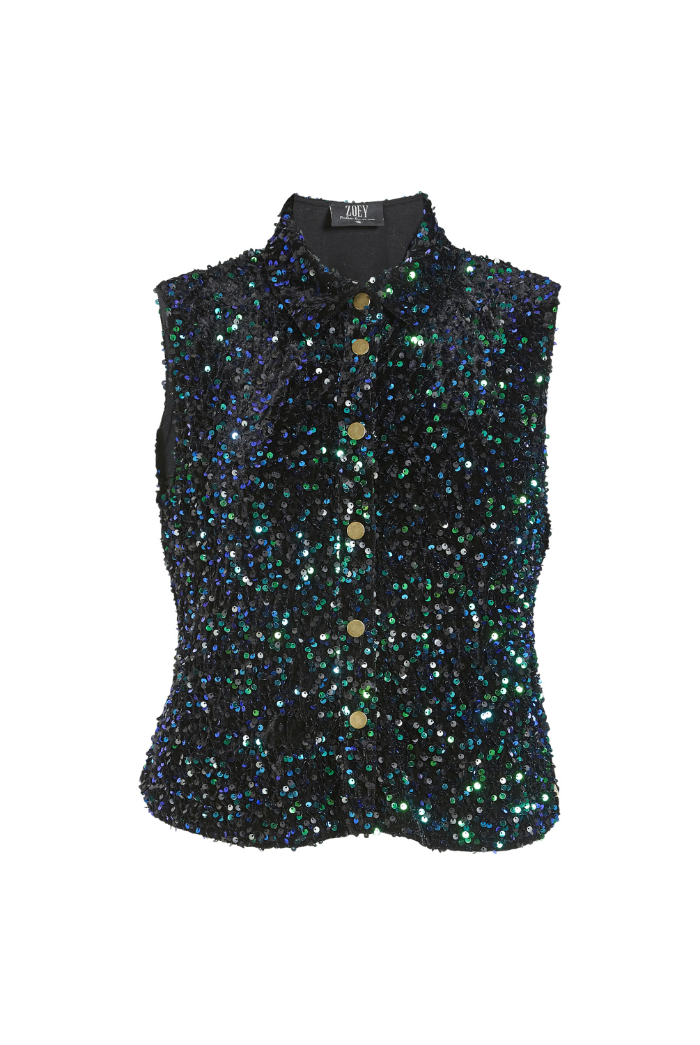 Het XENA-vest is een statementstuk dat klassiek design combineert met een feestelijke twist. Het vest heeft een traditionele kraag, drukknoopsluiting aan de voorkant en is versierd met pailletten, wat een elegante glitter toevoegt.